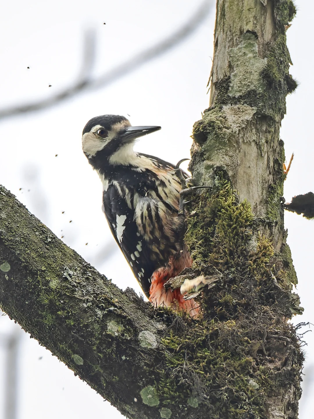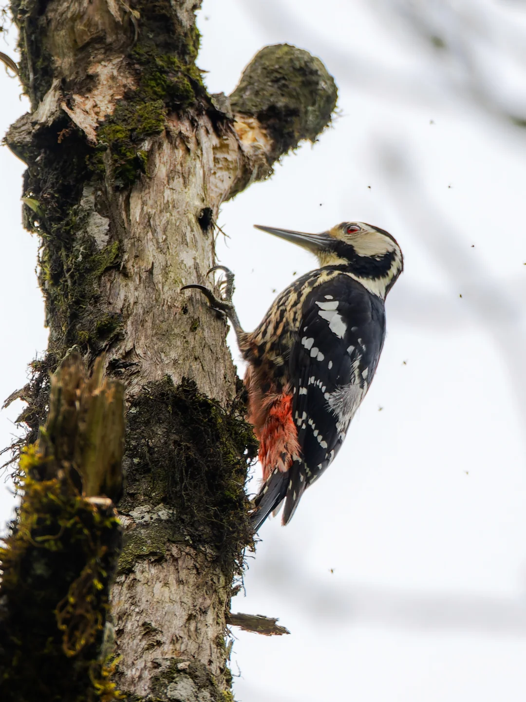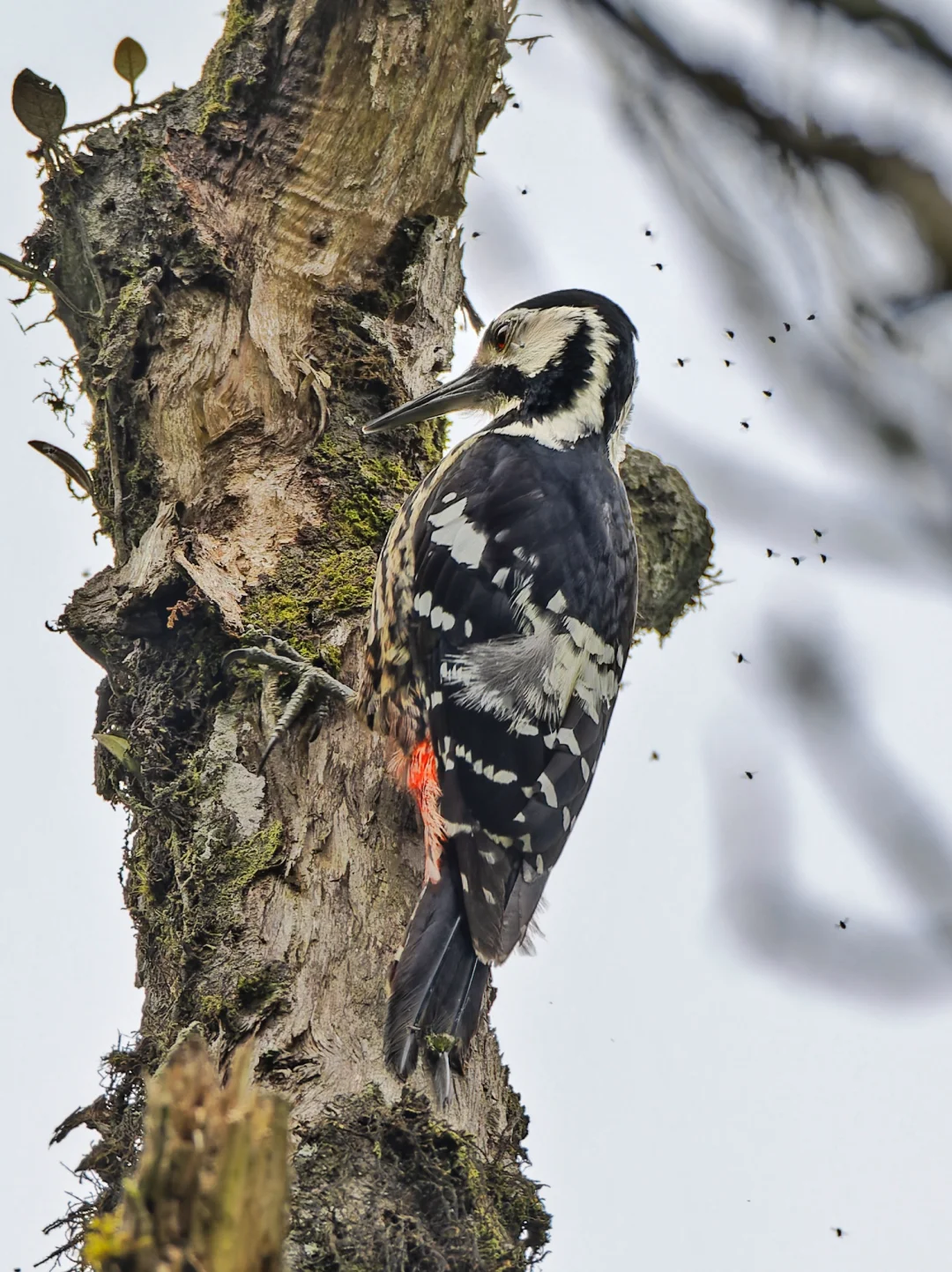 这只白背啄木鸟,一直被一群小飞虫骚扰,简直挥之不去,甚至停在它眼睛上,看来吃虫的啄木鸟也会被蚊虫叮咬。龙苍沟的啄木鸟其实挺活跃的,这次看到白背和赤胸,高海拔地区雾实在是太大,没看到黄颈。