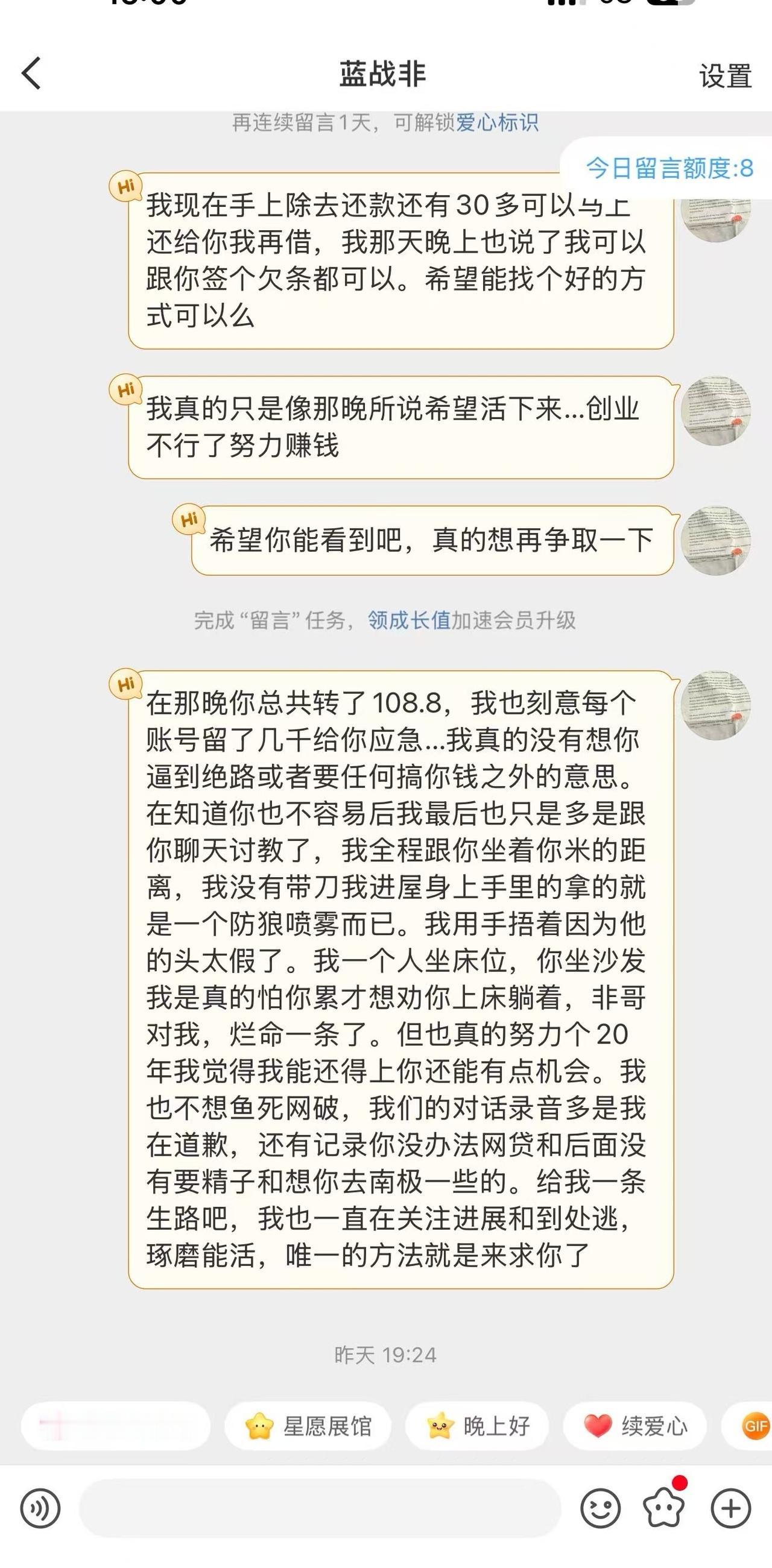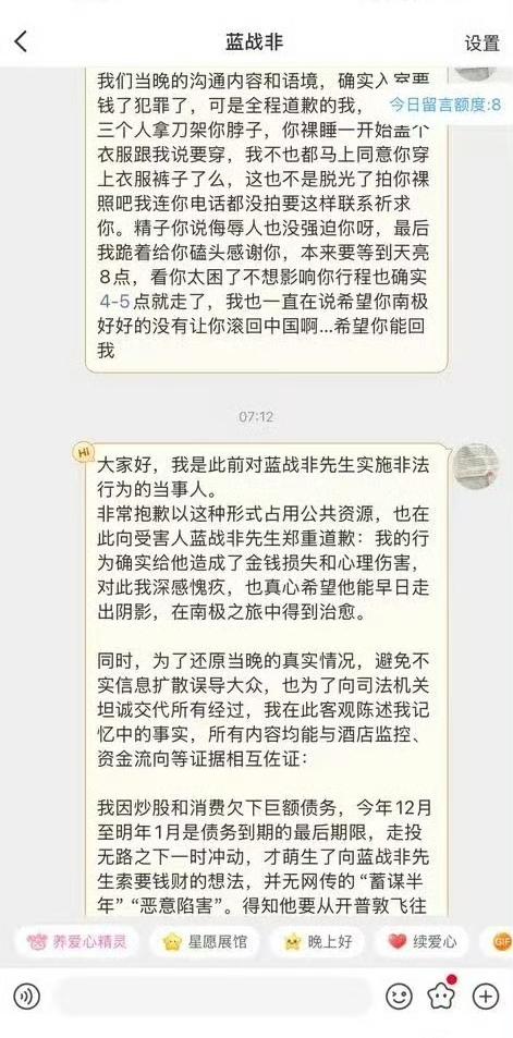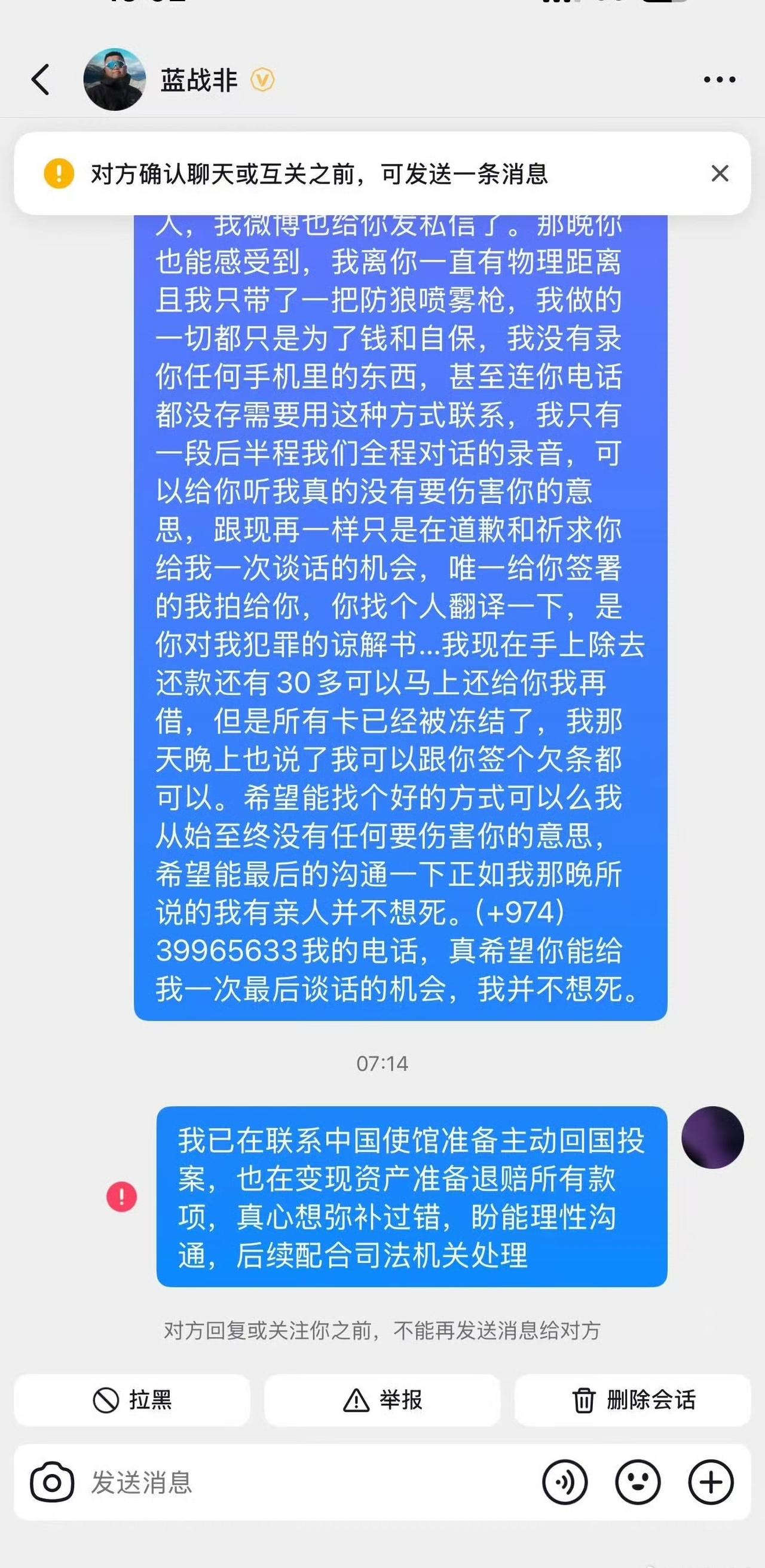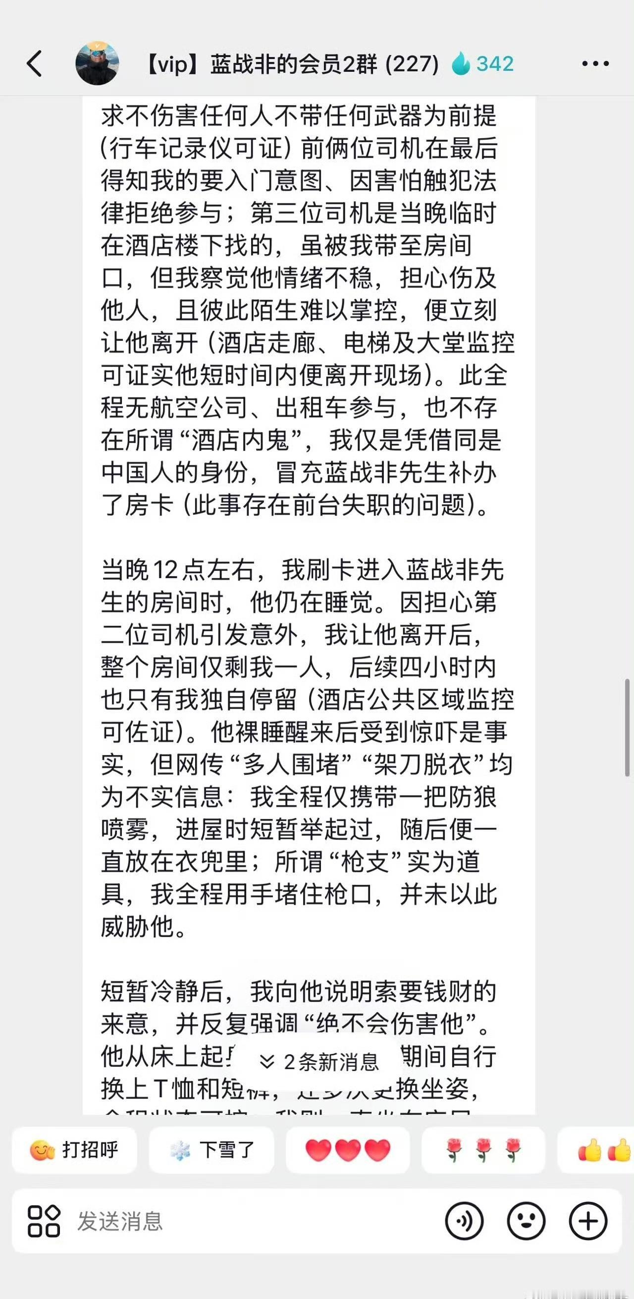 蓝战非绑架勒索案反转了? 一个自称是蓝战非案犯的人描述作案经过,跟蓝战非的描述有很大出入。 1、蓝战非说提前半年精心谋划,买通航空公司、酒店人员,这个人说只是临时起意,前一天才开始行动,没买通航空公司,也没买通酒店工作人员。 2、蓝战非说是一个中国主犯和两个当地的黑人从犯,三人一起进入他的房间,这人说只有他一个人。 3、没有酒店同谋,只是案犯冒充蓝战非去前台说门卡丢了要补卡,前台看都是中国人,没要求出示证件就给他补了。 4、蓝战非说被刀架到脖子上,这人说只带了一个防狼喷雾和一把玩具枪,并且全程和蓝战非保持一米距离。 5、没有恐吓他“八点滚回中国,否则杀了他”,反而还祝他南极行顺利。 6、只转了108万还债,逼蓝战非签的文件只有一份,就是对他的犯罪行为的“谅解书”,本打算用来事发后脱罪。 7、没有取经,纯属开玩笑提了一句,蓝战非拒绝,就没有再提,更没实施。