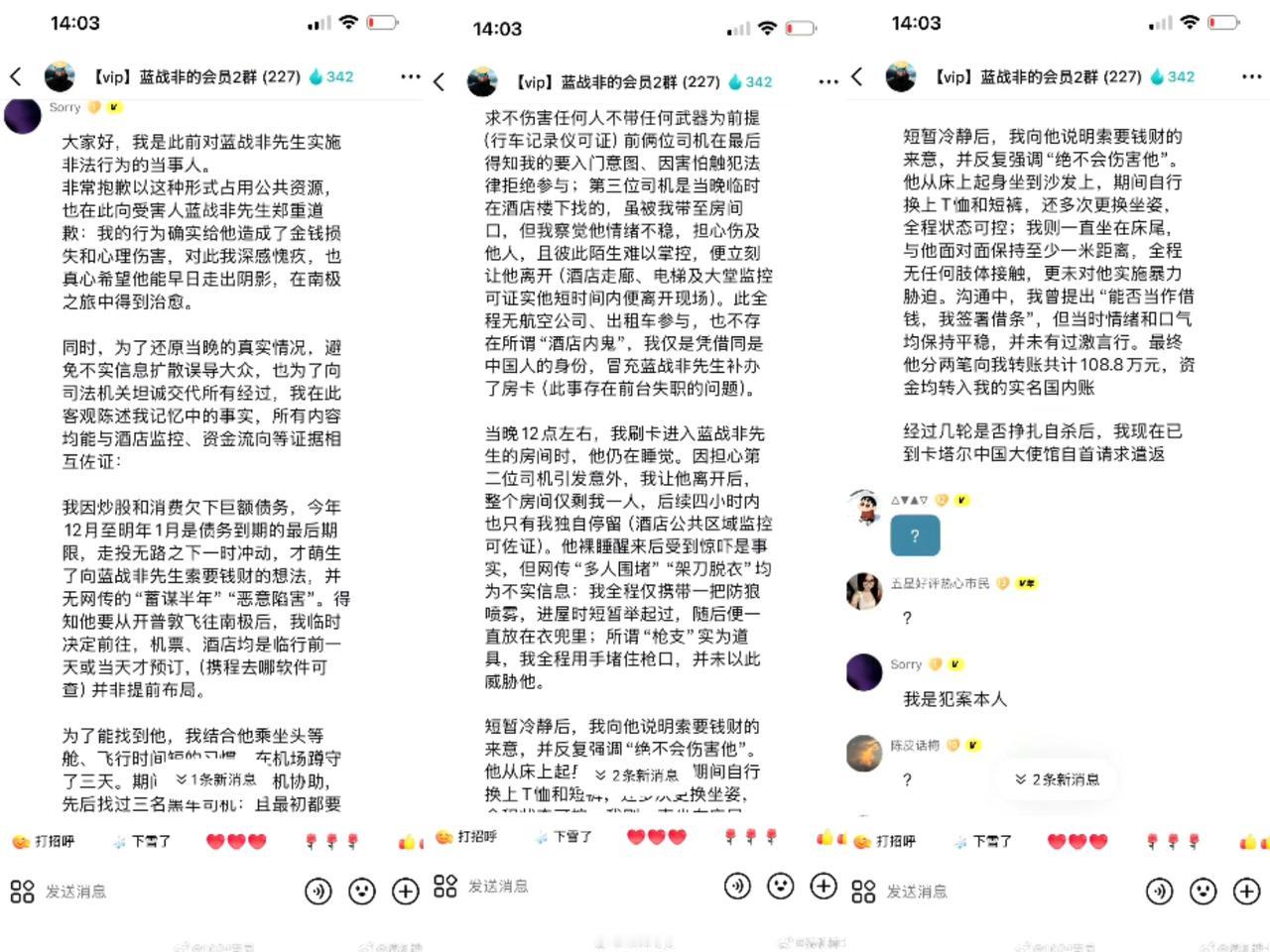 有人说蓝战非这事反转了 这算啥反转? 凶手出来自曝,二人所曝出的细节有所不同: 1.武器不是刀而是枪,尽管枪是道具但蓝战非这时不可能赌真假 2.没有提前半年谋划,而是提前几天 3.没有买通酒店工作人员,而是冒充他补办房卡。房间内没有歹徒的两位黑人同伴,在进门前就把他们陆续支走了 4.也没有收集他的口水、指纹、DNA、拍裸照 说这些有啥用吗?没用,该惩罚的依旧会惩罚,没跑了