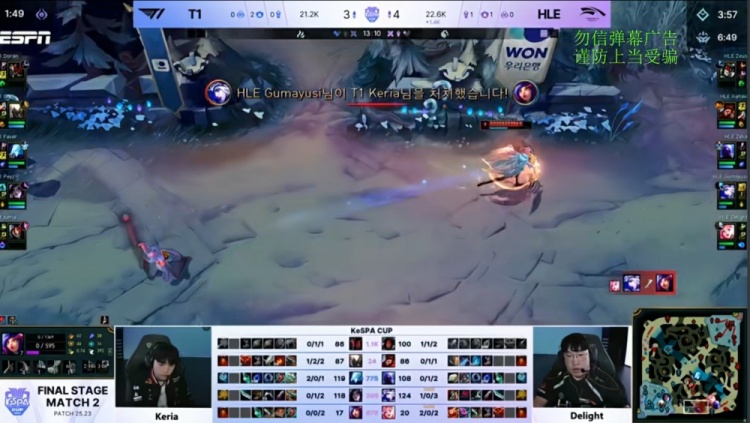[22:48]小龙团,Keria妮蔻开HLE两人,delight被多兰雷克塞挖掉,后排zeka瑞兹击杀Faker凤凰后被换,T1打出3换5团灭HLE,双方经济持平。