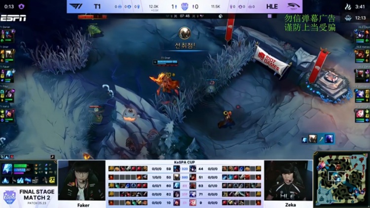 [7:46]zeka瑞兹补给回线,没闪的瑞兹压Faker凤凰站位靠前,Oner潘森自家F6跳大落地控住Zeka,轻松帮助Faker拿到一血。