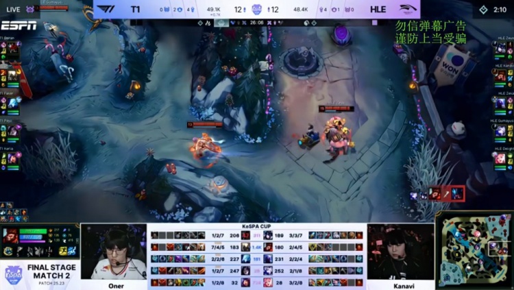 [20:35]厄塔汗团战,Kanavi猴子后方孤立无援先被T1众人秒杀,Oner抢掉厄塔汗后,Peyz卡莎击杀宙斯,Oner融化delight,T1打出0换3,推掉HLE中路一塔。