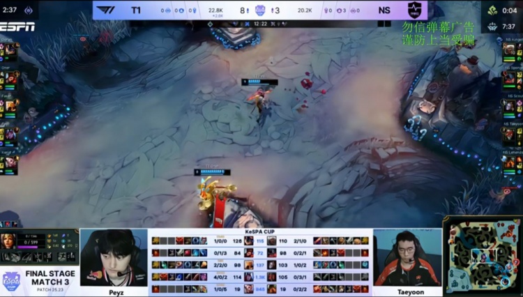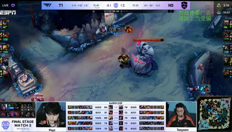 [11:25]Faker沙皇来上推回Kingen安蓓萨,联手Oner猴子将其击杀,同时下路Sponge剑魔下路被抓,Taeyoon希维尔中路再送一个,战绩来到0-3-1。
