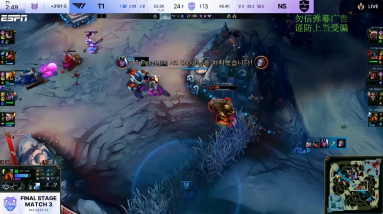 [17:05]NS开先锋撞掉T1中路一塔,经济落后2k。