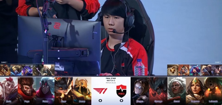 [22:41]厄塔汗团战,Lehends泰坦钩人开团但队友没有到场,Keria洛开大进场,Oner瞬间双杀,Taeyoon希维尔反手双杀,多兰补掉Scout发条,T1打出2换5团灭NS后吃掉厄塔汗,经济领先1k。