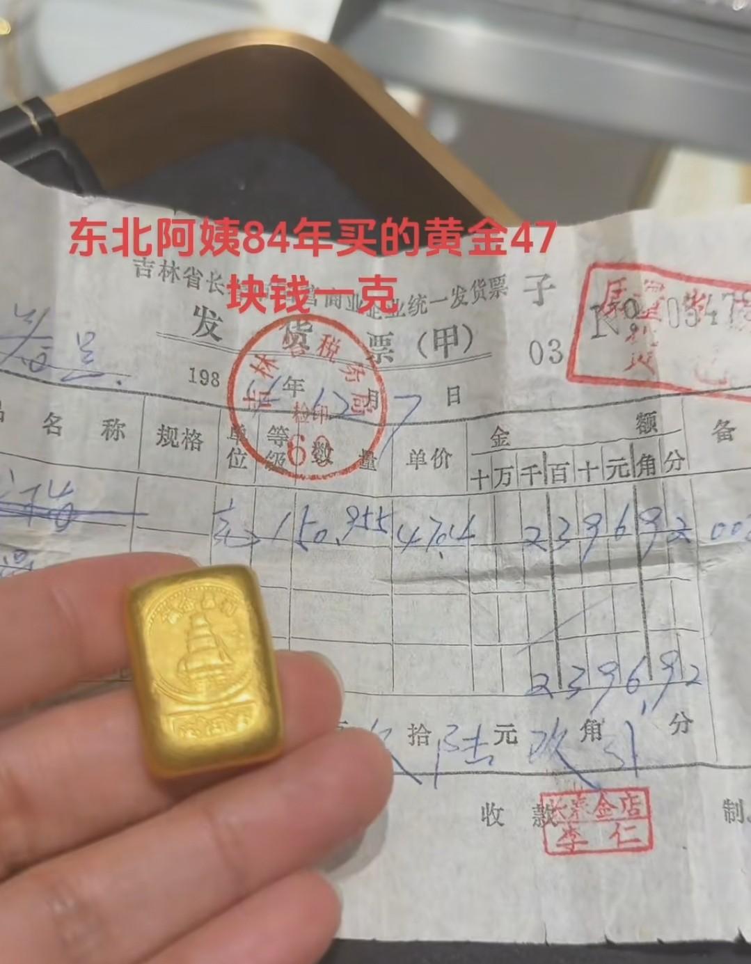 一个东北大妈最近去广东一家金店,从兜里掏出一块黄金和一张1984年的发票。发票显示,她在长春花了2396块钱买了50克多黄金,当时金价47块一克。现在同样黄金能卖五十多万,价格翻了二十多倍。 这是80年代普通人收入的四倍多,那时候一般人家一年赚不到五千。大妈当时能买这么贵的黄金,说明家里条件不错。现在人们拿同样的钱,只能买十分之一的黄金。 这张发票上写的数字,现在看着普通,但背后藏着三十年的物价变化。大妈为啥存了这么久的黄金?这钱到底从哪来?发票是真的吗?可能这辈子都找不到答案了。