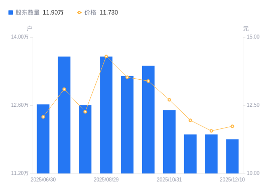 日期A股户数(户)流通A股户均持股数(股)户均持股市值(万元)2025-12-1011900019362.2322.712025-11-2812000019200.8822.202025-11-2012000019200.8822.952025-10-3112500018432.8423.412025-09-3013412617178.6623.002025-09-1913200017455.3523.622025-08-2913600016941.9524.212025-07-3112600018286.5522.422025-07-1013600016941.9522.182025-06-3012617318261.4822.05