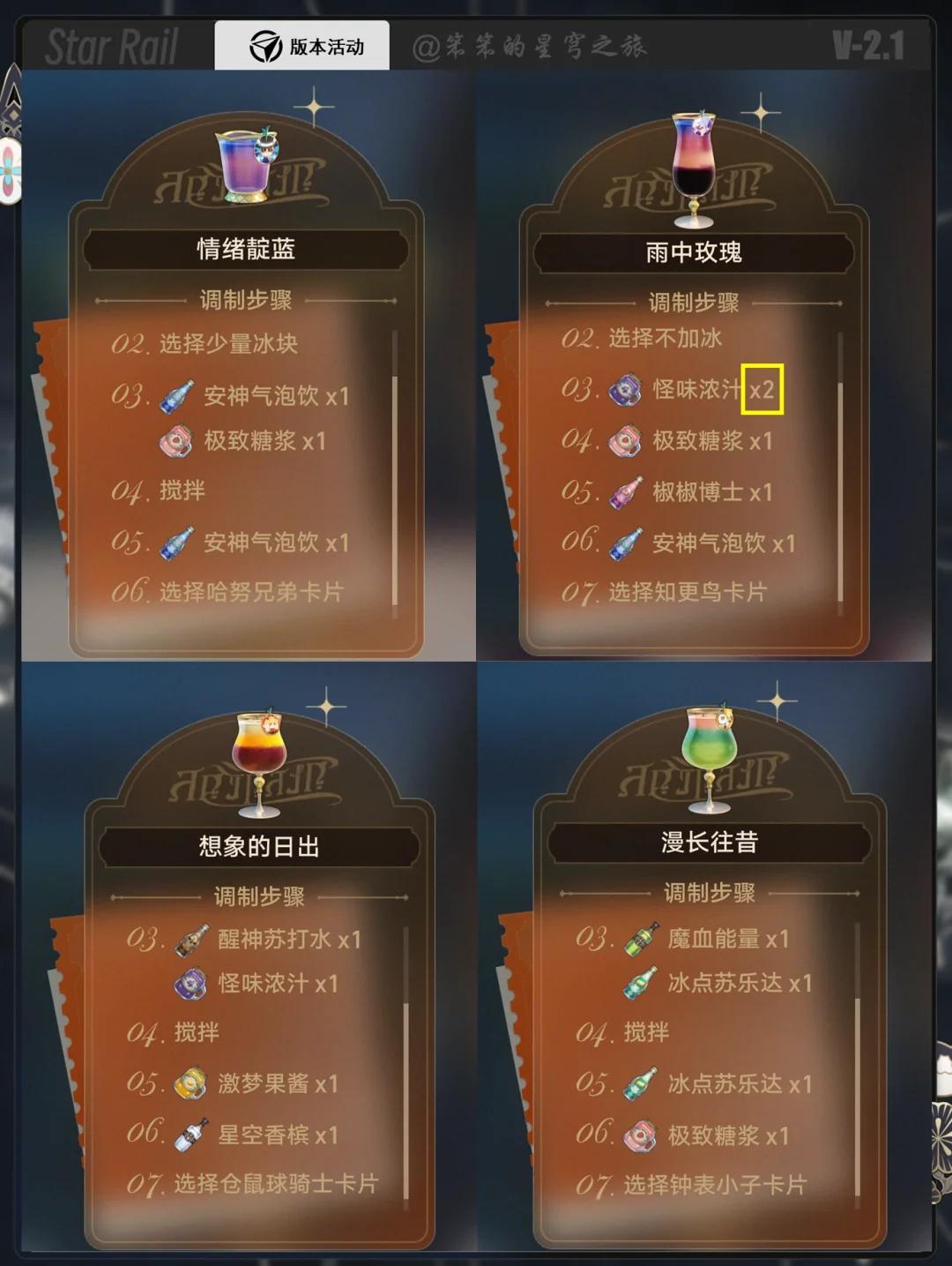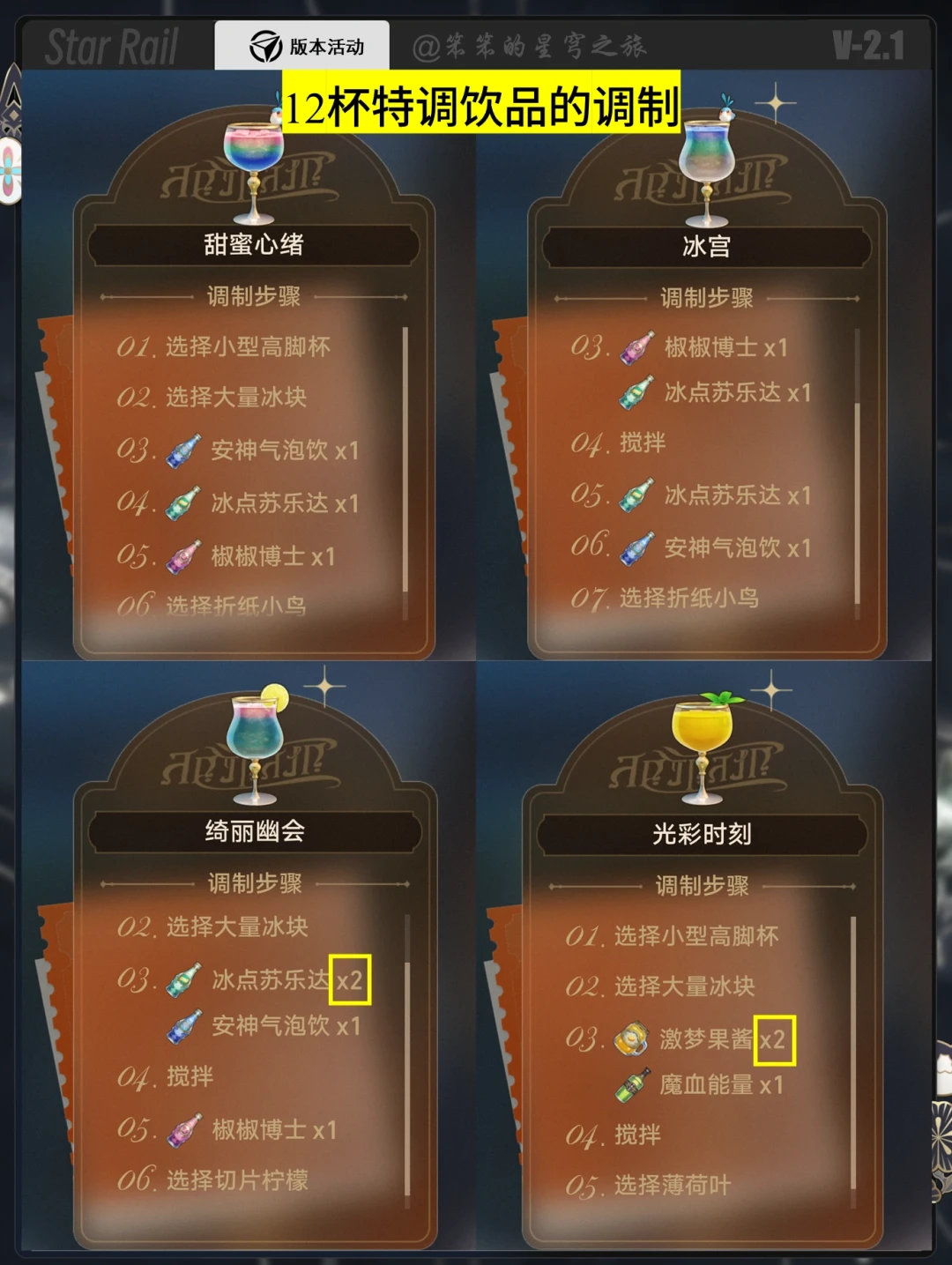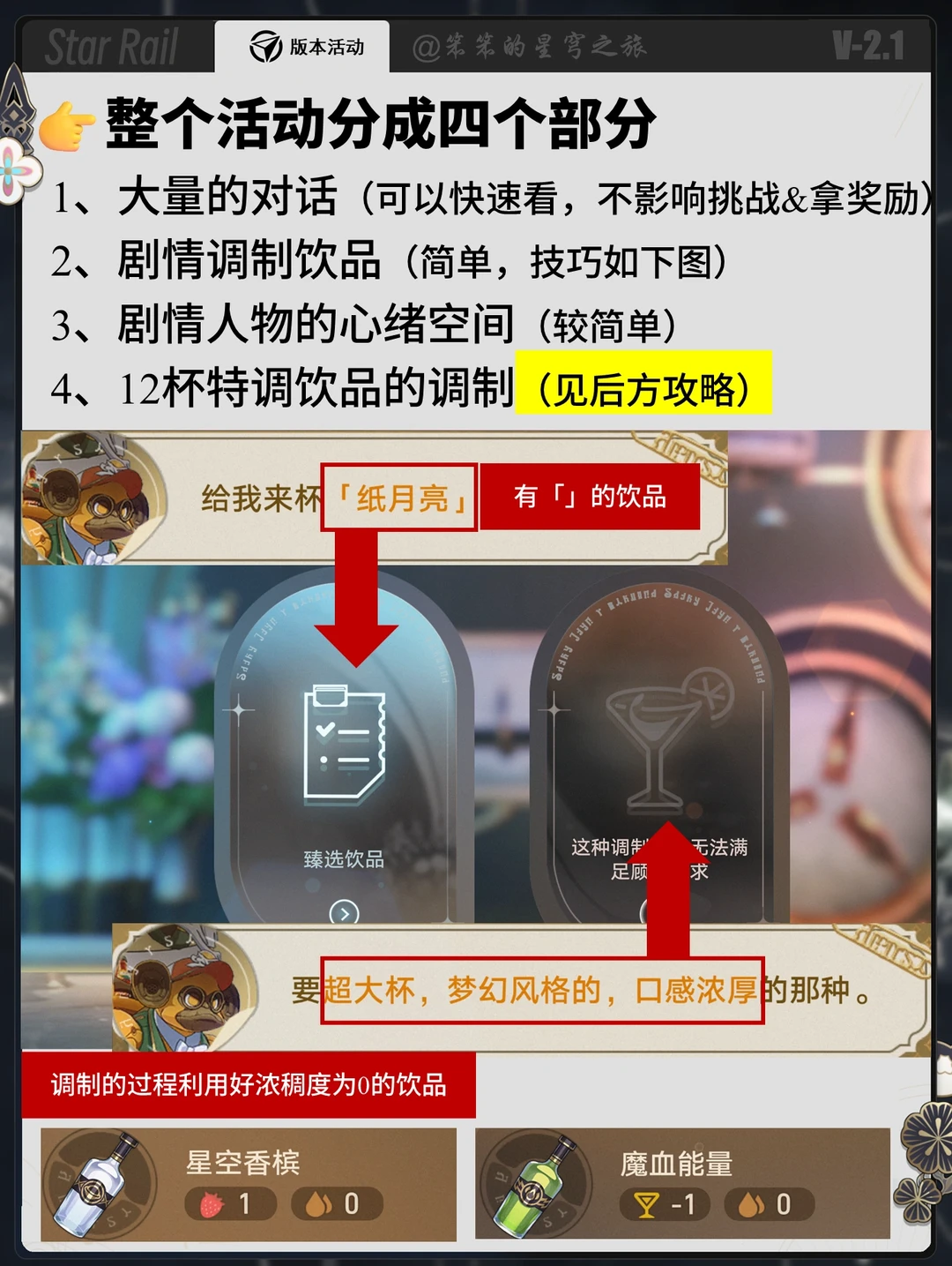 🐱大家好,我是笨笨 今天给大家带来的是大版本活动 「杯中逸事」挑战攻略 ---------------------------------- 💡活动还是蛮简单的 剧情内容有点长,可以速览,不影响奖励 不过剧情还是蛮有意思的,大家可以体验一下 挑战主要以调制饮品为主 ①剧情中的饮品没有标准答案 大家可以自行调制 ②12杯特调笨笨把调制手法 都截图放出来了,大家可以直接抄作业 希望对你有用哦