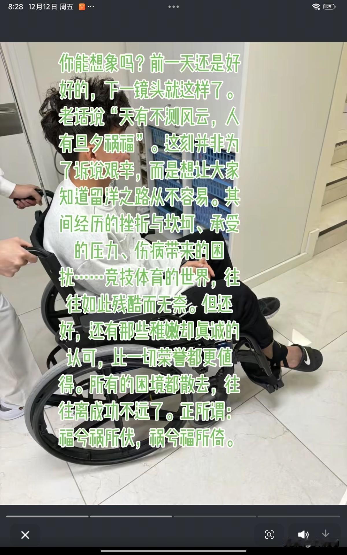 天有不测风云,U16国少当家球星邝兆镭刚回到西班牙便受重伤了! 12月12日老邝在社媒发布了小邝受伤的消息,小邝坐在轮椅上,整个小腿都缠上了纱布。 老邝配文称:你能想象吗?前—天还是好好的,下一镜头就这样了。老话说“天有不测风云,人有旦夕祸福”。这刻并非为了诉说艰辛,而是想让大家知道留洋之路从不容易。其间经历的挫折与坎坷、承受的压力、伤病带来的困扰。。。竞技体育的世界。往往如此残酷而无奈。但还好,还有那些稚嫩却真诚的认可。比—切荣誉都更值得。所有的困境都散去,往往准离成功不远了。正所谓:福兮祸所伏,祸兮福所俗倚。 小邝是一位非常努力非常自律的小球员,在前一段时间亚少赛预选赛中代表国少表现非常出色,但是感觉他踢球很沉重,脸上鲜有笑容,小邝在接受采访时也说自己压力很大。 个人特别希望小邝能快乐的踢球,毕竟他还只是一个16岁的孩子,不用背负太多的压力,球迷也应该对小邝宽容些,他已经很出色了不要给他过多的压力。 最后祝福小邝早日康复,回到球场!