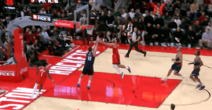 第四节比赛,阿门-汤普森反击回传亚当斯,后者接球起飞滑翔劈扣。