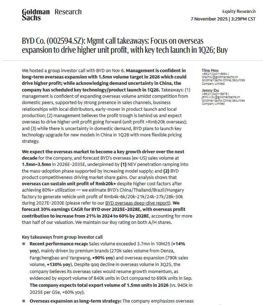 现在电车太卷了,相比前两年,行业竞争异常激烈,估计要慢慢进入调整周期了。不过,今年也有表现不错的车企,1-11月累销达418.2万辆的比亚迪算一个,不说销量有多高的增长,至少高端化路径越来越清晰,出海增速也超预期了。而且企业技术护城河够深,就不怕没有增长的空间。从近期投资市场的一些动作,也能看出,全球资本对中国新能源车企的关注和看好。自四季度以来,高盛、花旗、摩根士丹利等国际顶尖投行,密集发布深度研报,都给予比亚迪“买入”或“增持”评级。其实,这也说明市场发展预期一片向好,权威机构的同频,不是偶然,可能是站在长期视角,更看好比亚迪的未来吧。