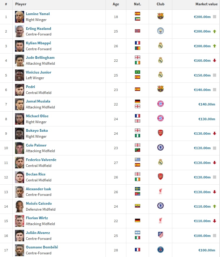 直播吧12月12日讯今日德转更新西甲球员身价,目前足坛亿元先生仍为17人,其中西甲7人、英超7人、德甲2人、法甲1人、意甲仍0人。