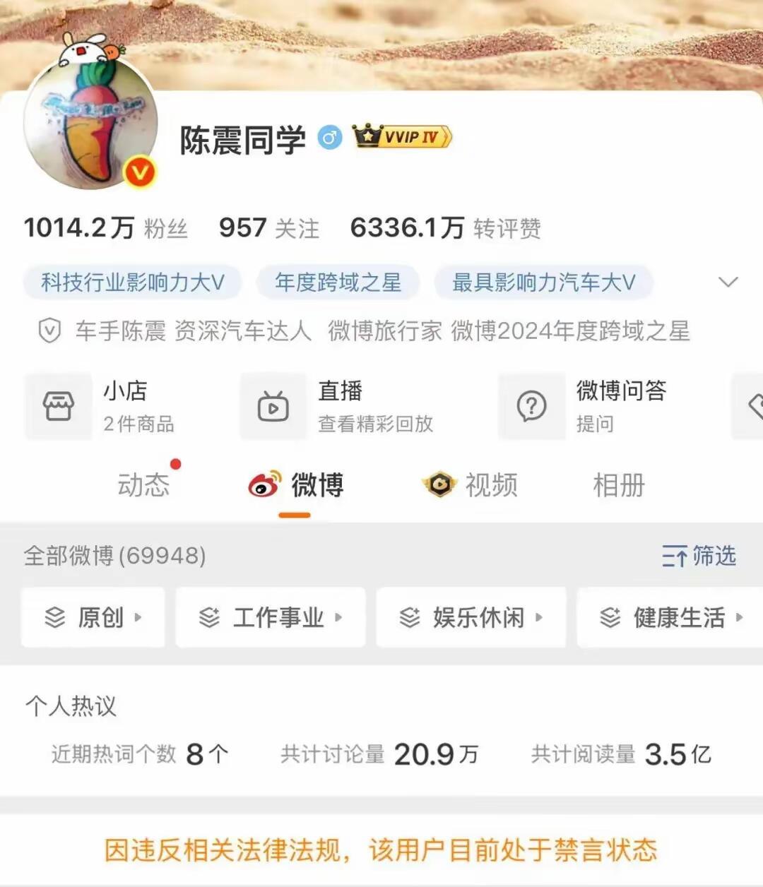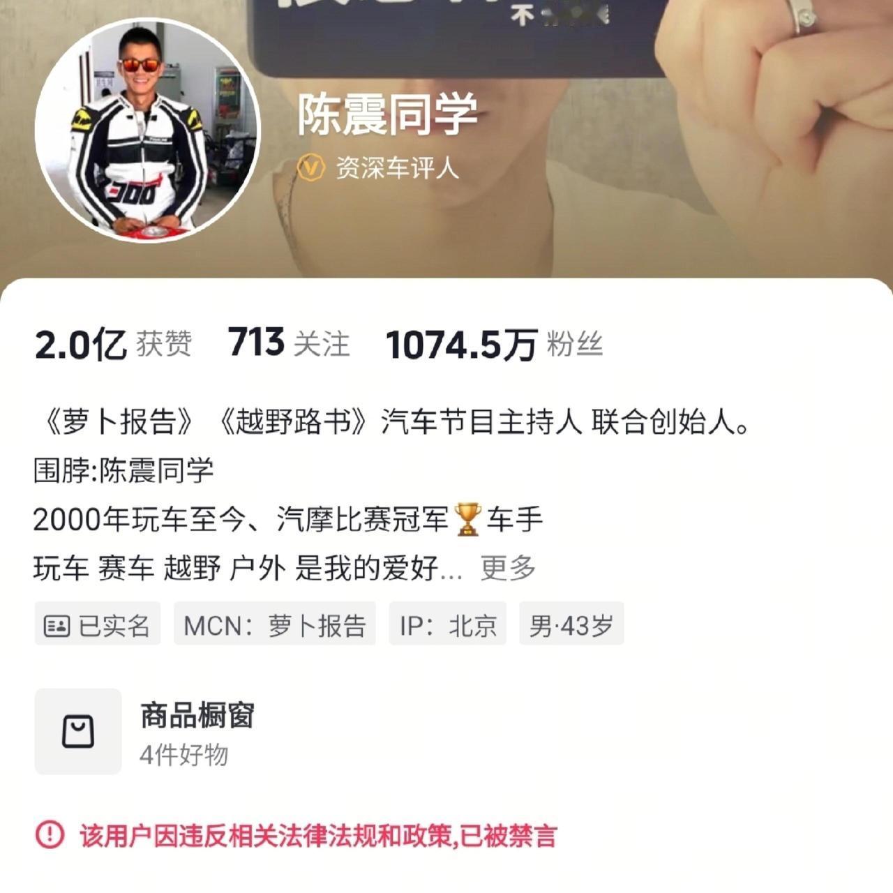 车圈大V陈震这次是真“凉”了。微博、抖音、快手、小红书全平台禁言,B站更是直接封号。页面显示是“违反法律法规和政策”,这跟一般的“违反社区公约”性质完全不同,说明是上头直接出手了。而且到现在也没见有谁敢公开替他说话,大概率是踩了红线,不冤。 有人可能会猜,是不是因为他前两天发视频提了小米“7000法务”,立马就被封了,是不是小米干的?但冷静想想,这事儿真赖不上小米。他过去一年里阴阳怪气甚至造谣小米的次数多了去了,小米要告早告了,不会等到现在。 说到底,陈震这次出事,跟他自己长期走的偏门路子脱不了关系。一个自称车评人,微博上八成内容却是截图跟网友对骂,真正说车的有多少?为了流量和热度,什么都敢蹭,连香港火灾这种事都能拿来当攻击小米的材料,早就失了底线。这种玩法短期内可能博眼球,但时间长了,翻车是迟早的事。 最讽刺的是,他自诩车圈顶流,一年到头高强度“碰瓷”小米,结果也没见对小米销量造成什么实际影响。小米后来干脆不理他,他反而有点蹭不上热度的失落感,还在变着法找存在感。这说明什么?说明所谓“头部车评人”的话语权,在真正的产品和市场面前,可能根本没他自己想的那么重要。 这次全平台封禁,算是一个明确的信号:靠煽动对立、制造谣言、践踏底线来博流量的路子,走到头了。法律法规的红线在那儿,不是闹着玩的。这也给所有自媒体提了个醒:说话要有凭据,做事要守底线,否则流量反噬起来,摔得比谁都快。