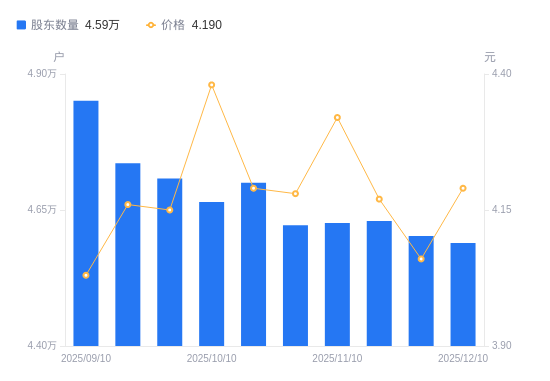 日期A股户数(户)流通A股户均持股数(股)户均持股市值(万元)2025-12-104589356634.7423.732025-11-284602456473.5322.932025-11-204629656141.7423.412025-11-104626056185.4324.272025-10-314621856236.4923.512025-10-204700055300.8123.172025-10-104664955716.9024.402025-09-304708155205.6622.912025-09-194736154879.2922.832025-09-104850953580.5321.59