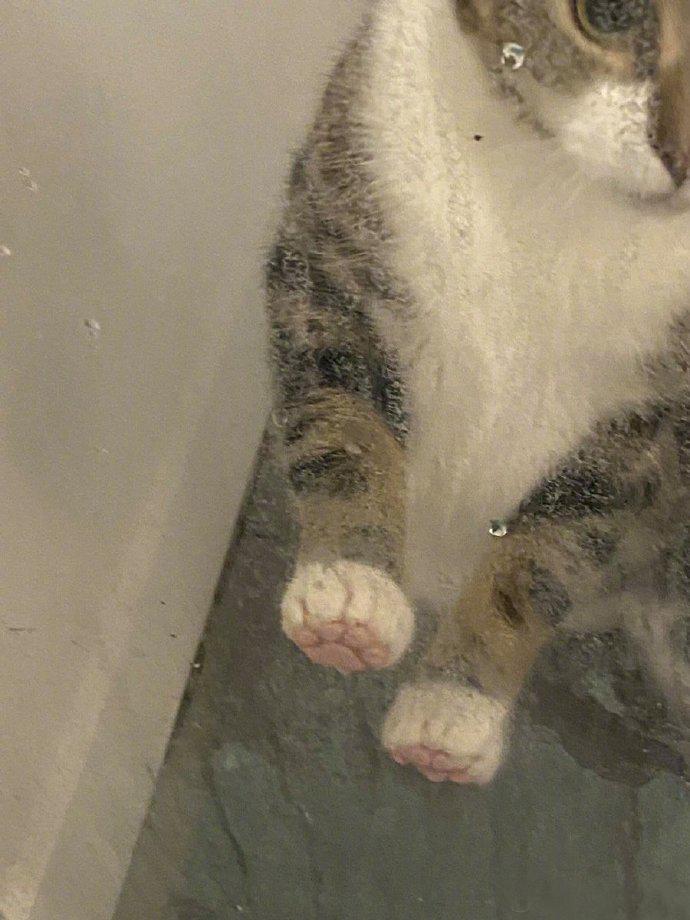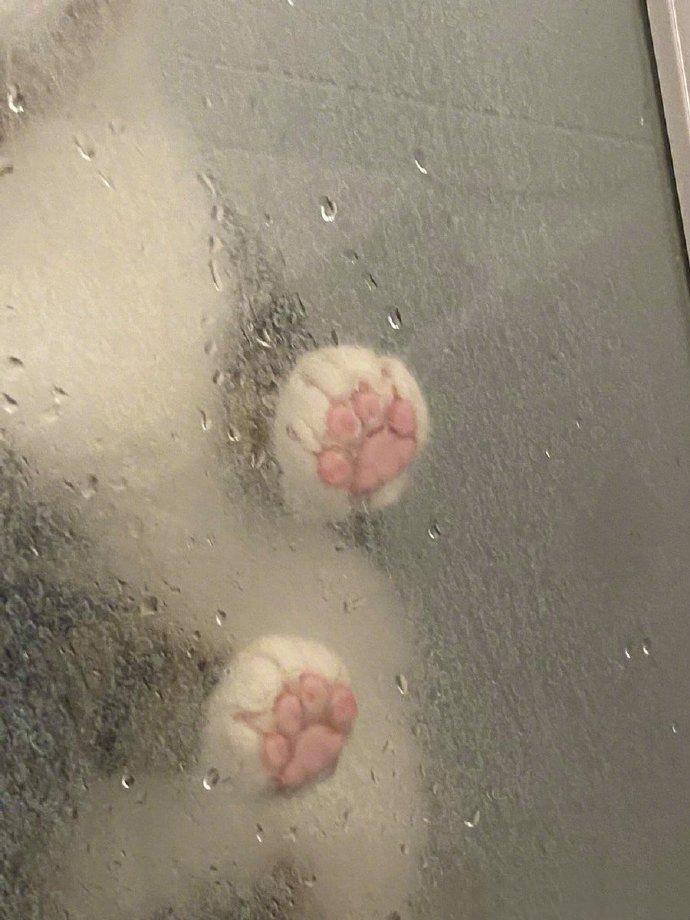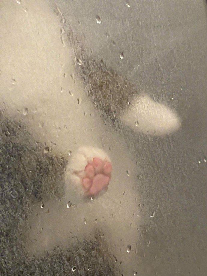 喵星人趴在浴室的玻璃门上,那肉球简直让人疯狂。。。