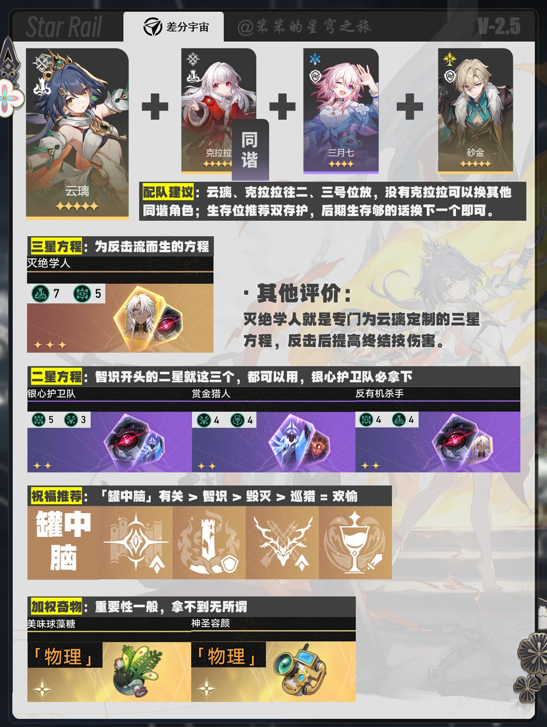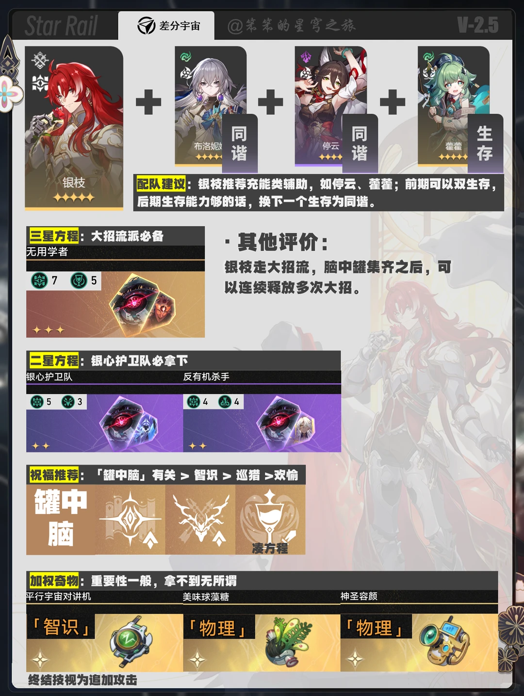 🐱大家好,我是笨笨的铲屎官 今天给大家带来的是差分宇宙 7个大家常用主C的配装攻略 希望对你有用哦 👉攻略主要是针对低协议模式 高协议的话,如协议六 可能部分主C不太好用 大部分主C都需要严格刷初始二星 第一个精英怪也需要刷三星方程 否则很难通关 至于协议七、八属于高难关卡 且没有奖励,大家就自己多多探索吧