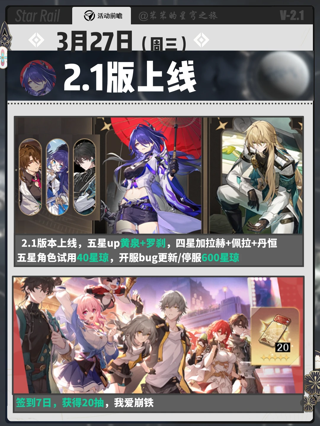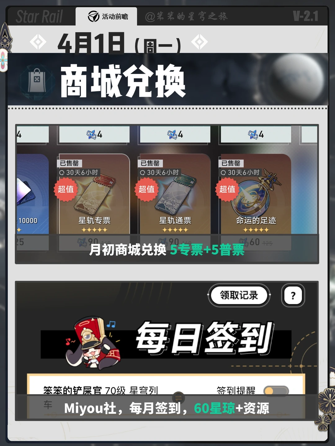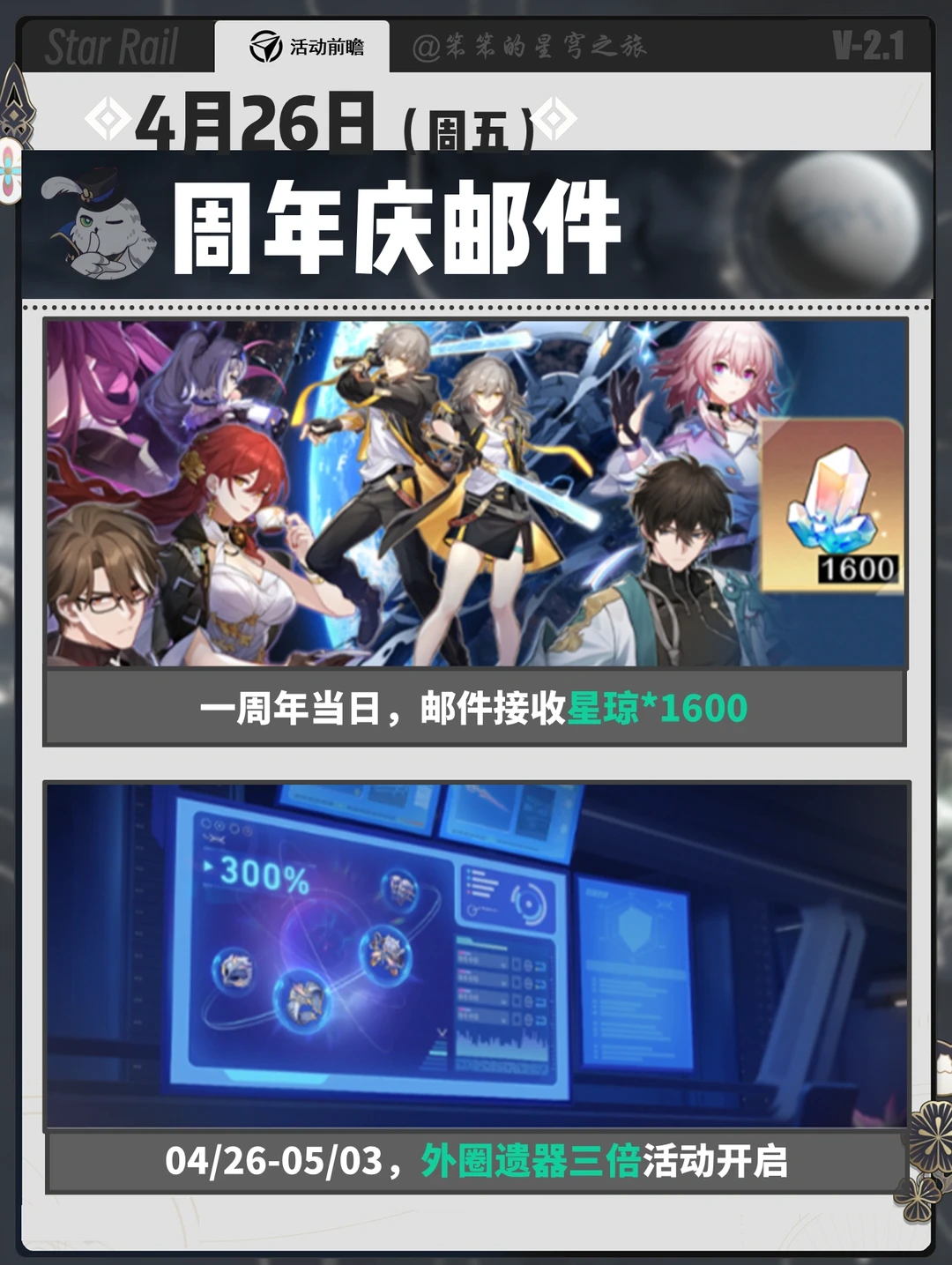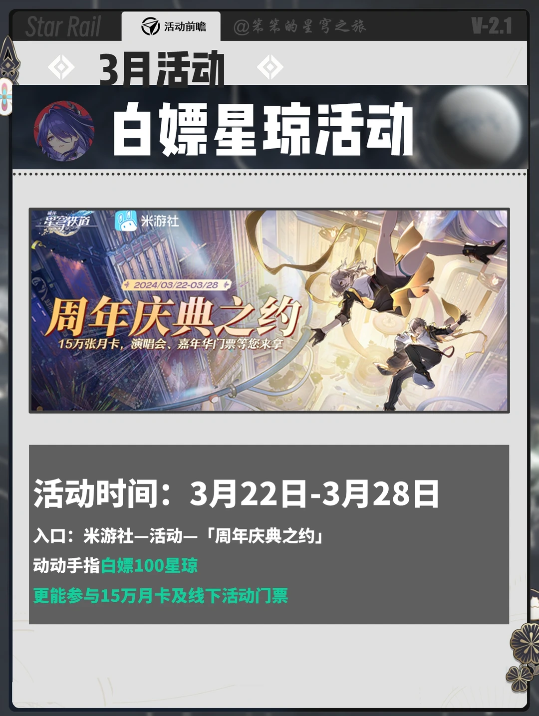 🐱大家好,我是笨笨 笨笨的崩铁4月活动日历来啦 ------------------------------ 💡几个注意事项如下: ①笨笨把3月底的2.1重点活动也放到了日历里面 方便大家查看近期的活动 ②周年庆活动盘点如下: 3月27日:签到20连启动 3月27日:全服参与开拓活动1000星琼 3月28日(最后一天):网页100星琼 4月10日:内圈遗器3倍 4月26日:周年庆邮件1600星琼 4月26日:外圈遗器3倍