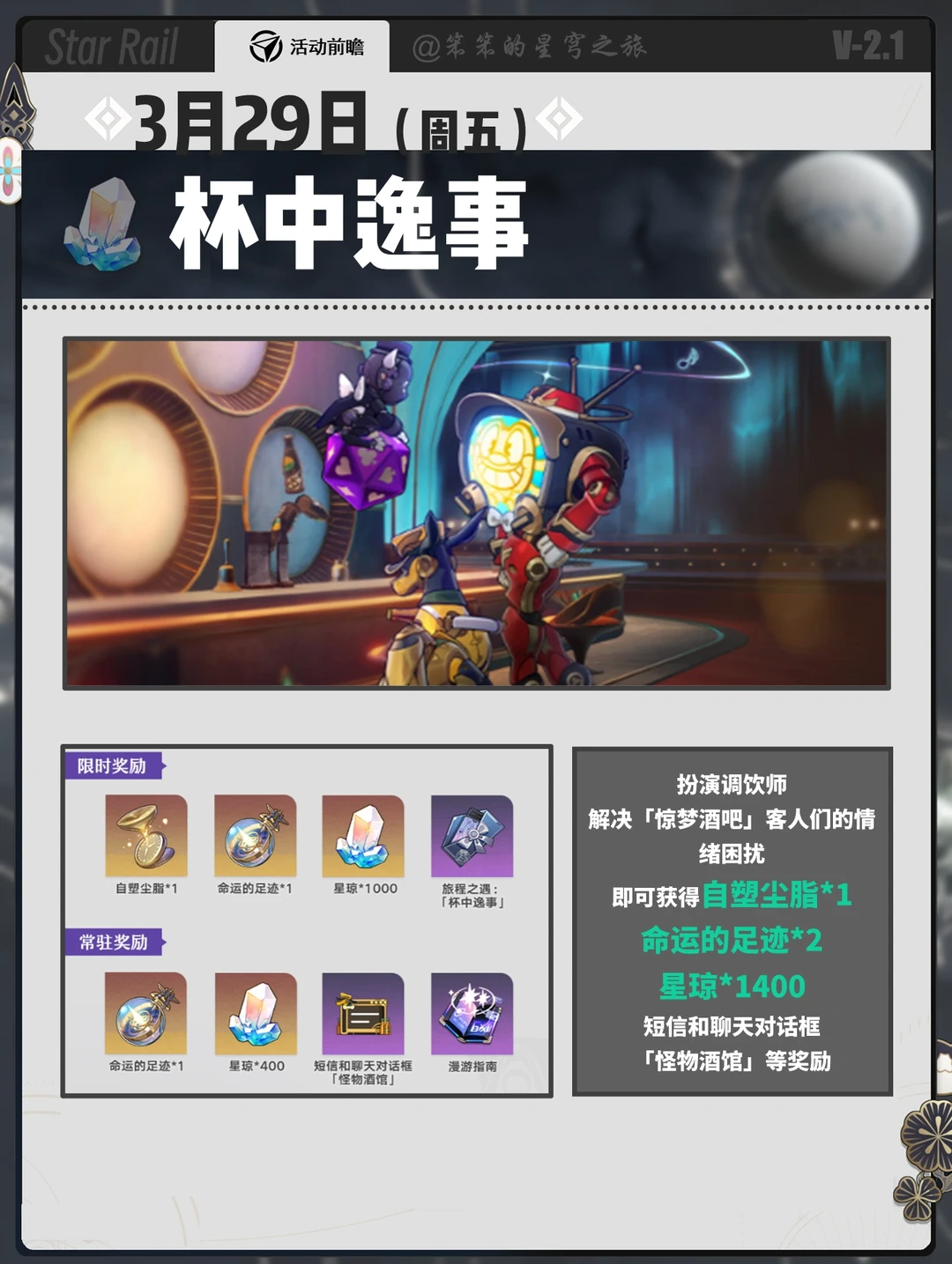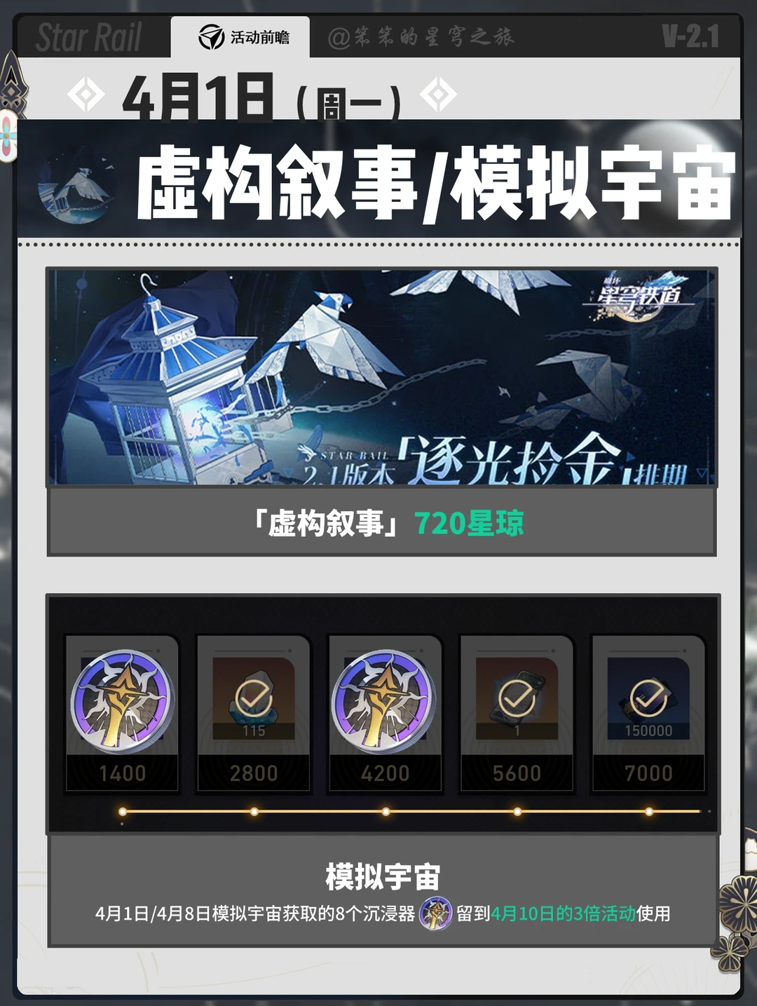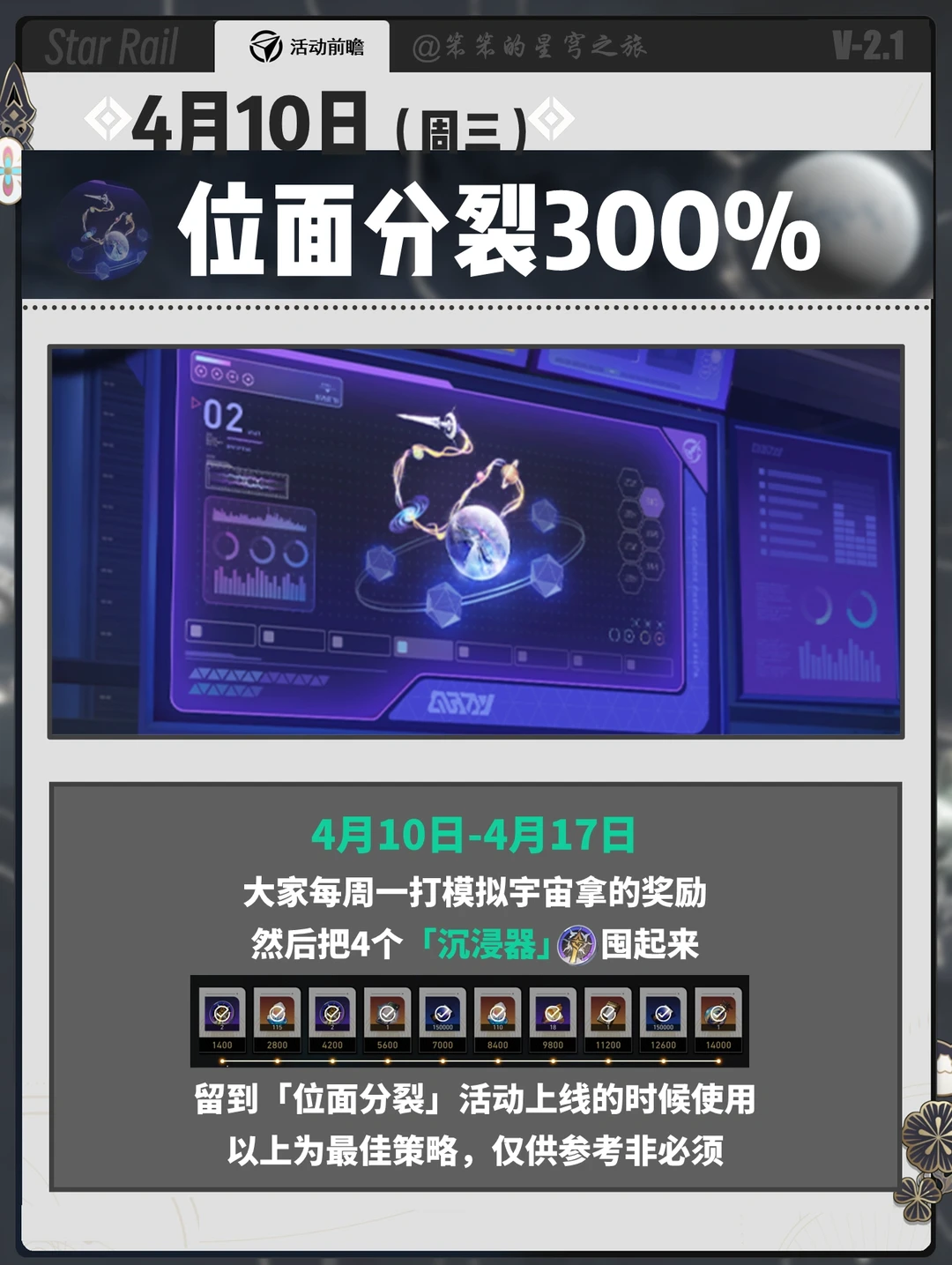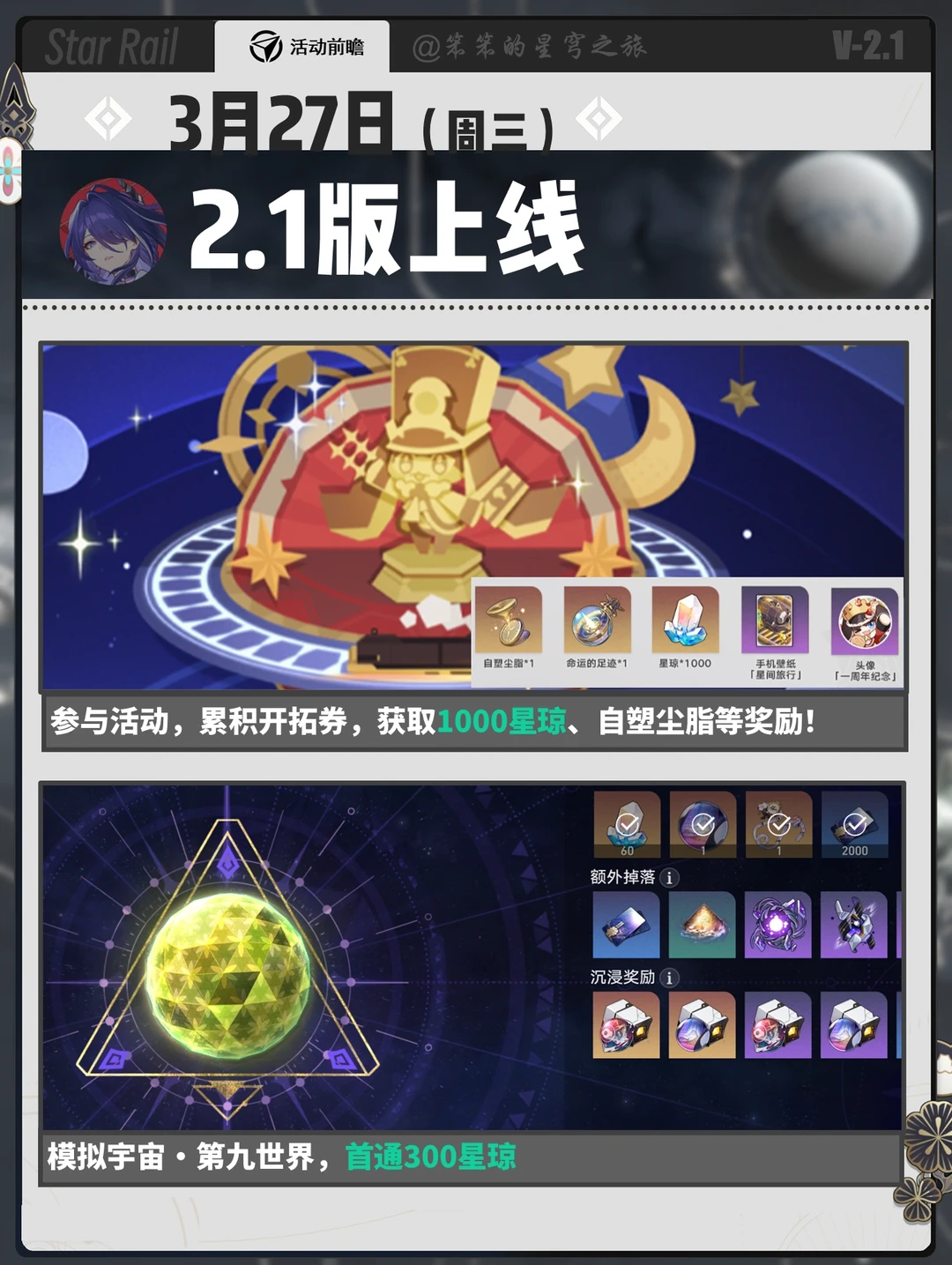 🐱大家好,我是笨笨 笨笨的崩铁4月活动日历来啦 ------------------------------ 💡几个注意事项如下: ①笨笨把3月底的2.1重点活动也放到了日历里面 方便大家查看近期的活动 ②周年庆活动盘点如下: 3月27日:签到20连启动 3月27日:全服参与开拓活动1000星琼 3月28日(最后一天):网页100星琼 4月10日:内圈遗器3倍 4月26日:周年庆邮件1600星琼 4月26日:外圈遗器3倍