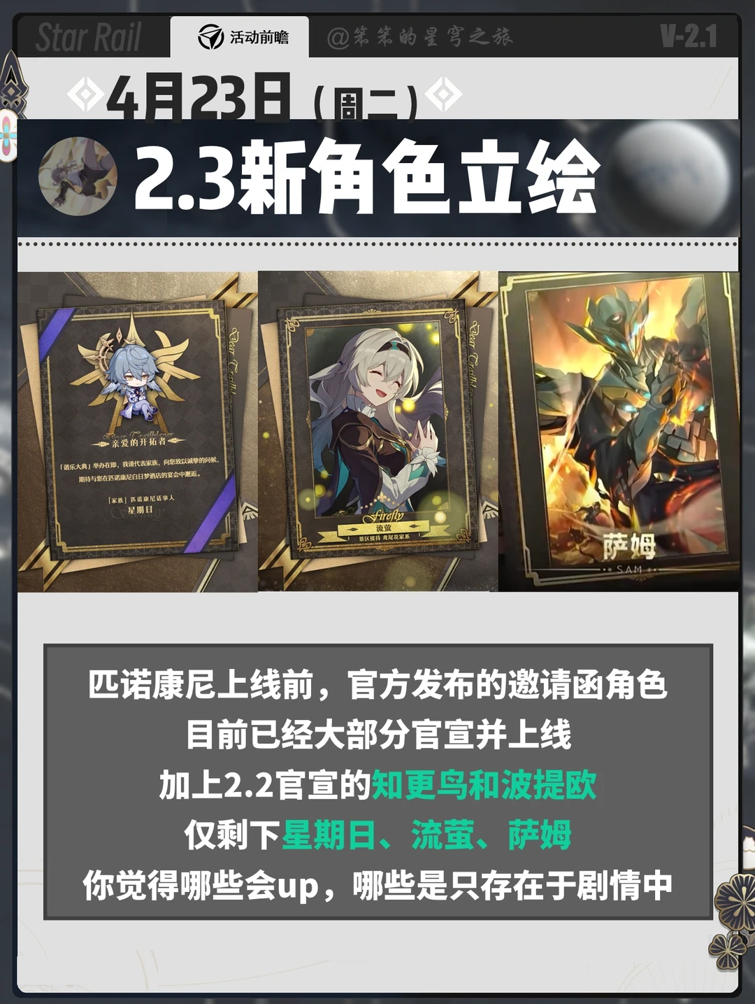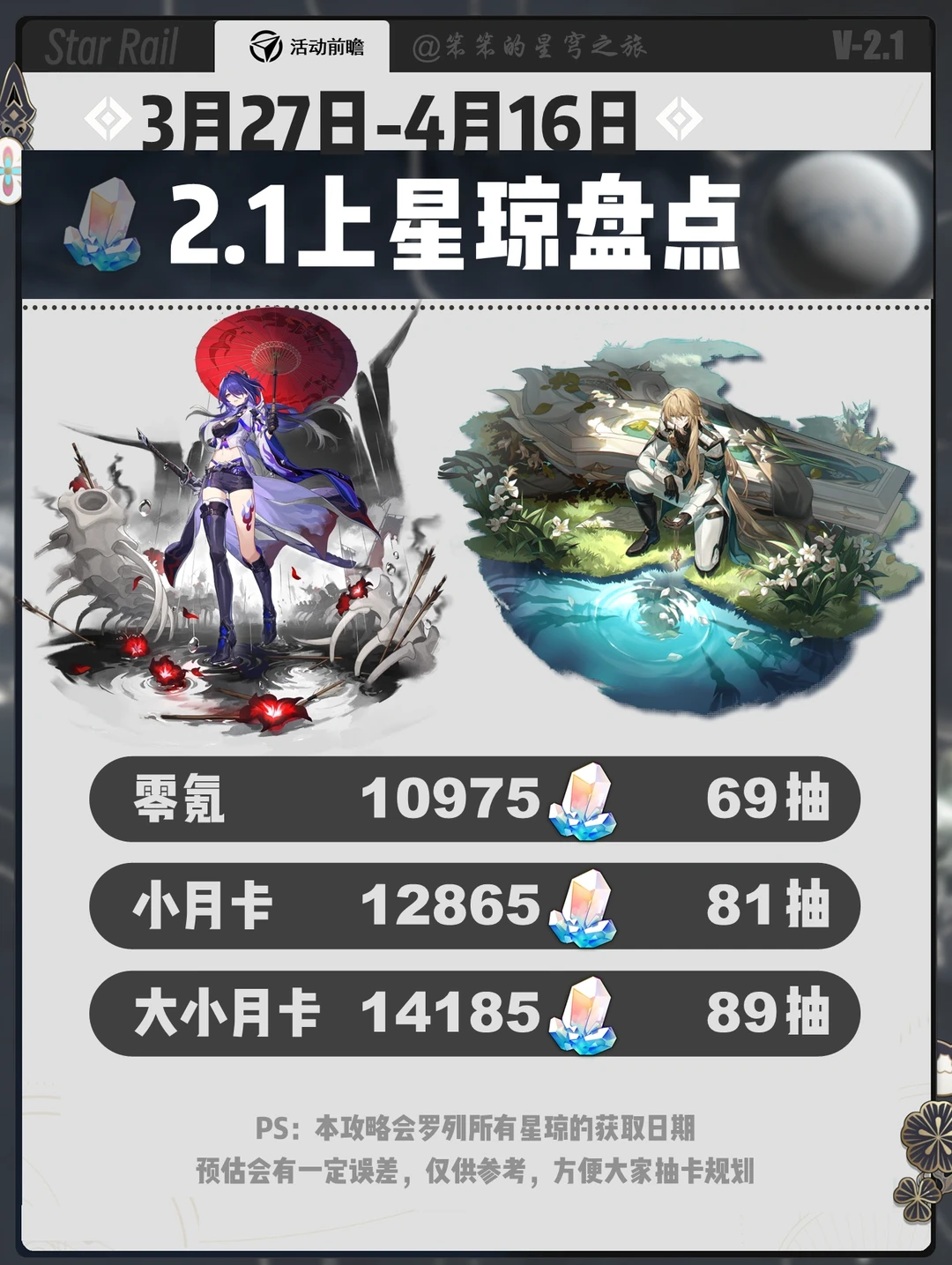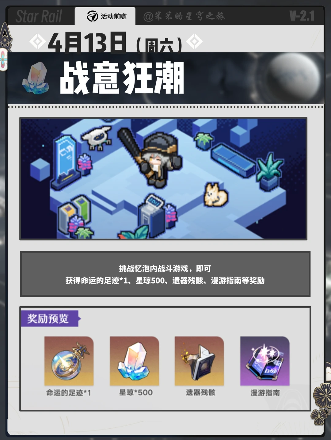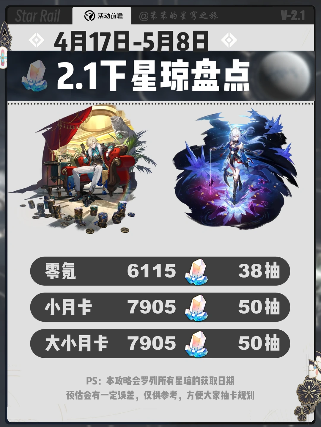 🐱大家好,我是笨笨 笨笨的崩铁4月活动日历来啦 ------------------------------ 💡几个注意事项如下: ①笨笨把3月底的2.1重点活动也放到了日历里面 方便大家查看近期的活动 ②周年庆活动盘点如下: 3月27日:签到20连启动 3月27日:全服参与开拓活动1000星琼 3月28日(最后一天):网页100星琼 4月10日:内圈遗器3倍 4月26日:周年庆邮件1600星琼 4月26日:外圈遗器3倍