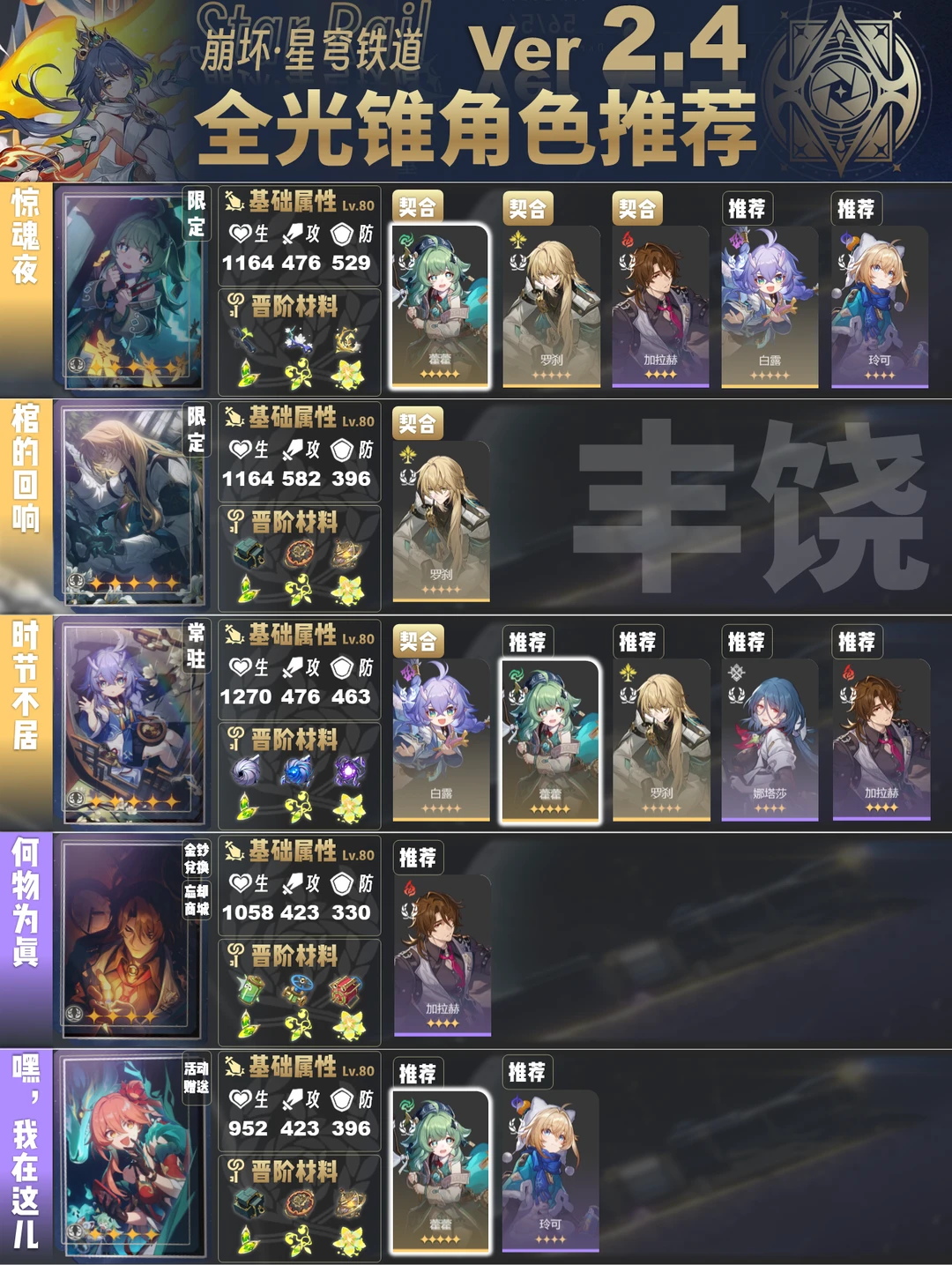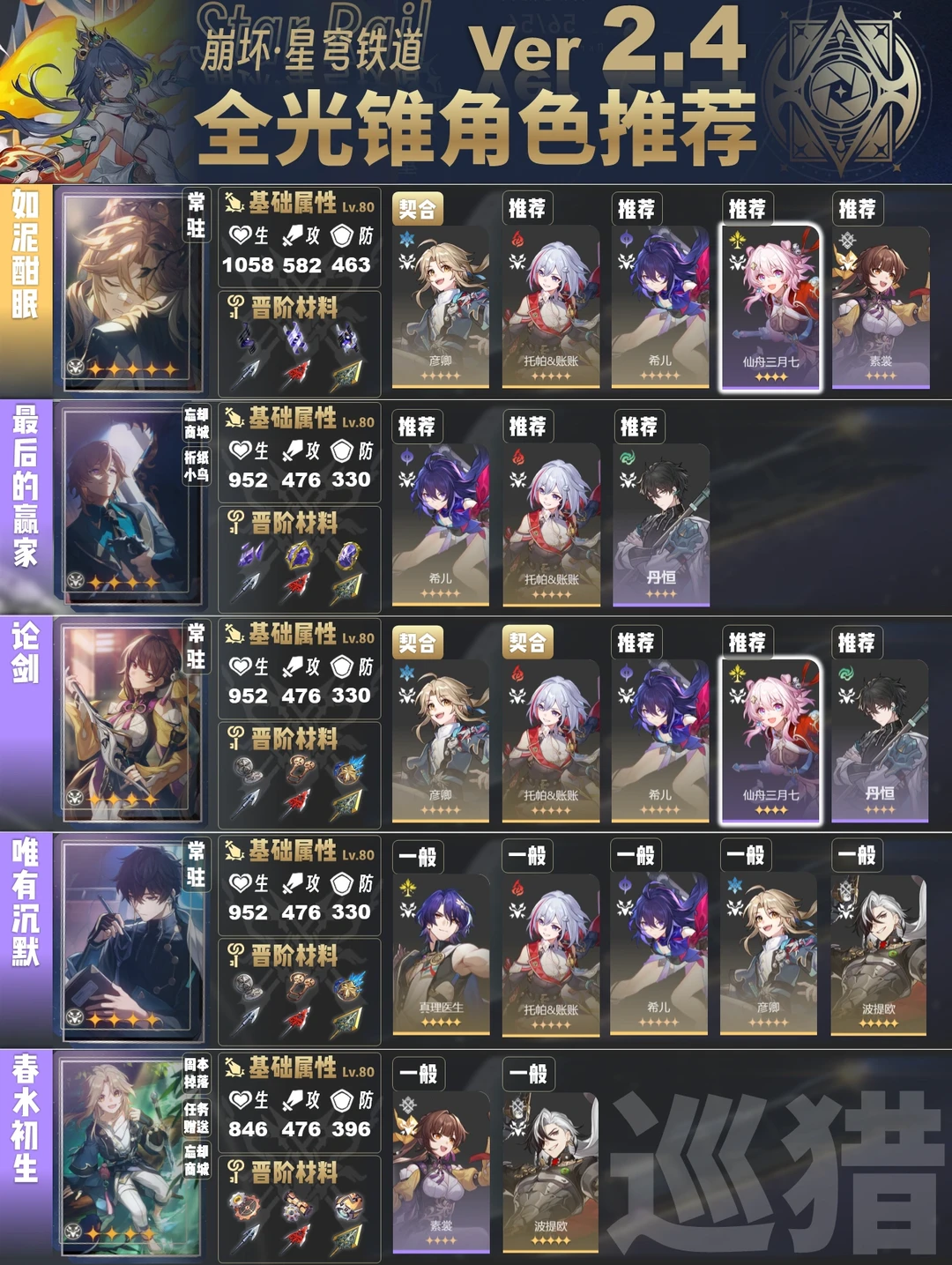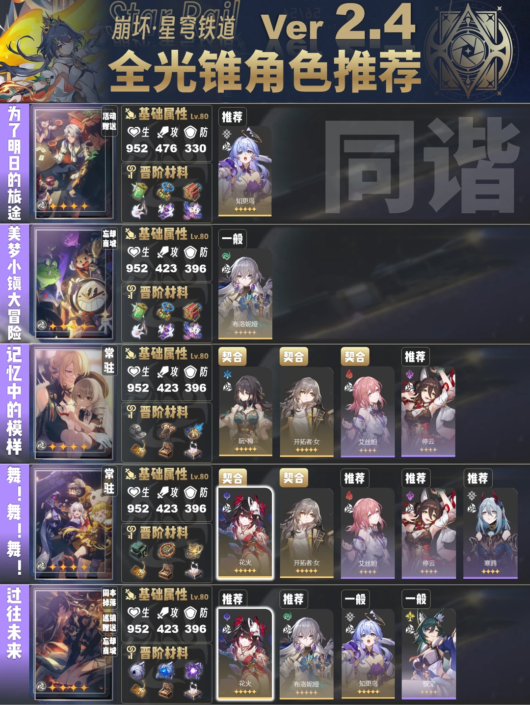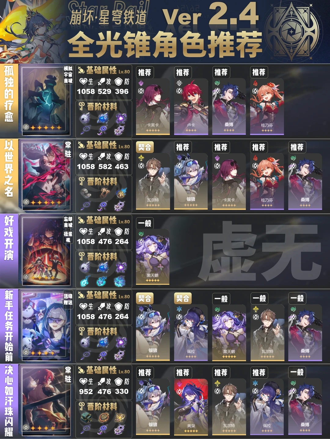 今天给大家带来的是2.4版本全光锥角色推荐