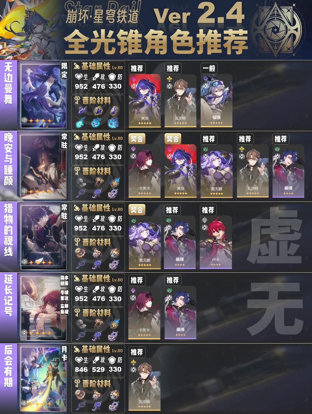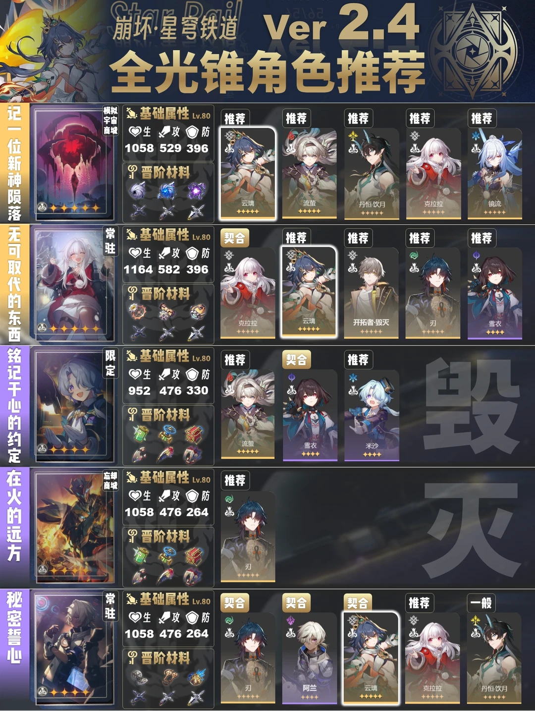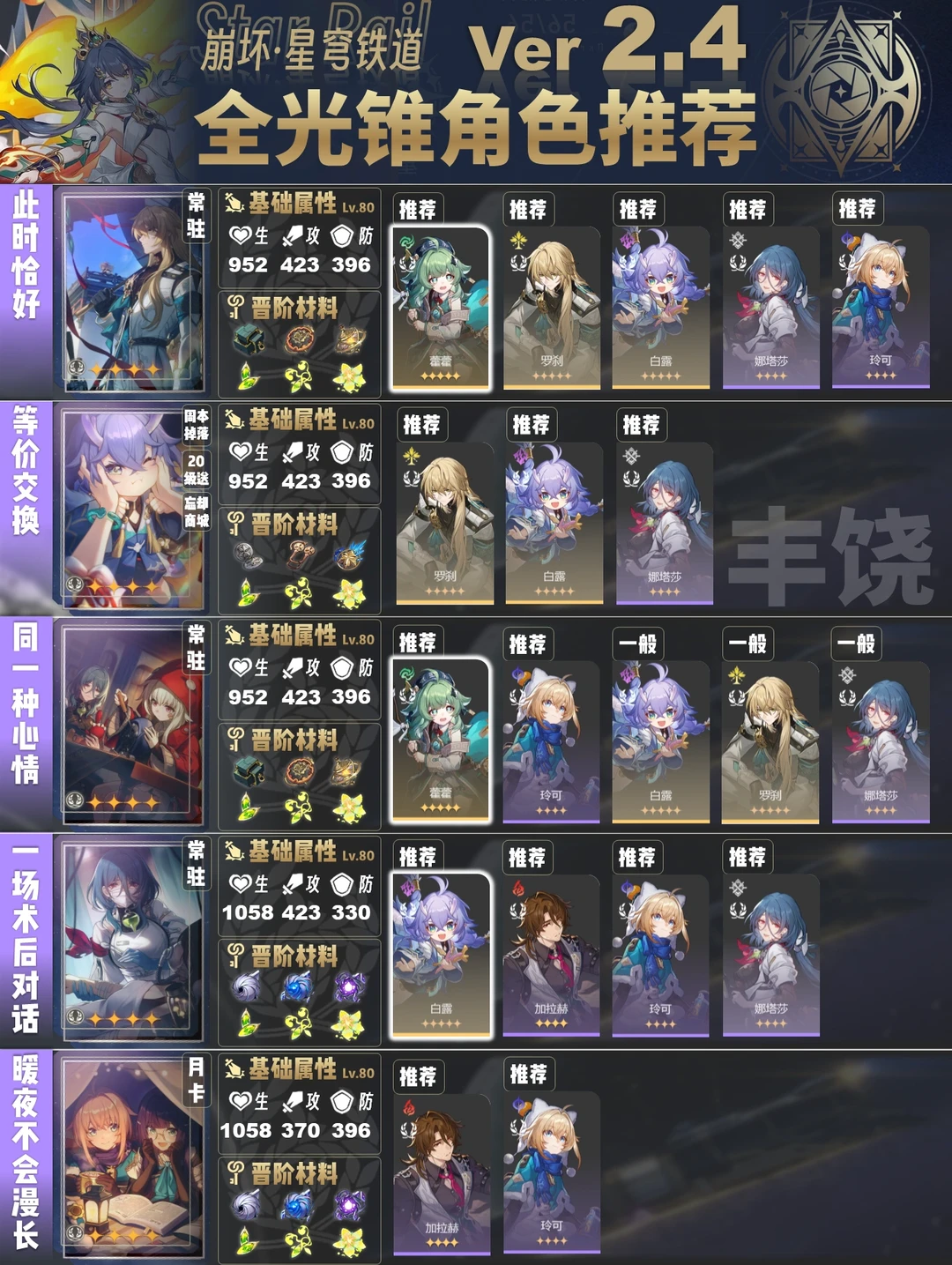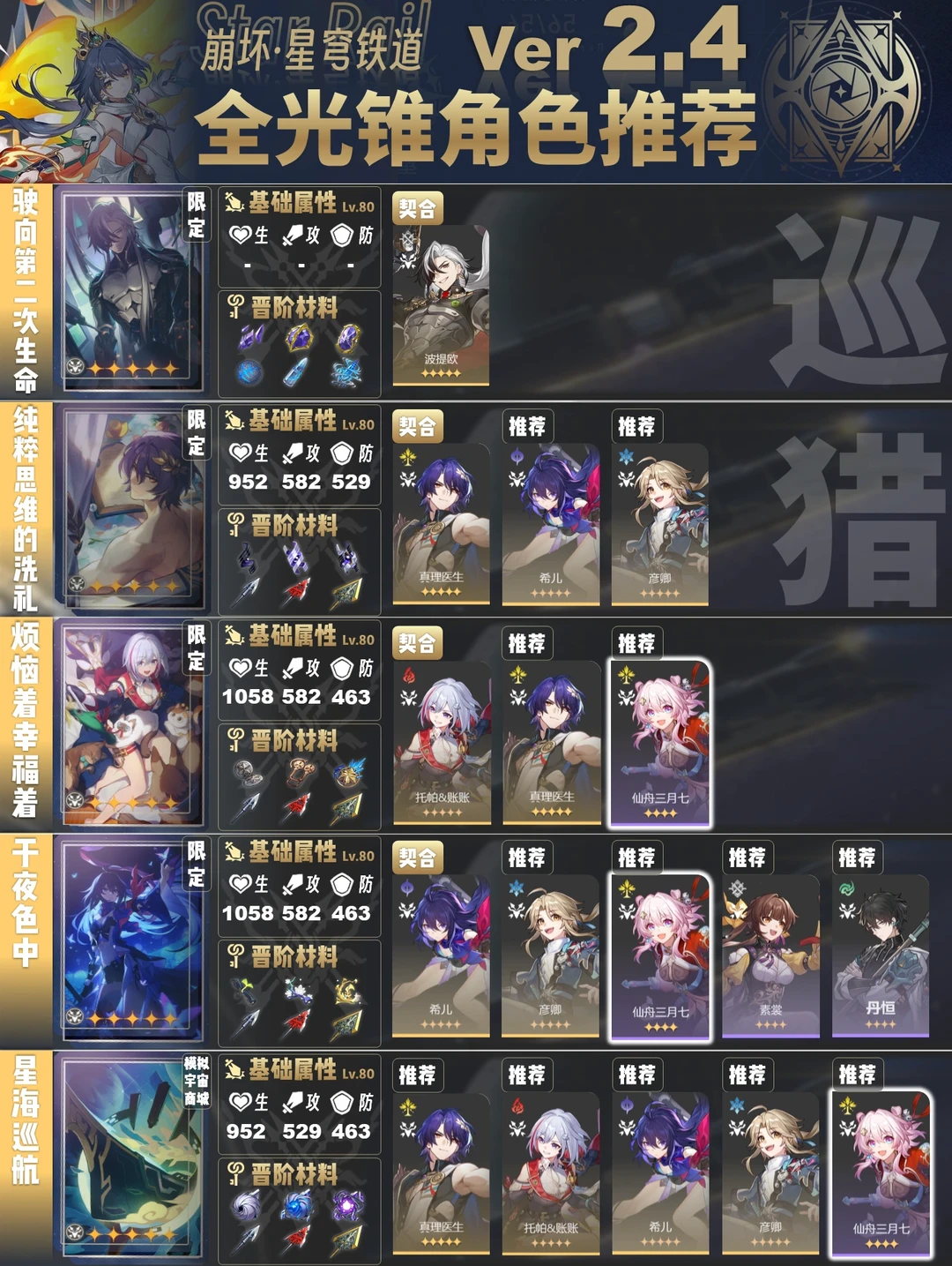 今天给大家带来的是2.4版本全光锥角色推荐