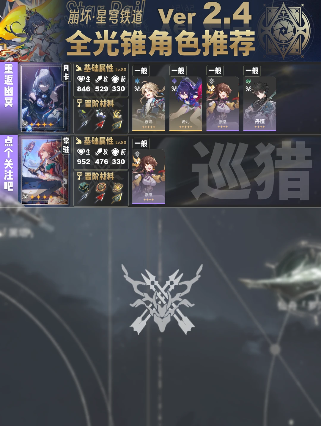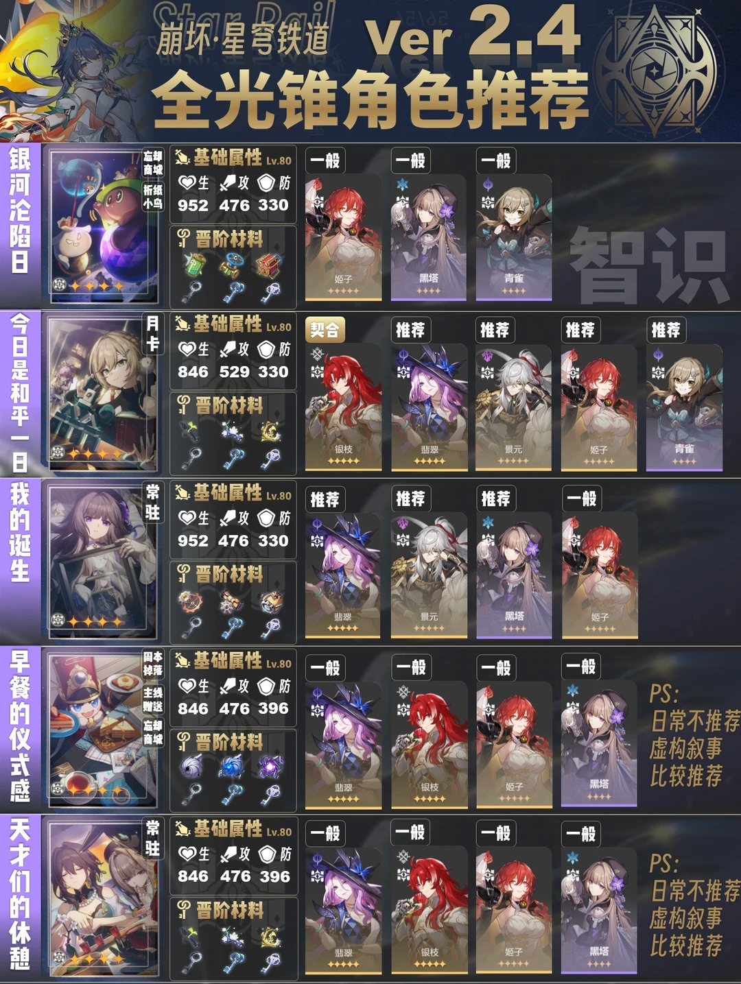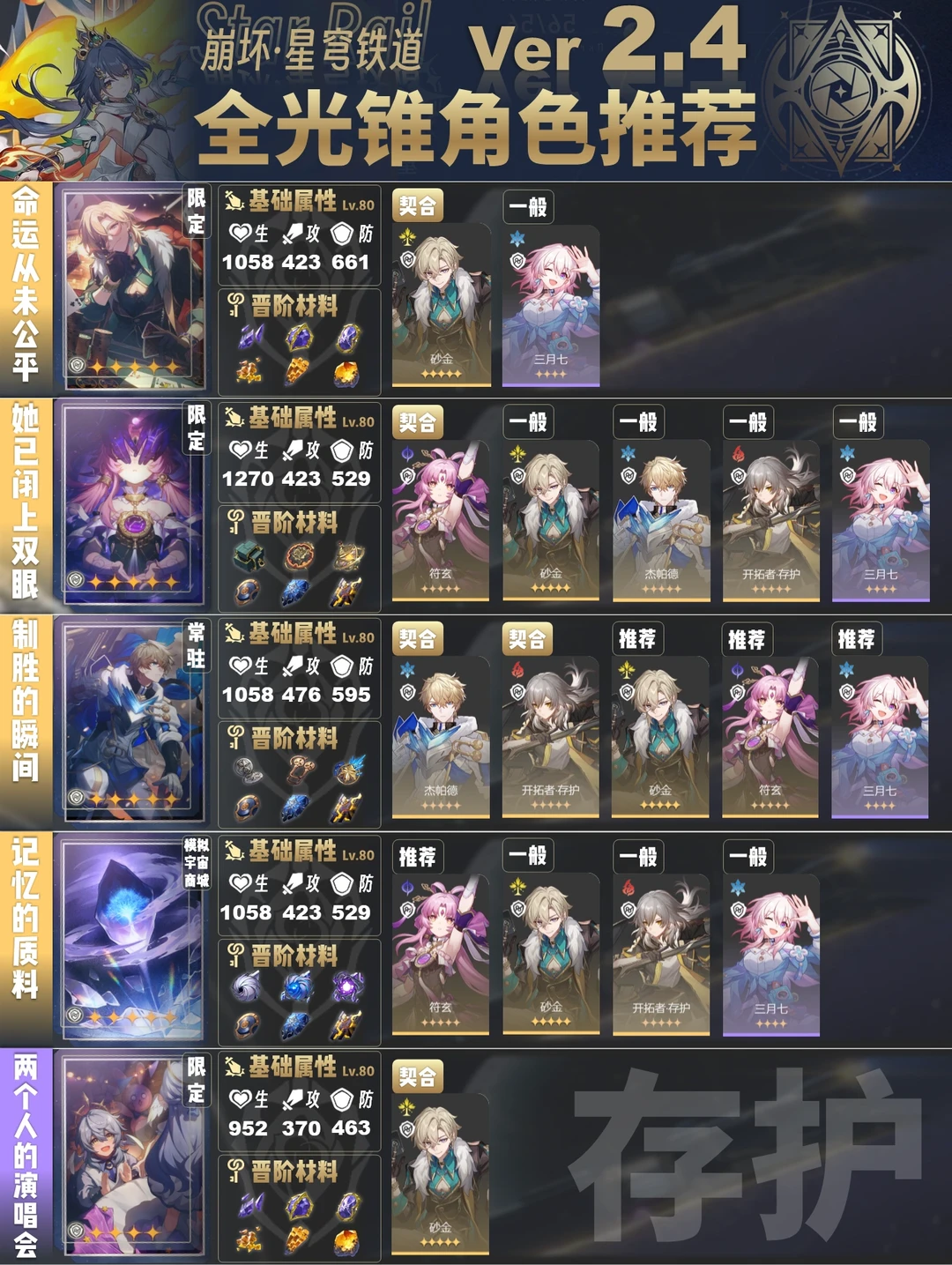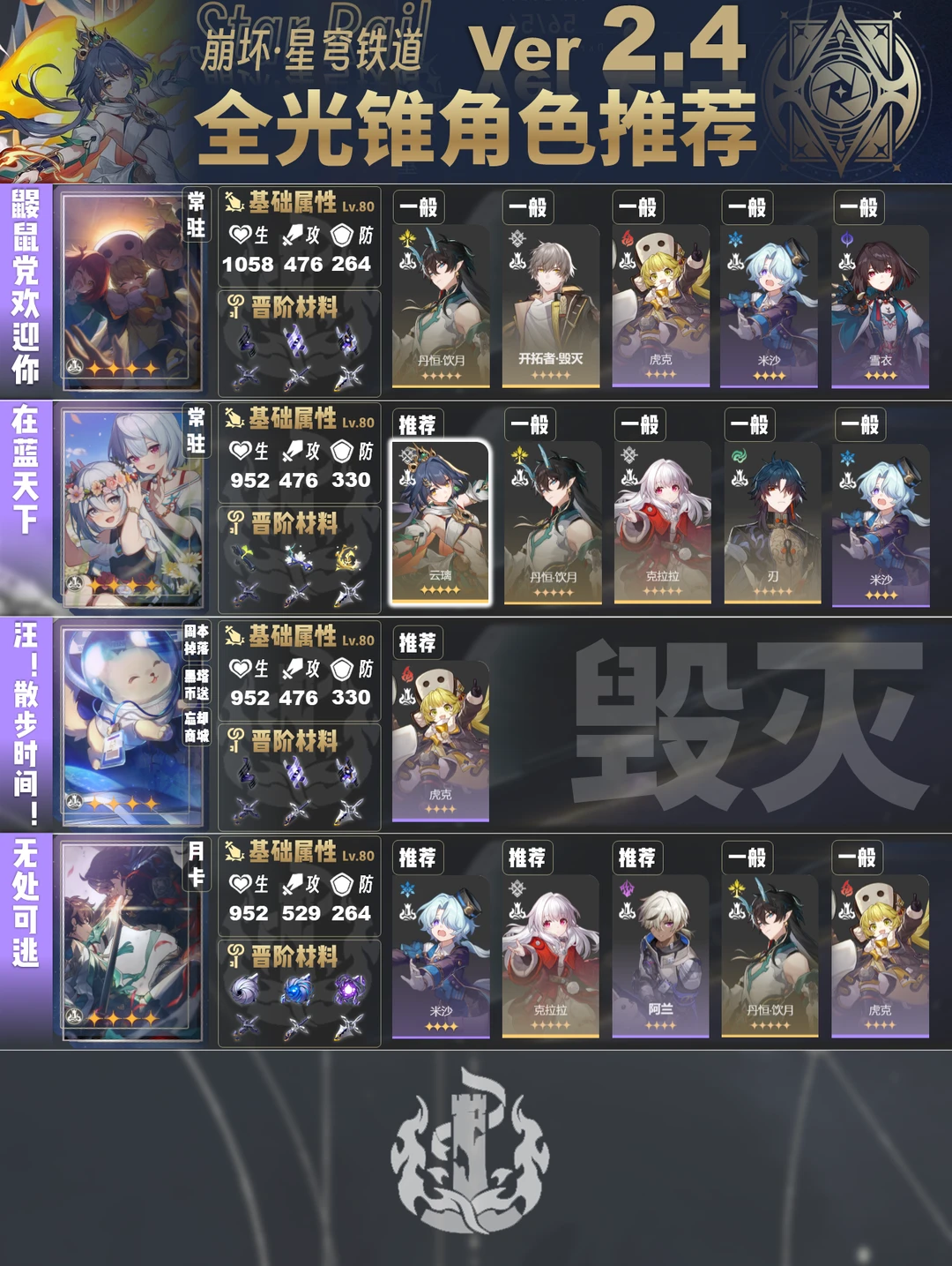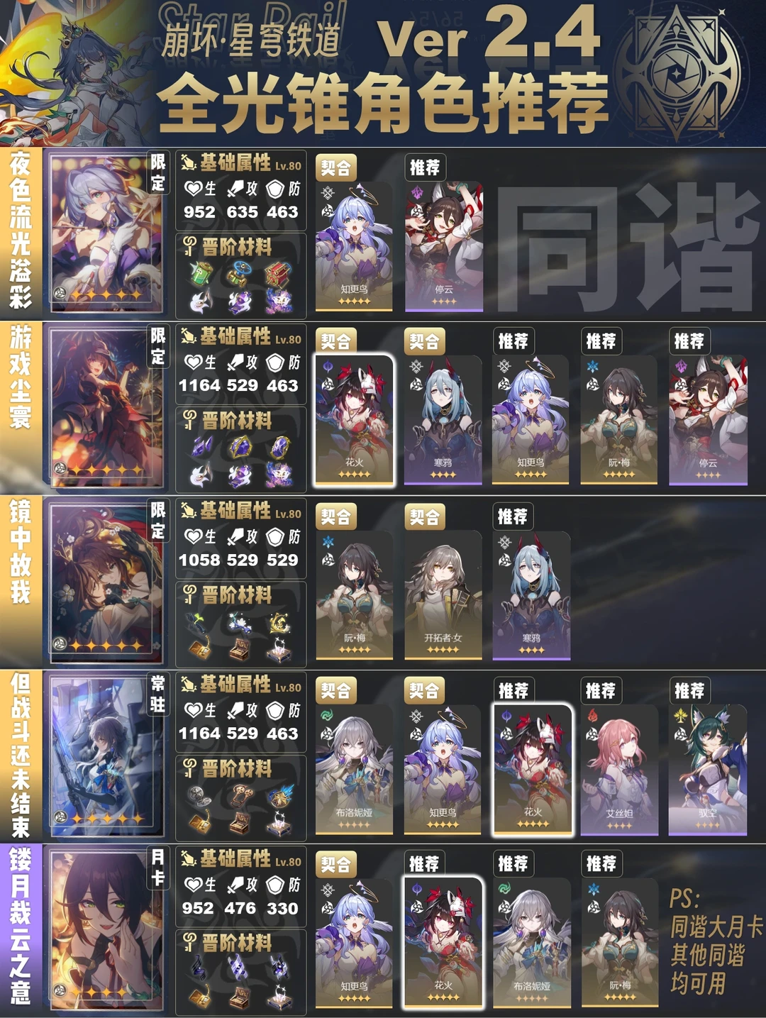 今天给大家带来的是2.4版本全光锥角色推荐