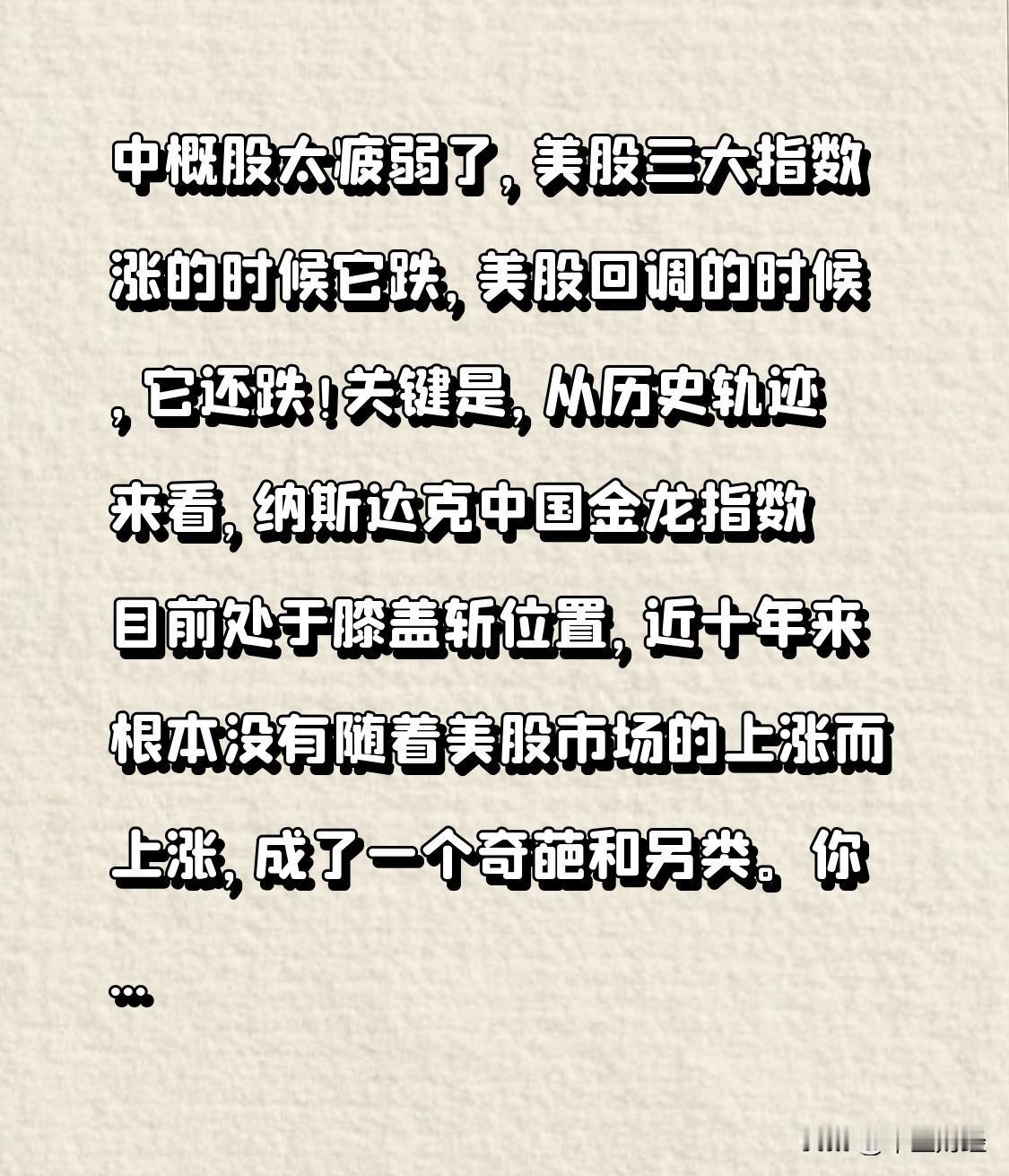 【中概股】中概股太疲弱了,美股三大指数涨的时候它跌,美股回调的时候,它还跌!关键是,从历史轨迹来看,纳斯达克中国金龙指数目前处于膝盖斩位置,近十年来根本没有随着美股市场的上涨而上涨,成了一个奇葩和另类。 你仔细看看,中概股的交易情况,你会惊奇的发现有很多股票早盘都开不出来,极其稀稀拉拉的成交! 中概股被边缘化了,没有多少人敢买!这真是一种怪现象,还是本应如此,还是中概股本身风险过大?美股 美股走势