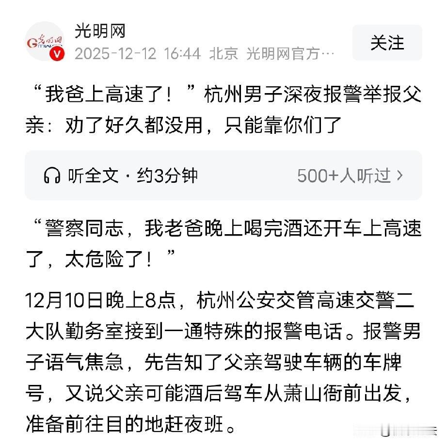 “这老爹是真犟啊!”浙江杭州,男子喝了2、3两药酒,担心夜班考勤,仗着胆子开车上高速,儿子知道后苦劝他别开车,可男子偏是不听,儿子情急之下报警:我爸喝完酒开车上高速了,太危险了!我劝不住,只能靠你们了。民警接到报警后,设置拦截点,将男子拦下,经酒精测试血液酒精含量高达122mg/100ml,已超过 80mg/100ml 的醉驾认定标准,这下男子付出了惨痛代价。网友却说:儿子做法欠妥! 老庞平时喜欢喝点小酒,他觉得这样可以解解乏,12月10号这天下午三四点钟,他拿出珍藏的药酒,自斟自饮,不自不觉喝了两三两,觉得心口暖呼呼的。 喝完药酒后,老庞突然想起可别耽误了夜班考勤,他仗着胆子,自觉自己的酒量好,心里存了侥幸,开着车就出发了。 儿子小庞给老庞打电话时无意间知道老爹酒后开车,心里急的像热锅上的蚂蚁,他苦劝父亲别开车,你喝了酒,又是大晚上的,路上光线没那么好,真的太危险了。 可是,尽管小庞多次劝说父亲别开车,可是父亲偏就不听,任凭小庞怎么劝都没有用。 老庞也是犟,觉得儿子小庞就是小题大做,自己只喝了两三两药酒根本没啥事,至于这样吗?继续开车前行。 小庞实在没办法了,他提心吊胆,酒后开车就是在拿生命冒险,更何况父亲还要上高速,眼看着8点了,天又黑了,高速上车那么快,万一出个啥事后果真的不堪设想。 为了父亲的安全,也为了避免意外,他情急之下一咬牙一狠心打了报警电话:“警察同志,我爸晚上喝了酒,开车上高速了,太危险了,我劝不住,只能靠你们了。” 随后,小庞把父亲的车牌号,还有父亲要走的路线告诉了民警。 民警接到小庞的报警后,通过公共视频,很快锁定了老庞这辆车的轨迹,考虑到沪昆高速晚上车流量也不小,迅速调度了附近警力是前去控制局面。 附近的民警很快在沪昆高速萧山东外广场,将老庞的车辆拦了下来。 老庞停好车后,民警简单询问了他几句,老庞倒也坦诚,说他这天下午三四点钟的时候喝了两三两药酒,因为担心夜班考勤就开车了。 不过,老庞为了蒙混过关,还耍起了小聪明,撒谎说他找了代驾。 可他的小把戏怎么能瞒过民警的火眼金睛,一句“把代驾记录拿出来”,就让老庞顿时哑口无言,满脸尴尬的承认了自己就是酒后开车。 随后,民警对老庞进行了酒精呼吸测试,这一测可不得了,结果显示他血液酒精含量高达122mg/100ml。要知道,超过80mg/100ml就属于醉驾了,老庞这已经远远超标了。 没多久,儿子小庞匆匆赶到现场,他一脸无奈又着急的跟民警说,知道老父亲酒驾后,他一直苦劝无果,就怕出事,只能报警了,希望警方能制止父亲的危险行为。 因为老庞喝酒开车,民警依法将他带到医院进行了血液酒精含量检测,二次检测结果为123.5 mg/100ml。 根据《道路交通安全法》第91条规定:醉酒驾驶机动车的(血液酒精含量≥80mg/100ml),由公安机关交通管理部门约束至酒醒,吊销机动车驾驶证,依法追究刑事责任;五年内不得重新取得机动车驾驶证。 因老庞血液酒精含量达123.5mg/100ml,属于醉酒驾驶。 最终,民警依法对老庞处以吊销驾驶证、罚款1600元的处罚。 老父亲酒后开车,儿子大义灭亲式报警,网友们站在两边,有的认为儿子做的不对。 儿子是好儿子,做法欠妥,你可以给他找代驾或你送他呀,报警这种事不能轻易做,醉驾是要进拘留所的,有可能留有案底,单位会开除的,对下一代也有所影响,以后父子俩的关系估计够呛了。希望父亲能有大局观念,不要责怪儿子。 也有人认为,儿子做得对,被吊销驾驶证可以重考,罚1600元是小事,如果出了车祸,可能自己的命没了,还连带别人的命没了。 父亲肯定是个犟种,喝点酒就更犟了,儿子也是无奈。怎么劝都没用,这个报警很及时! 如果真高速上出了车祸,轻则自己车毁人伤,重则还会连带撞击了别的车,几个家庭全毁!注意,酒后出车祸,保险是不赔的。 甚至还可能因危险驾驶罪被判处拘役并罚金。 若因醉驾引发事故,造成他人重伤或死亡,还可能构成交通肇事罪或以危险方法危害公共安全罪,面临更严厉的刑罚。 儿子的举报避免了潜在悲剧,也帮助父亲及时承担法律责任,避免“小错酿大祸”。 有人担心父亲酒驾被儿子举报后,会留下案底,这个不用担心。 儿子举报父亲酒驾是法律鼓励的正当行为,既保护了父亲和公共安全,也履行了公民义务。举报人不会因举报行为被记录或处罚,更不会影响其自身或子女的合法权益。 你认为儿子做的对吗? 关注@福康说法 从日常点滴学法律,生活安稳更有底