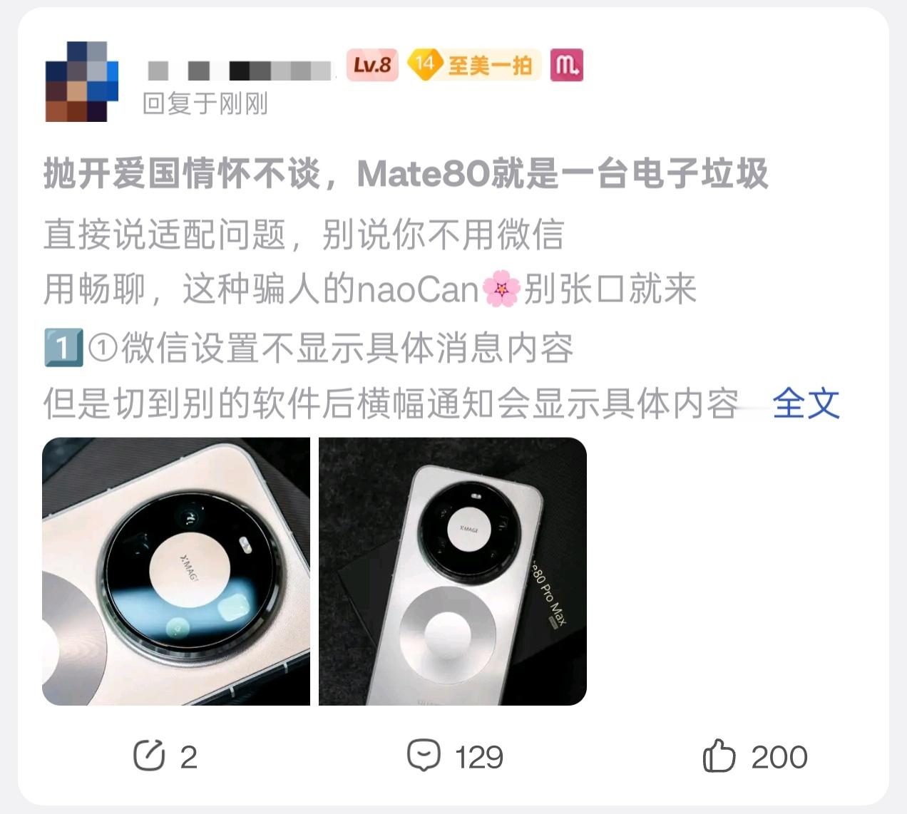 好久没刷贴吧了,打开手机吧一看,一刷好乱。一堆帖子在唱衰华为,或者各种扯淡阴阳怪气的,甚至发表极端暴论的,好像离了华为就活不了了。。。另外一些是其它品牌相关的。不少精华帖打开一看是一两年前的,正经讨论问问题的虽然有,也不少,但是被这些垃圾信息包围,很影响心情。。。这一刷下来,没多少有用信息就算了,看得脑壳疼。。。划了一会儿,受不了关了。