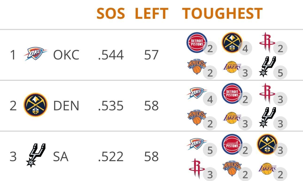 剩余赛程难度,湖人排在联盟第17,与现在的西部前三都还有三场比赛要打,与东部前二活塞、尼克斯也还没有照过面。雷霆、掘金、马刺是剩余赛程难度最高的三支球队。