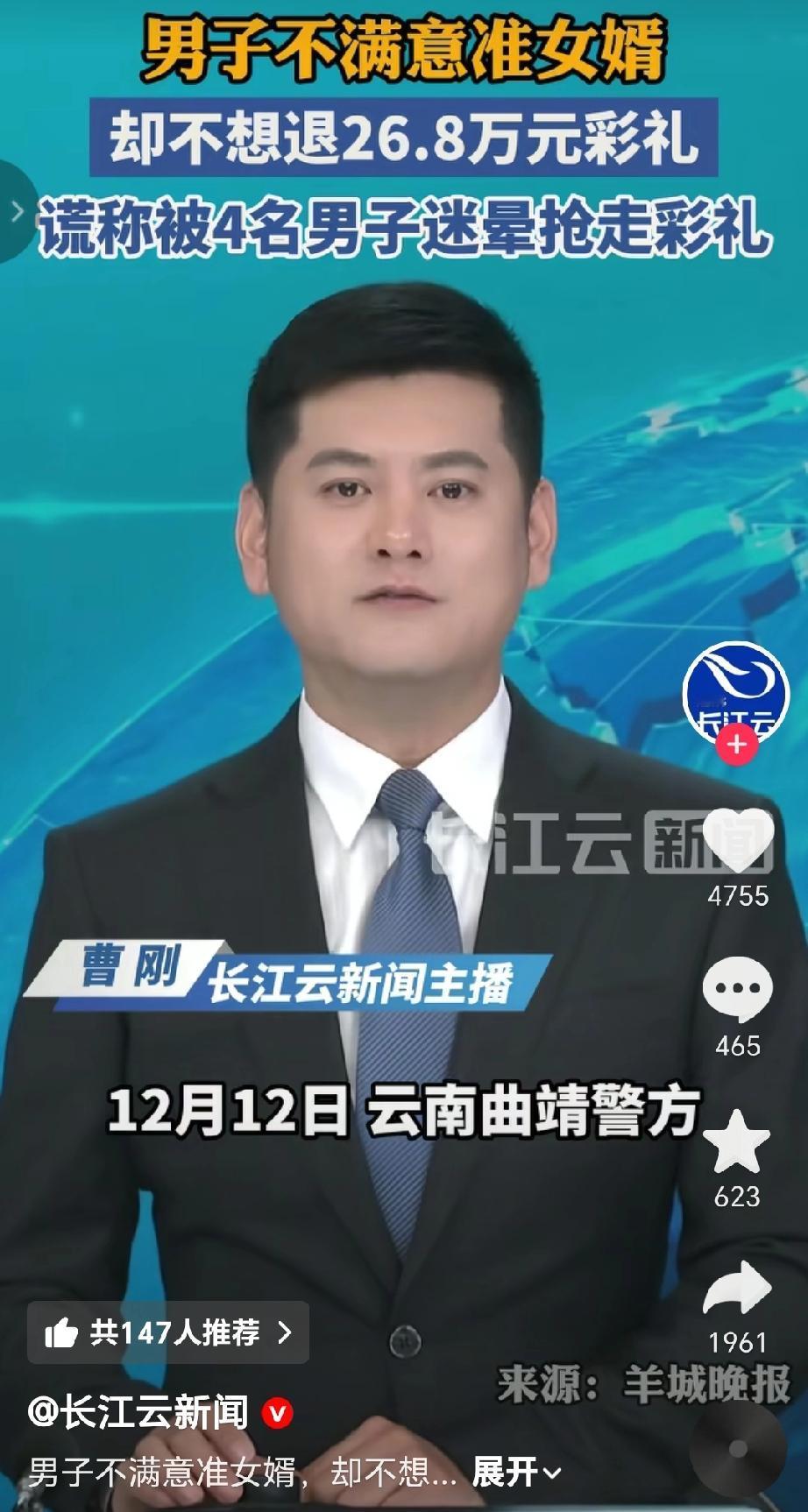 近日云南曲靖一名男子何某因不满意准女婿,又不愿退还26.8万元彩礼,于是报警谎称自己被4名男子用香烟迷晕并抢走这笔现金,报了假警。民警调取监控后发现无人靠近他的车辆,还从他车上搜出了“被劫”的现金。起初何某还嘴硬称不记得事发经过,直到民警表示若钱不是他的就会查扣,他才承认是因为舍不得彩礼,自导自演了这出戏。(来源于@长江云新闻)