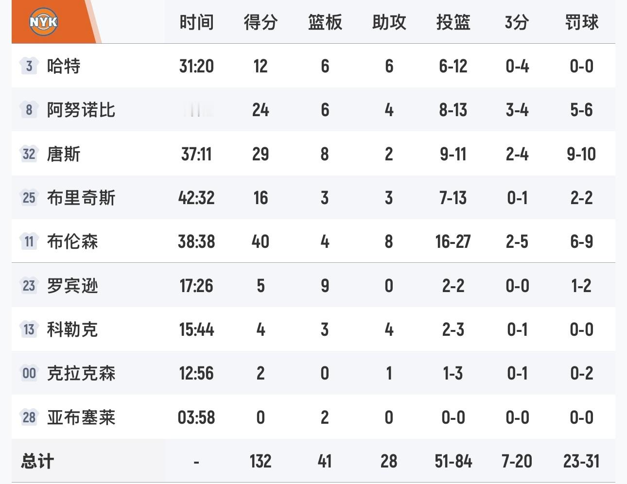 尼克斯132-120魔术,打进杯赛决赛,等待雷霆与马刺的胜者。布伦森独得40分,唐斯29+8,阿努诺比24分6篮板4助攻。