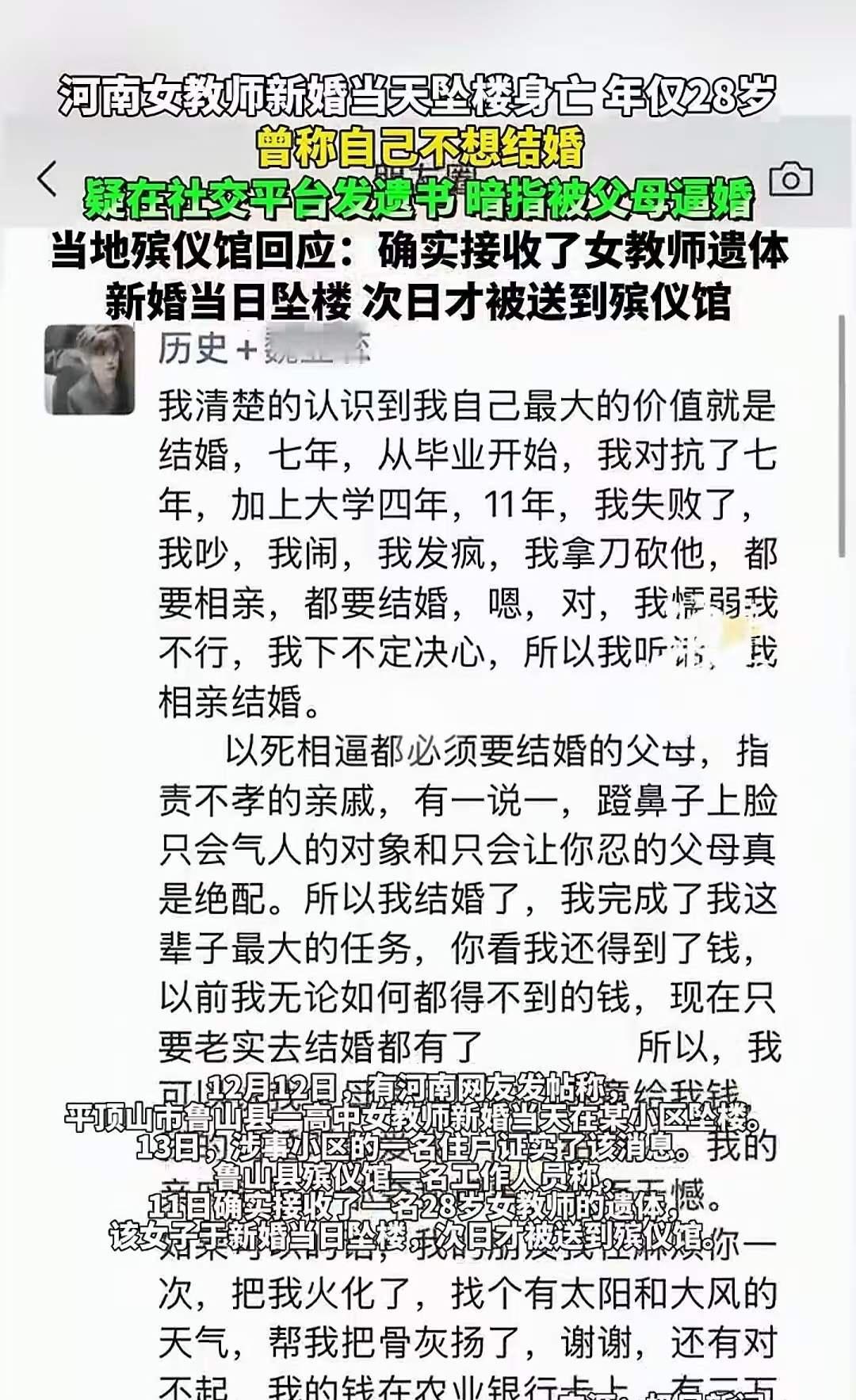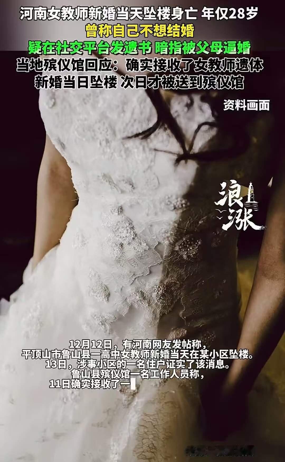 河南女教师新婚当天坠楼身亡,年仅28岁!生前朋友圈曝光:称自己不想结婚,被父母逼婚!网友:虽然死者为大!但结婚当天跳楼,你让男方咋想?定亲,看日子,结婚,又不是一天两天的事,为啥要选择当天…死都不怕,为什么不跑? 这起悲剧像一颗重磅炸弹,瞬间击碎了人们心中对幸福的幻想,也让我们不得不深思:到底是什么样的压力,能让一个年轻的生命在最美好的日子选择了终结?28岁的她,刚刚迎来人生中最重要的时刻,却在结婚当天选择了放弃生命。这背后,或许藏着太多我们难以想象的痛苦与无奈。 朋友圈曝光的那一句“我不想结婚,被父母逼婚”,像是一扇通向许多年轻人心底的门。我们都知道,父母的期待、社会的压力,似乎成了很多人必须面对的“命题”。但为什么有人能坚持下来,有人却在压力山大的环境中崩溃?答案很简单:每个人的内心都不是坚不可摧的城墙。那些看似坚强的人,也许在某一刻,承受不住了。 网友的评论“死都不怕,为什么不跑?”点出了很多年轻人共同的困惑。逃避、反抗、挣扎,似乎都比被逼无奈、被生活压垮要坚强得多。可现实总是残酷的:在父母的期待和社会的眼光下,很多年轻人像是被困在一张看不见的网中,动弹不得。甚至有人会问:在这样的压力下,是否还有一条出路?或者,他们是否早已迷失在所谓的“责任”和“孝顺”里,忘记了自己真正的愿望和幸福。 更令人心碎的是,这样的悲剧不止一个。每一场“逼婚”的背后,都是无数家庭的期待与焦虑。我们不能否认,父母的爱是出于善意,但当爱变成压力时,就变成了伤害。社会的价值观也在悄然改变——婚姻不应成为唯一的归宿,幸福也不应被定义在别人的期待里。可是,为什么总有人要在“看日子”“定亲”“结婚”这些仪式面前,忽略了人生的多样性和个体的选择权? 这起事件像一面镜子,映照出很多家庭、社会甚至我们每个人内心的隐秘角落。也许我们都应该反思:我们是否在无意中,把别人推向了绝路?是否在不经意间,将“责任”变成了“枷锁”?更重要的是,如何让下一代在面对压力时,学会保护自己,学会为自己争取幸福。 生命是如此脆弱,价值却无限。我们不能让任何一个年轻的生命,就这样在最美好的年华里,选择放弃。希望社会、家庭都能给予年轻人更多理解和宽容,让他们在爱与自由中,找到属于自己的幸福。因为,幸福不应该成为压力的代价,更不应该成为生命的终点。新婚跳楼 青年跳楼 女生坠楼