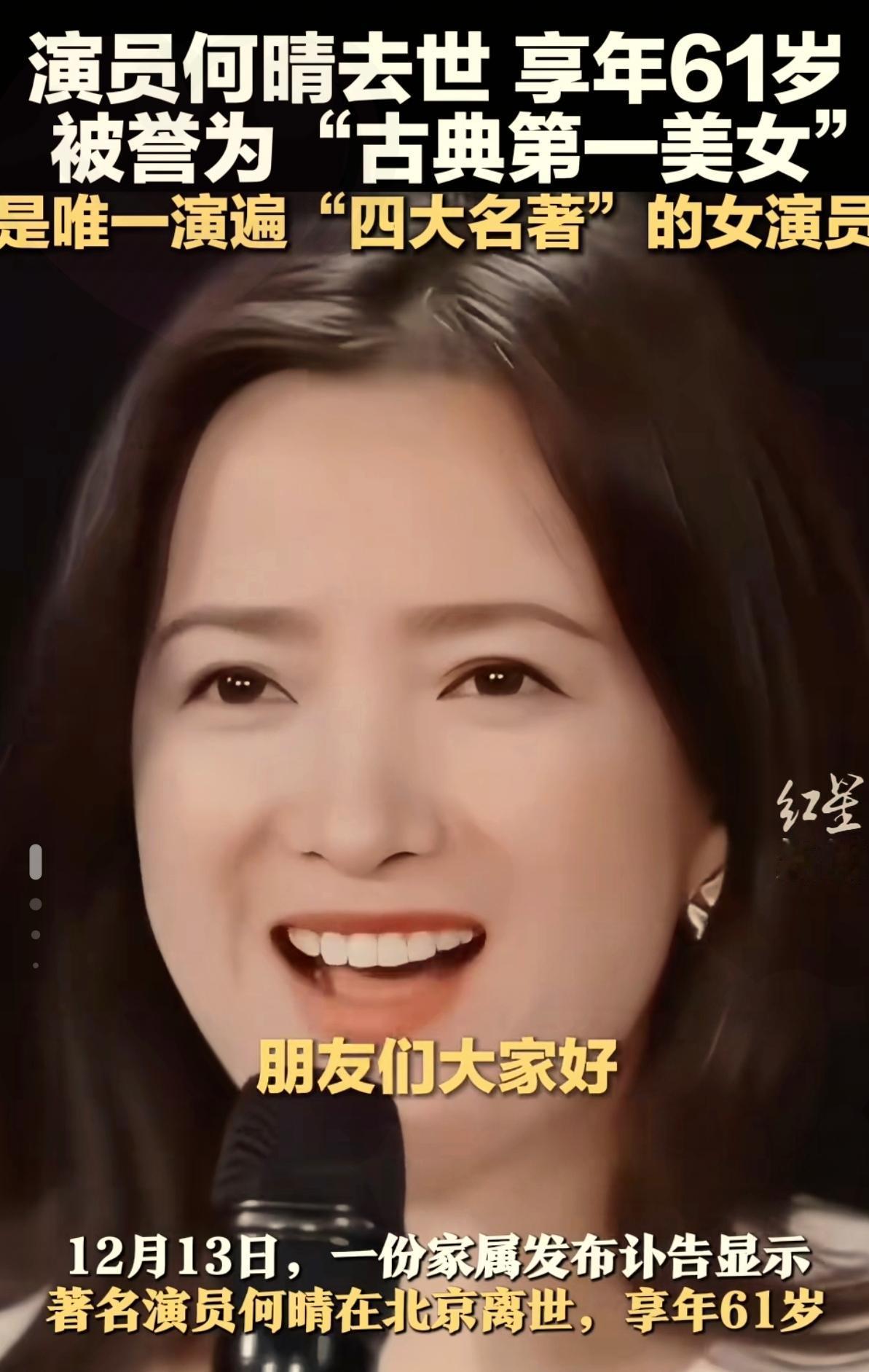 看到何晴离世的消息,我真的愣了好久,就像朱媛媛突然离开时那样不敢置信,那个演遍四大名著的“古典第一美人”,怎么就这么走了? 61岁的年纪,明明今年还有面色红润的近照流出,谁能想到背后藏着十年抗癌的隐忍。2015年确诊脑瘤后,7小时开颅手术、短暂失语瘦到脱相,她都没喊过苦,还坚持复出拍戏,这份坚强真的太让人动容。 她的美从不是表面功夫,而是刻在骨子里的古典韵味,怜怜的灵动、秦可卿的幽怨、小乔的温婉、李师师的聪慧,每个角色都成了一代人的青春印记。其实生命的精彩从不在长度,何晴用角色留下了永恒的美好这就够了。 你对何晴哪个经典角色印象最深?来评论区说说你的青春回忆吧~何晴照片 何晴古装戏