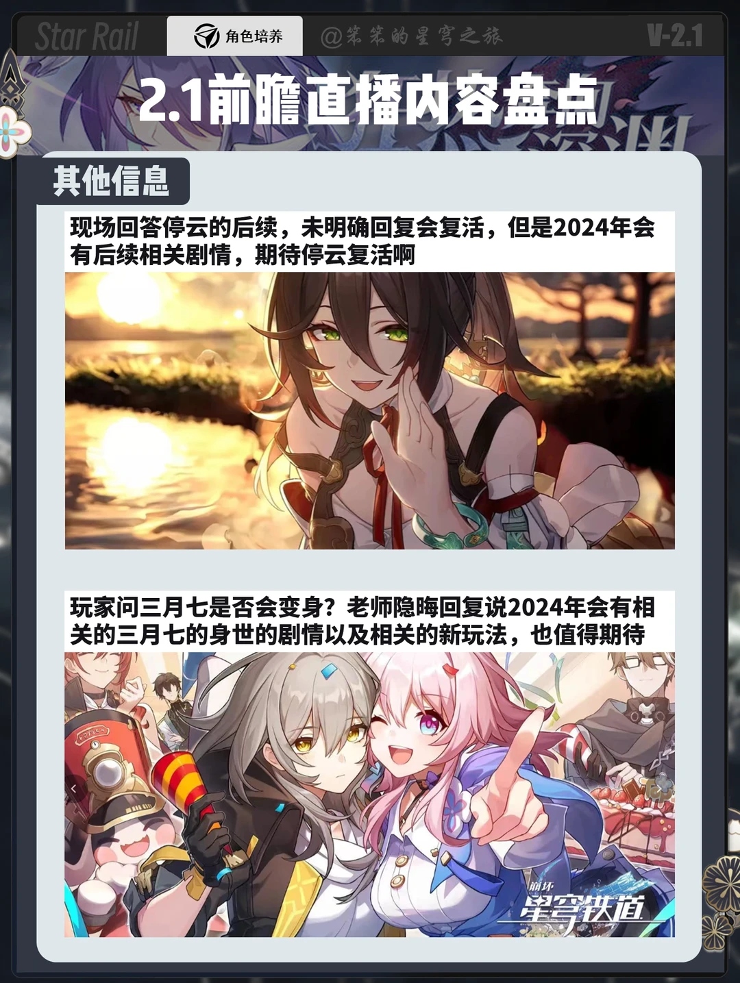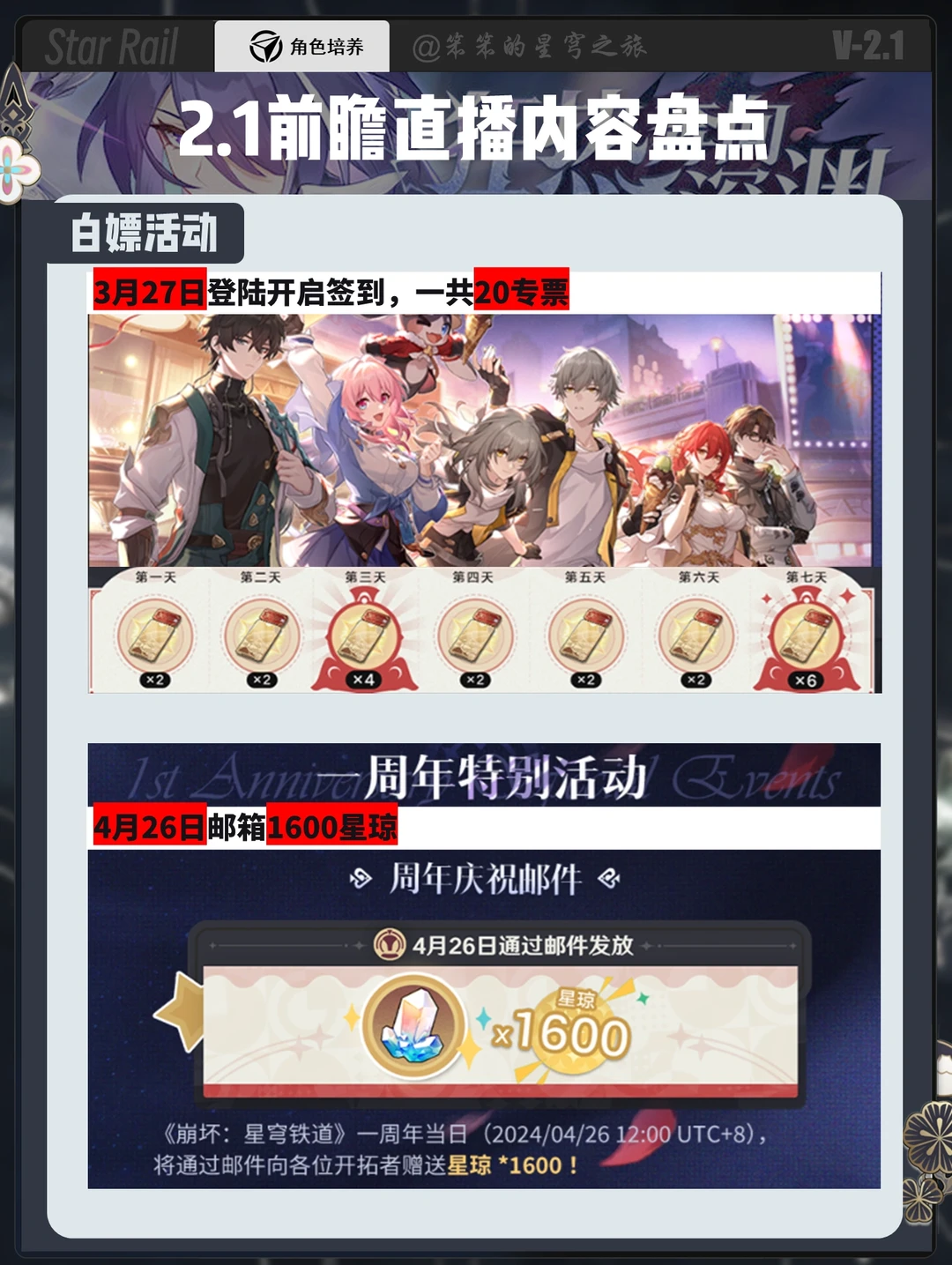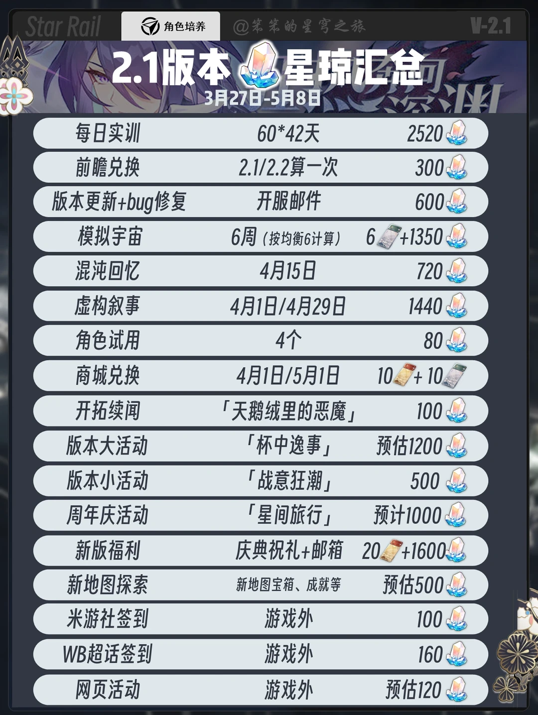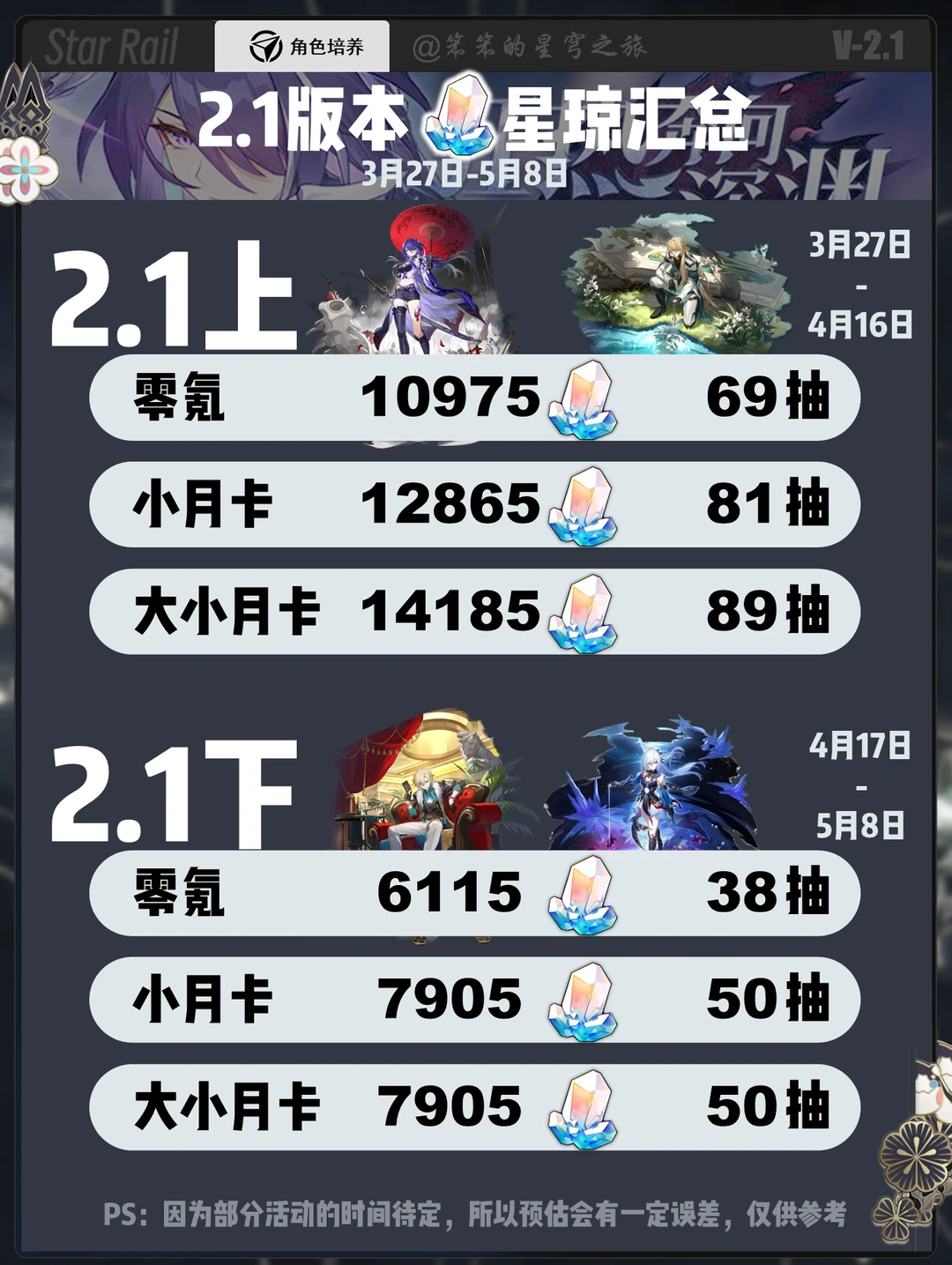 🐱大家好,我是笨笨 今晚的2.1前瞻直播大家都看了吗 一周年的活动还是很劲爆的 白嫖30抽+一系列的线上线下活动 这2.0是一刻都呆不下去了 -------------------------- 👉笨笨盘点了2.1可以获取的星琼 零氪玩家可以获取107抽 小月卡可以获取131抽 大月卡玩家可以获取139抽 💡以上仅为预估,方便大家抽卡统计哦 实际以游戏内活动为准