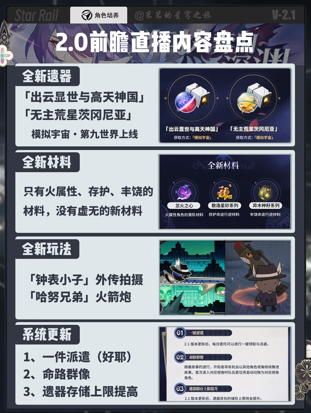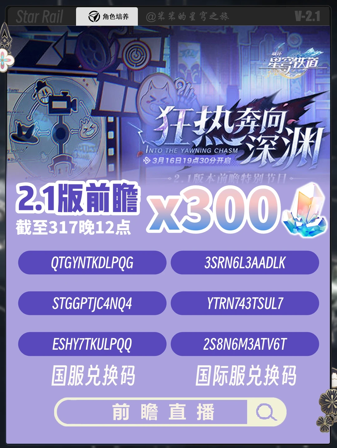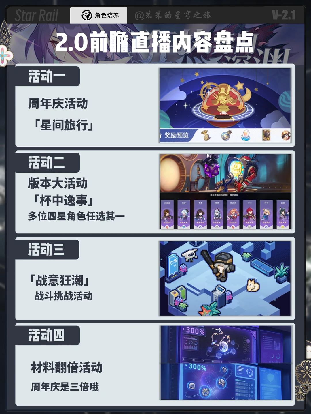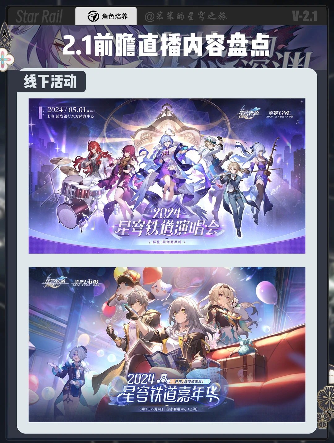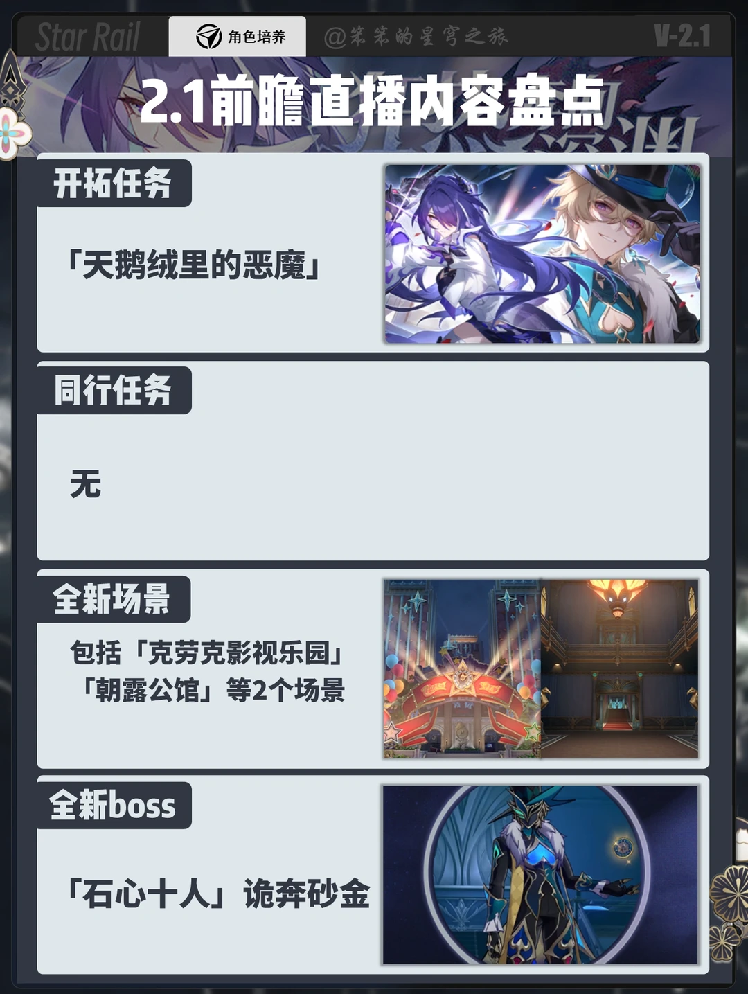 🐱大家好,我是笨笨 今晚的2.1前瞻直播大家都看了吗 一周年的活动还是很劲爆的 白嫖30抽+一系列的线上线下活动 这2.0是一刻都呆不下去了 -------------------------- 👉笨笨盘点了2.1可以获取的星琼 零氪玩家可以获取107抽 小月卡可以获取131抽 大月卡玩家可以获取139抽 💡以上仅为预估,方便大家抽卡统计哦 实际以游戏内活动为准
