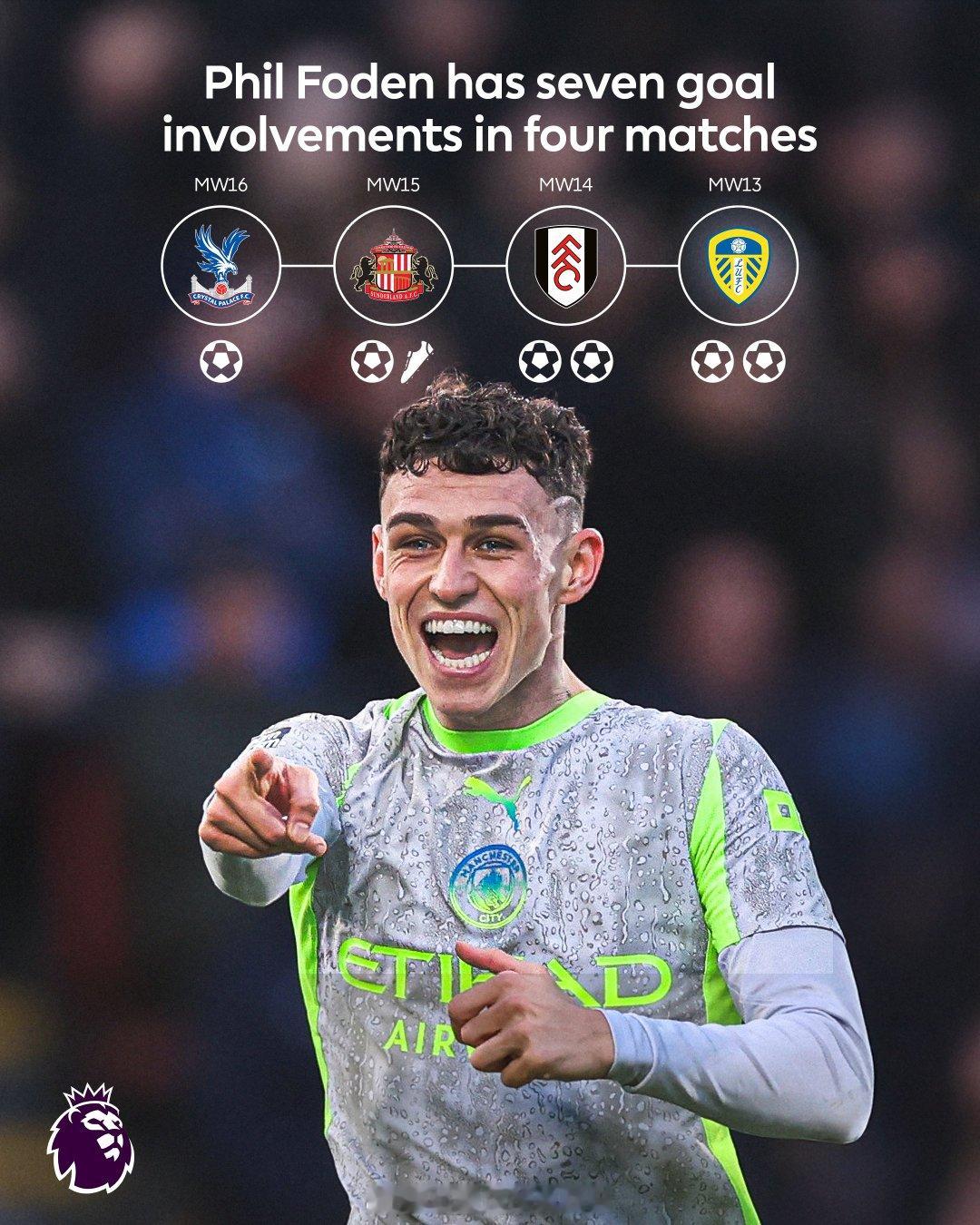 【福登状态大爆发】曼城最近4场联赛取得四连胜,一共打进14球。其中,福登连续四场