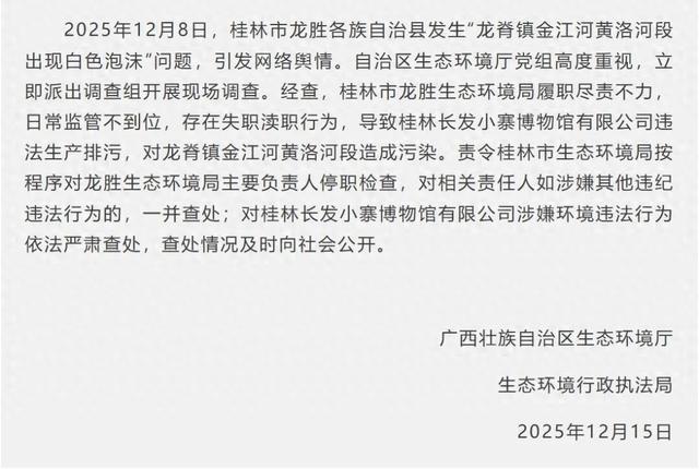 通报称,2025年12月8日,桂林市龙胜各族自治县发生“龙脊镇金江河黄洛河段出现白色泡沫”问题,引发网络舆情。自治区生态环境厅党组高度重视,立即派出调查组开展现场调查。经查,桂林市龙胜生态环境局履职尽责不力,日常监管不到位,存在失职渎职行为,导致桂林长发小寨博物馆有限公司违法生产排污,对龙脊镇金江河黄洛河段造成污染。责令桂林市生态环境局按程序对龙胜生态环境局主要负责人停职检查,对相关责任人如涉嫌其他违纪违法行为的,一并查处;对桂林长发小寨博物馆有限公司涉嫌环境违法行为依法严肃查处,查处情况及时向社会公开。