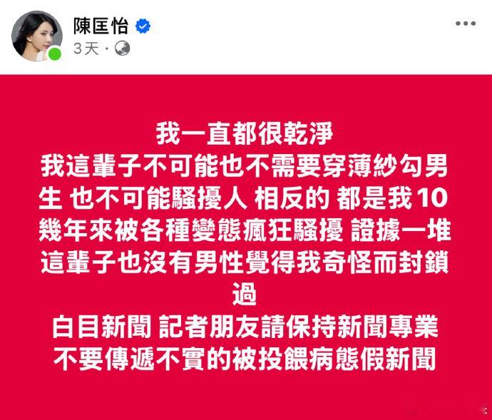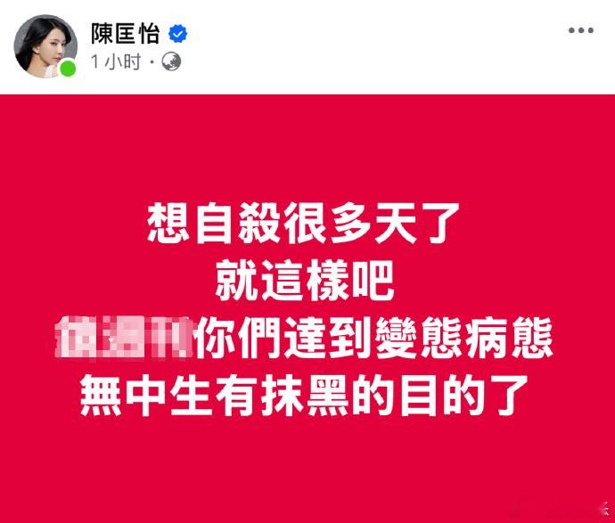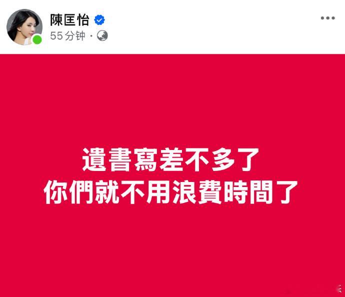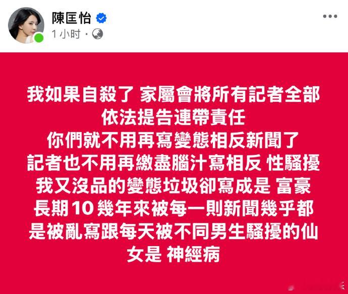 陈匡怡发文陈匡怡 遗书写差不多了 近日,台媒指陈匡怡穿“薄纱勾引大学学长”引发系列热议,对此,陈匡怡发文强烈否认,称自己十余年被各种变态疯狂骚扰,希望媒体不要传递不实消息。15日,陈匡怡在社交平台连续发文,喊话台媒,疑似想要轻生。据悉,陈匡怡曾出演《我可能不会爱你》、剧版《小时代》等作品,此前她还自曝陈柏霖、张孝全都有追求过她,但并未追求成功。