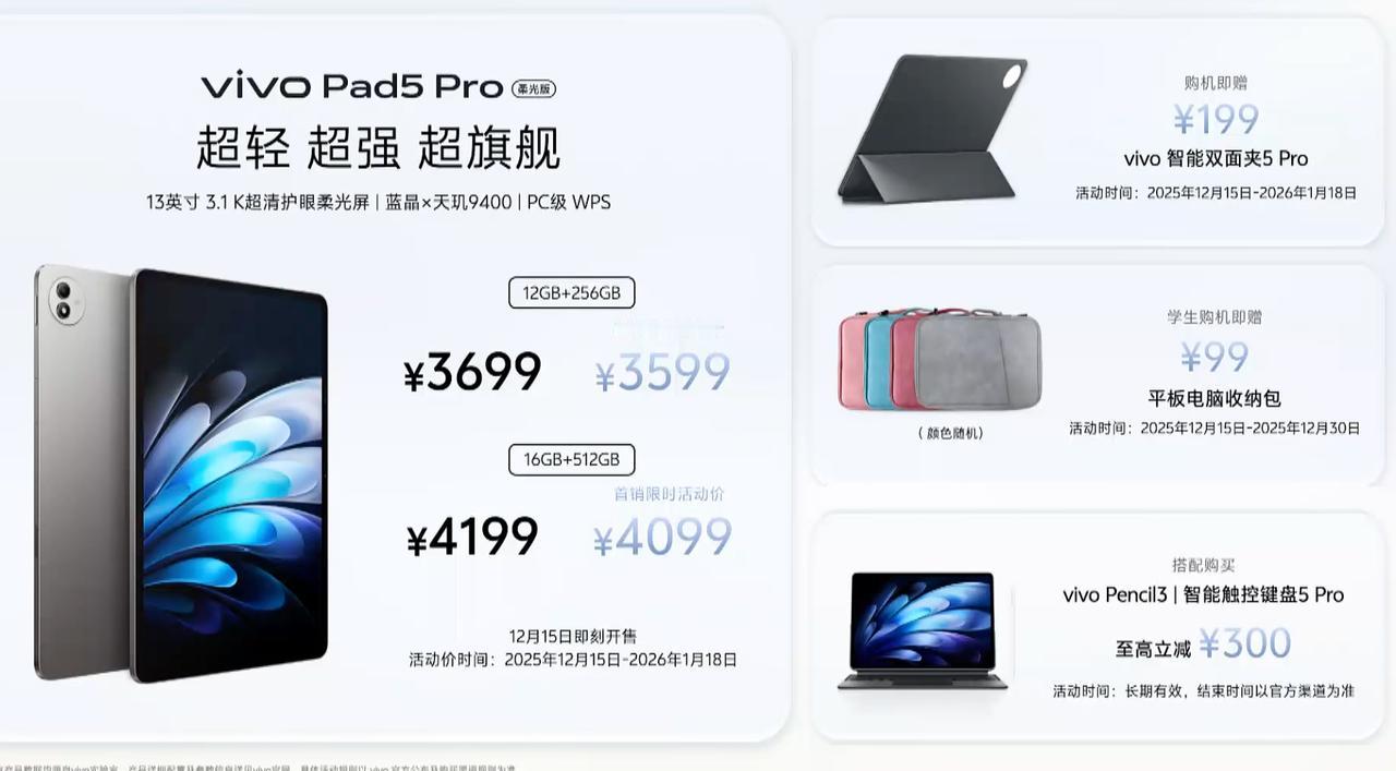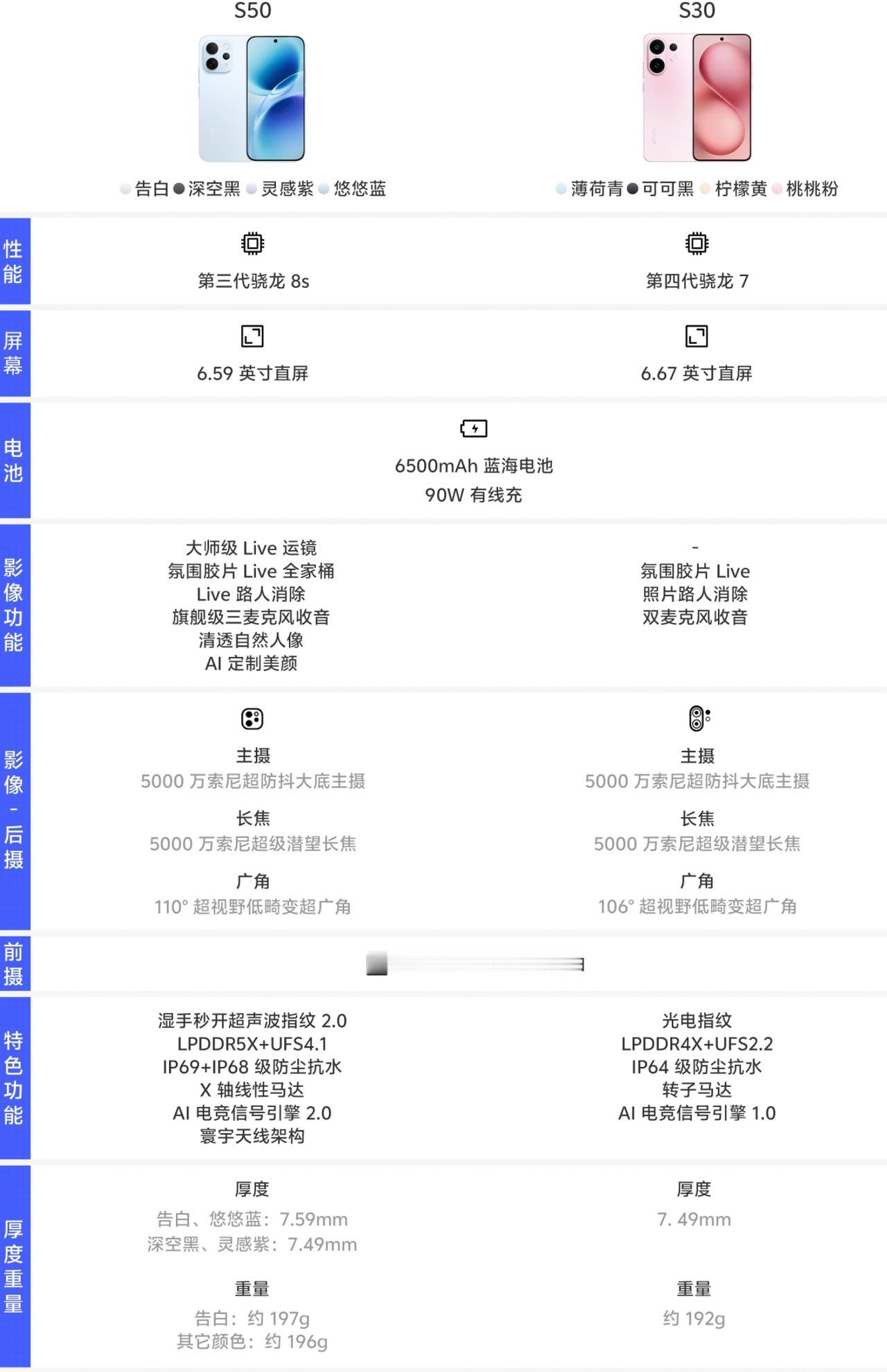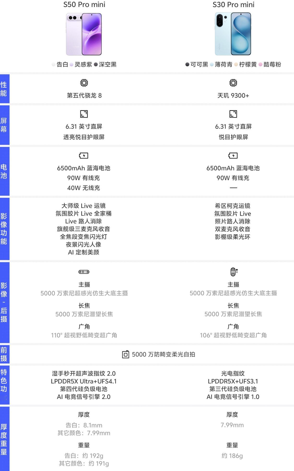 vivo S50(骁龙8s gen3) 12+256GB 2999元 12+512GB 3299元 16+512GB 3599元 vivo S50 Pro mini(骁龙8 Gen5) 12+256GB 3699元 12+512GB 3999元 16+512GB 4299元 vivo Pad5 Pro柔光版(天玑9400) 12+256GB 3599元 16+512GB 4099元