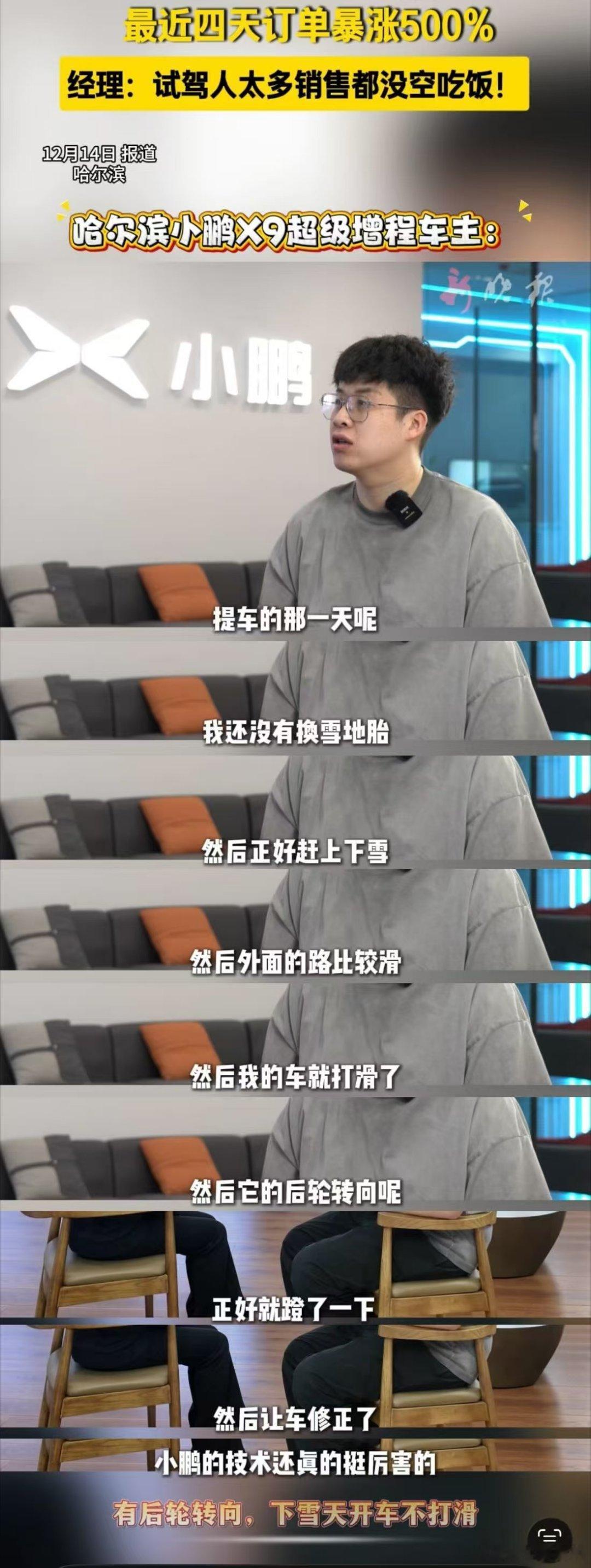 小鹏X9超级增程试驾火爆销售没空吃饭小鹏X9超级增程在哈尔滨卖爆了!哈尔滨一门店订单量在4天内增长超500%,试驾火爆到门店销售午饭都顾不上吃。并且,用户购买决策非常果断,50%用户试驾完在现场即完成下定。50%用户试驾完小鹏X9超级增程当场下定已提车车主表示,1602km综合续航足够长,非常适合全家人出行;超450公里的纯电续航,足够日常市区通勤需求,下雪天有了后轮转向也不怕打滑。小鹏X9超级增程在北方市场的订单占比已超过50%,超长续航、冰雪稳行系统、后轮转向等精准应对了北方用户在冬季出行中对续航、安全与操控的需求。