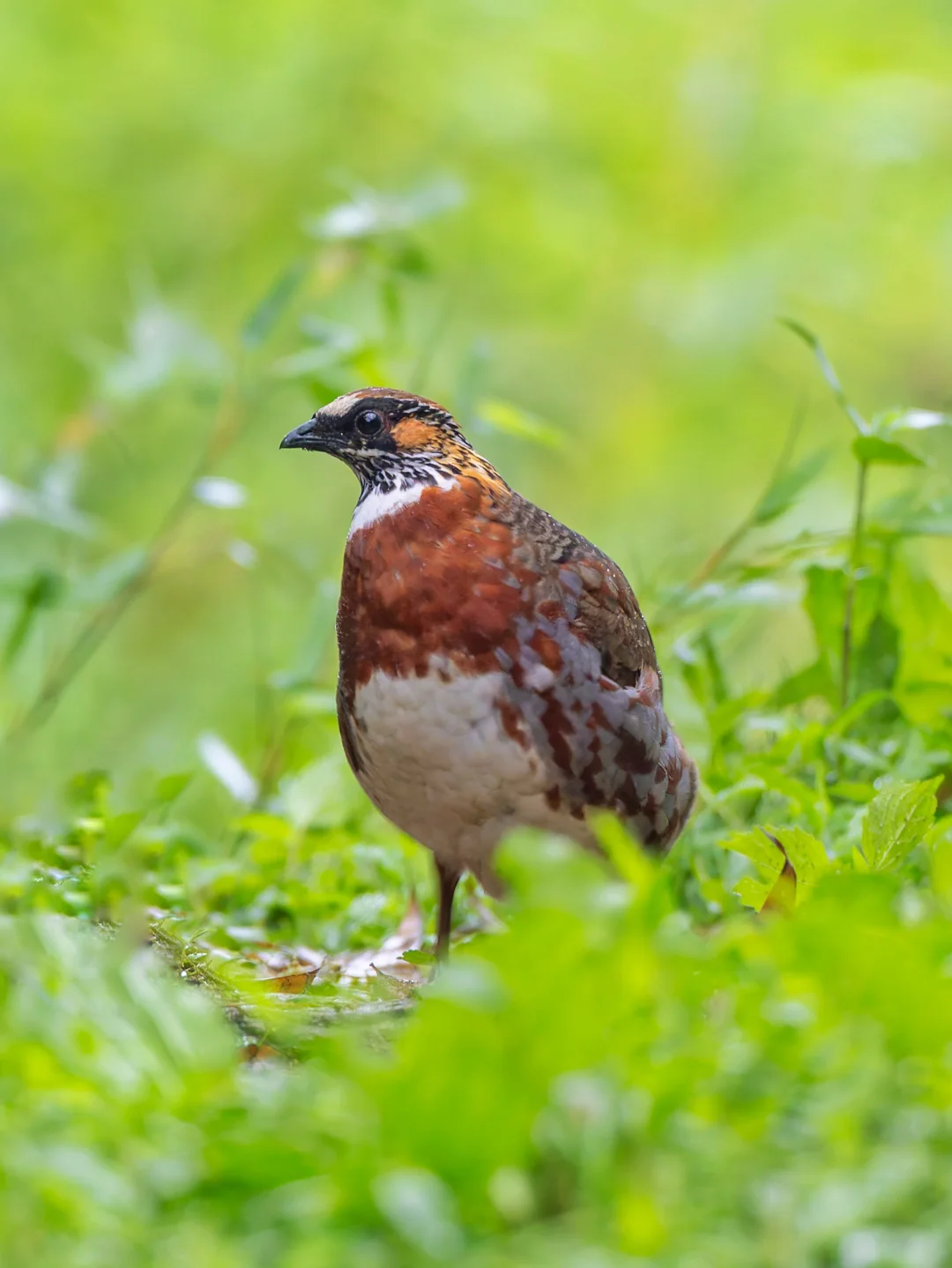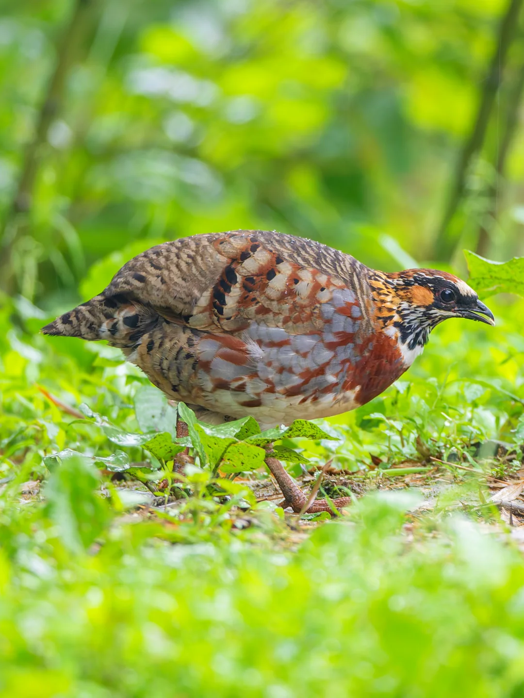 原创拍摄于2025.06 四川山鹧鸪,Sichuan Partridge,鸡形目雉科山鹧鸪属。中国特有种,国家一级保护动物,濒危,只分布于中国四川南部到云南东北部的部分地区,在分布地十分难见到。 雄鸟喉部是白色的,具有宽阔的栗色胸带,胸部图案独特。有一点狭窄白色眉纹,前额也是白色,冠羽红褐色带黑色条纹。眼周黑色,耳羽橙红色,两胁有一些蓝灰色。 在下着细雨的高山森林中,突然从林子里走出来,实在是太漂亮了。
