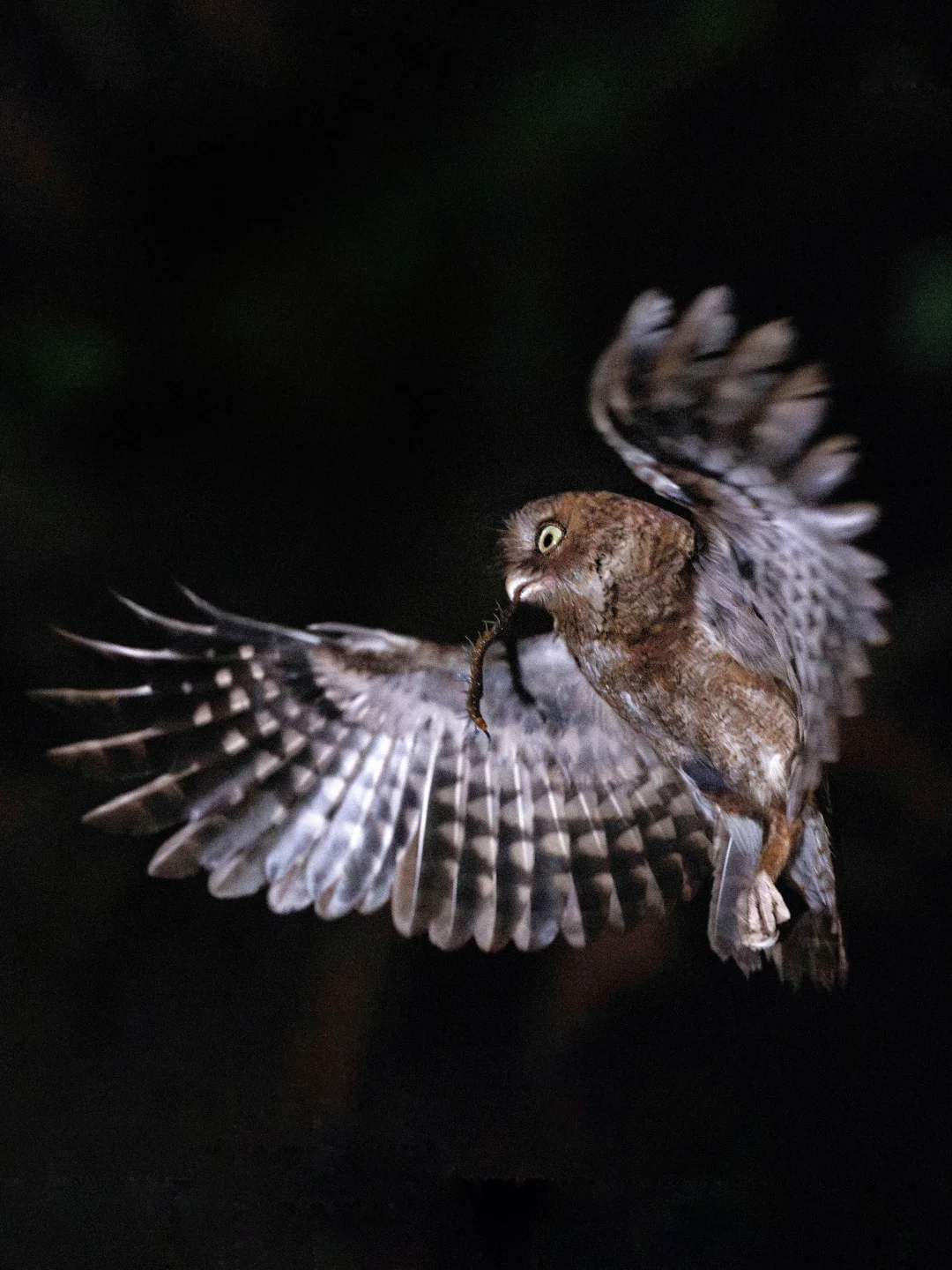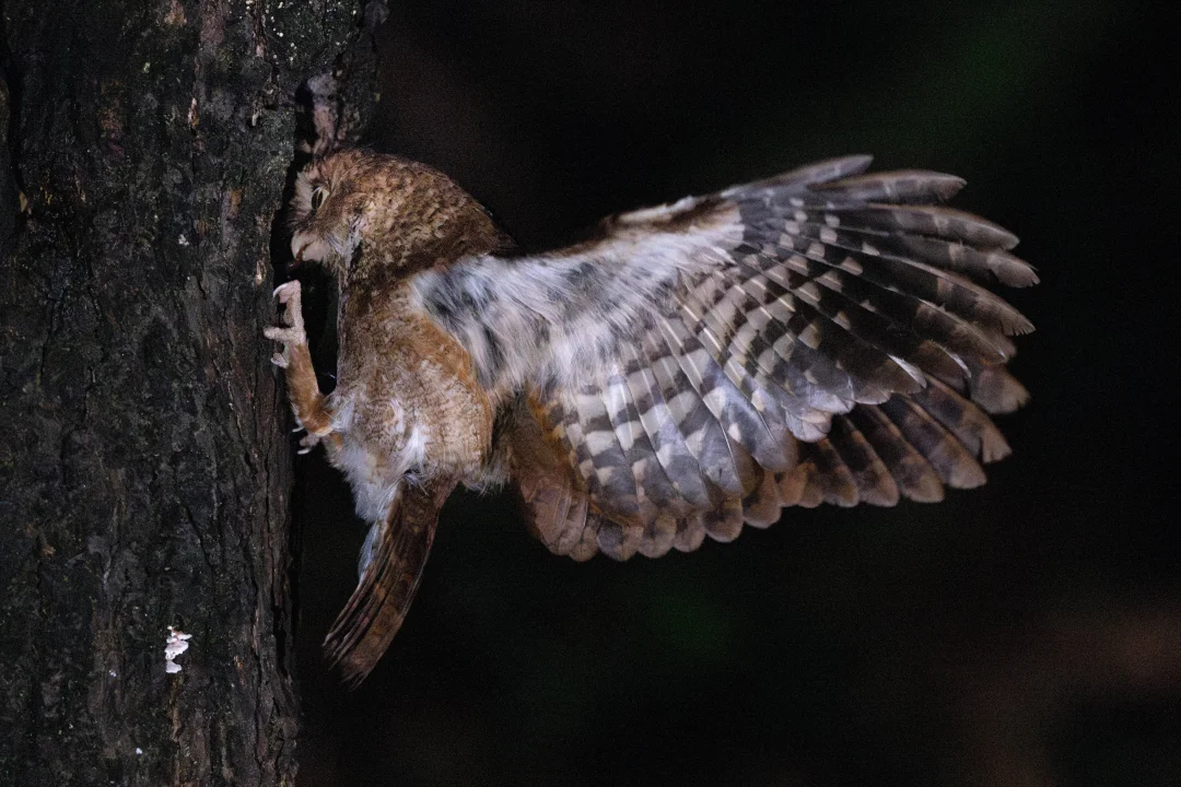 以前多次在广东海南江西的森林里听到叫声,也目击过多次,其实我只想要一个正面的可爱呆板。没想到这次倒抓拍到夜间黄嘴角鸮捕获了大蜈蚣回巢喂食的飞版动作,没想到猫头鹰小小的身体,那对悄无声息的翅膀张开这么帅气。感谢1/1000秒的快门和超高的iso😂。