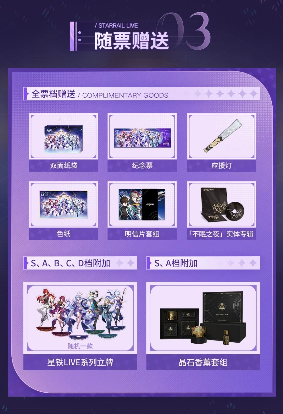 3、S及A级票档随票赠送的晶石香薰套组由于重量较重,后续将通过邮寄形式寄送,收件地址收集规则请等待官方后续通知。