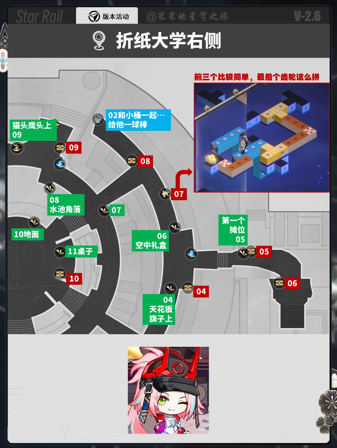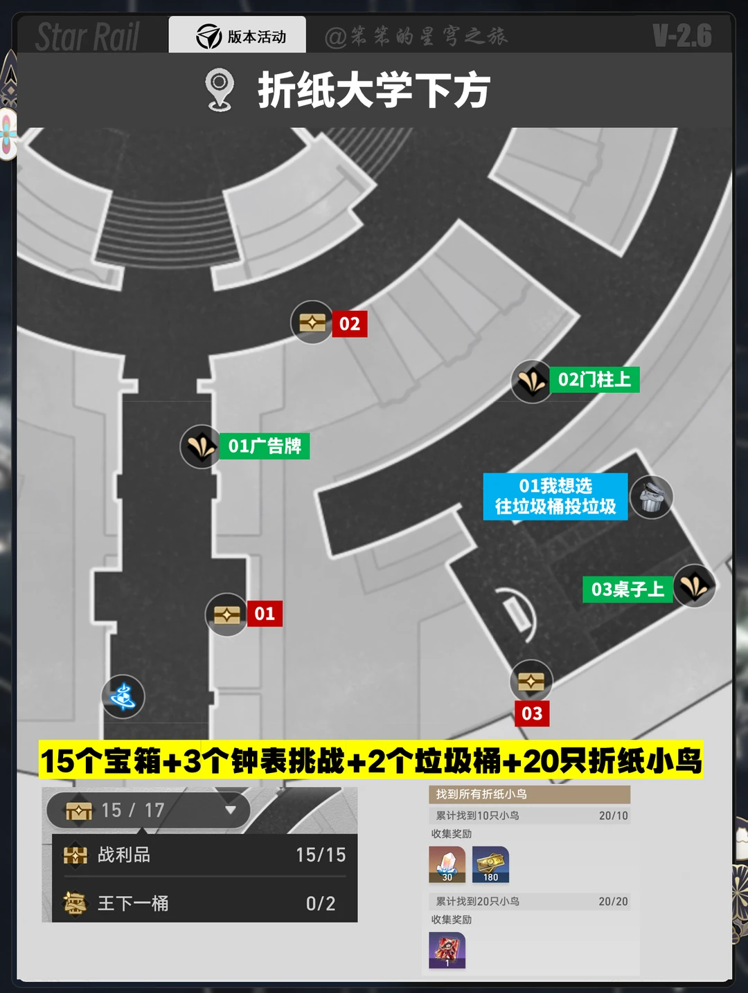 🐱大家好,我是笨笨的铲屎官 今天给大家带来的是新地图的宝箱攻略 一共15个宝箱+3个钟表挑战 +2个垃圾桶+20只折纸小鸟 👉垃圾桶需要在完成主线剧情后才会出现哦