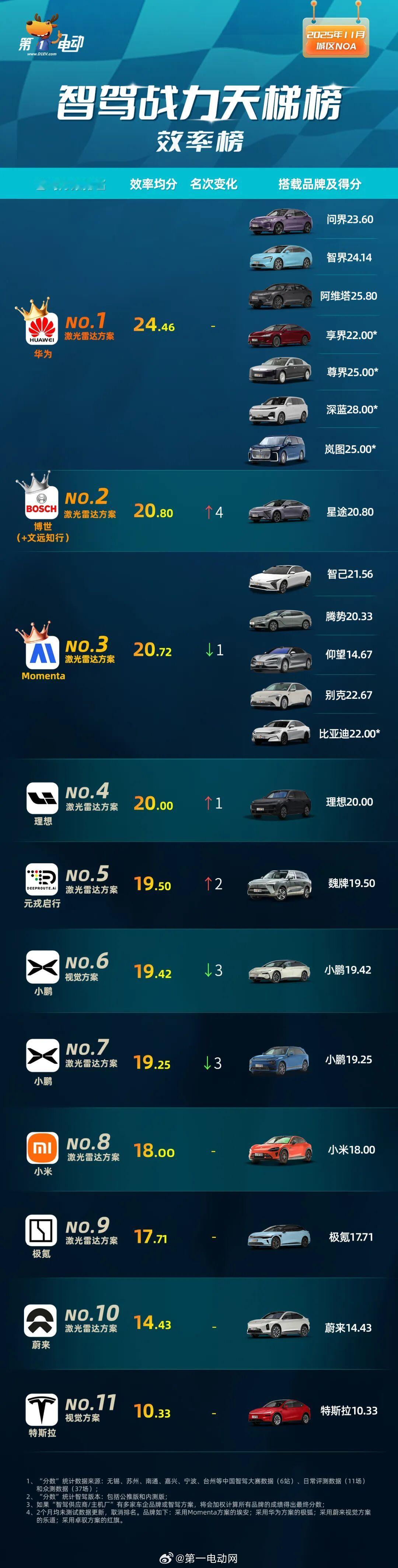 第二届智驾大赛中国智驾战力天梯榜 11月效率榜 · 华为效率领先,特斯拉垫底困境未解第三个细分榜单,聚焦智驾系统在保证安全的前提下通勤效率的效率榜(满分30分)第二届中国智驾大赛 核心结果:华为以24.46分蝉联效率榜第一,虽分数微降,但领先第二名的优势仍高达3.66分,通行效率优势明显。博世(+文远知行)以20.8分微超Momenta,升至第二。特斯拉则下滑2.5分,以10.33分再次垫底,未按导航行驶、红绿灯误判等基础问题依然严重。华为乾崑智驾 关键动态:普遍波动:多数品牌效率分出现下滑,表明在提升效率与保障安全之间取得平衡并非易事。小米进步:小米效率分增长0.89分,结合其场景、安全榜的稳定表现,综合能力呈上升趋势。效率榜反映了各系统在真实路况下的“老司机”程度。目前看,在坚守安全底线的前提下,整体通行效率仍有巨大的优化空间。小米汽车Momenta特斯拉FSD自动驾驶