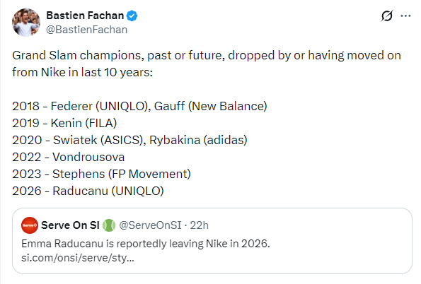 N家展示阿卡在澳网2026 的球衣,看到这位模特的发型,我笑了与此同时,坊间传闻拉杜卡努在2026赛季将与N家拗断,转投UE库门下(我也不知道为啥要把这两件事搁一块儿说)。然后推上就有博主盘点了一下近年来从N家网球线出走的大满贯冠军——高芙、肯宁、斯瓦泰克、莱巴金娜、万卓索娃,这么一看是各种走宝啊。。。突然发现,要是N家对网球线重视一点,本赛季WTA年终前五,原本都可以是他们旗下的诶。。。