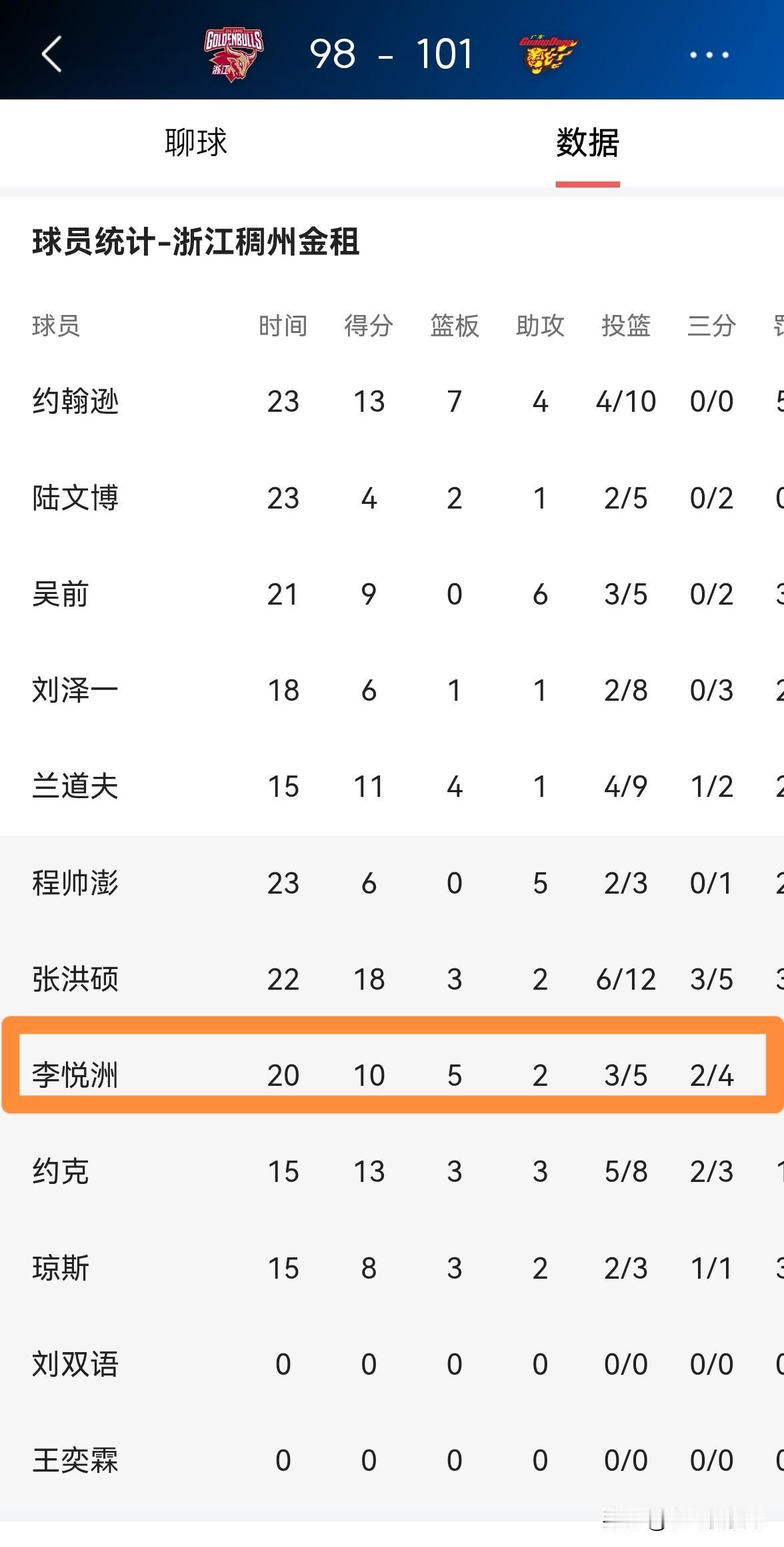 浙江稠州金租小将李悦洲真是一鸣惊人!在今天浙江稠州金租主场以98:101不敌广东东阳光的比赛中,18岁的李悦洲迎来了CBA生涯的首场比赛并发挥惊艳。 全场比赛下来,李悦洲替补出战20分钟,投篮5中3,其中三分球4中2、罚球2中2非常高效的得到10分5篮板2助攻,他的场上正负值为全队最高的+10。 用“一鸣惊人”来形容李悦洲的CBA首秀真是太恰当了,他的身上散发着青春、能量和无限可能。