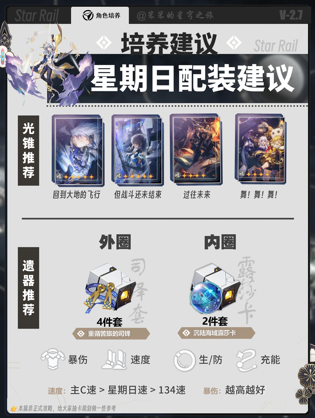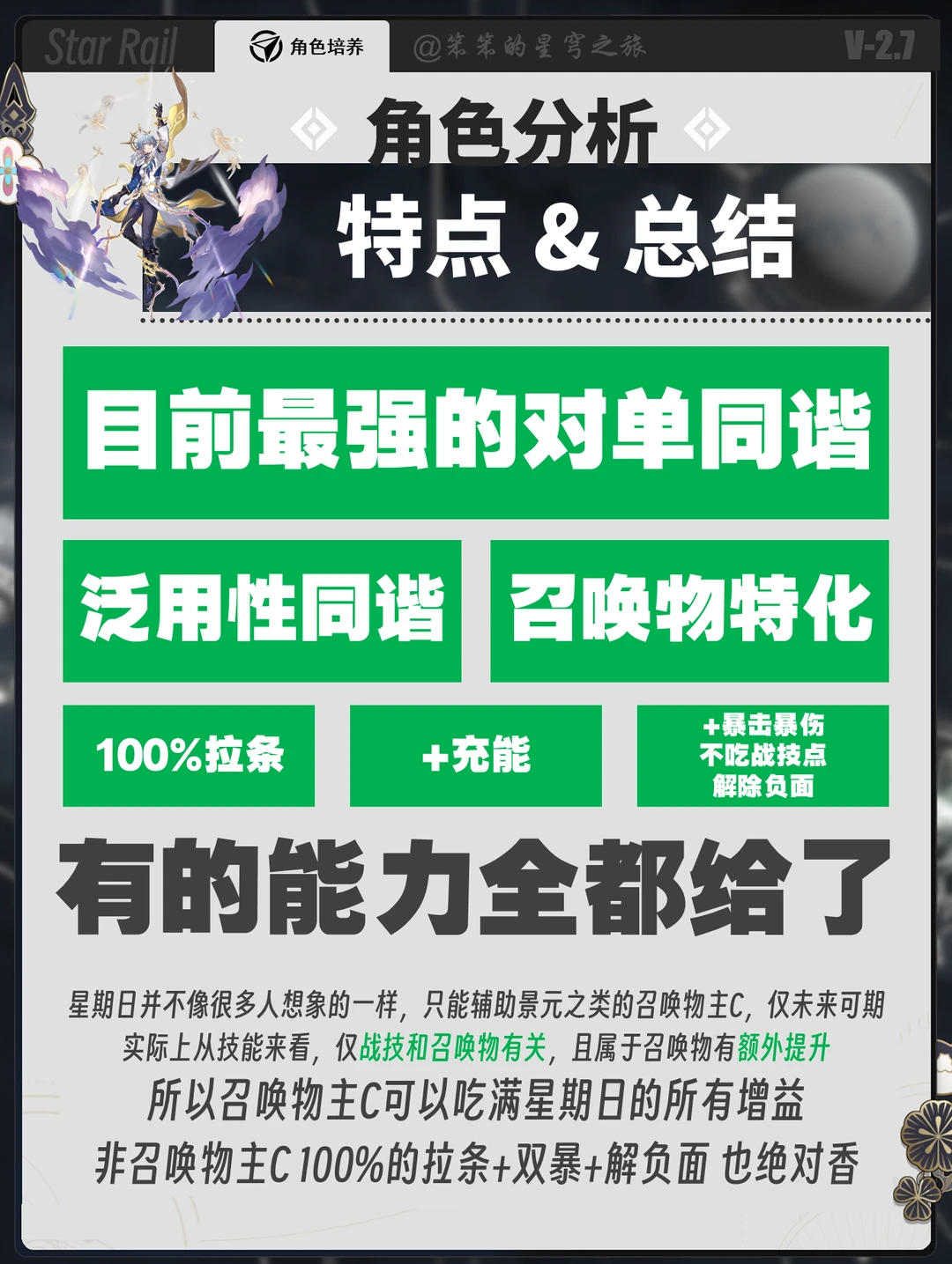 🐱大家好,我是笨笨的铲屎官 今天给大家带来的是星期日的抽取推荐 内容来自创作体验服,具体以上线为准 ---------------------------------- 前瞻的时候以为星期日会是召唤物特化辅助 测试发现确实是的 但是除此之外,泛用性也特别强 只要是单C输出,基本上都可以辅助 100%的拉条+充能+各项能力 基本上属于鸭鸭的绝对上位 强烈推荐抽取并培养
