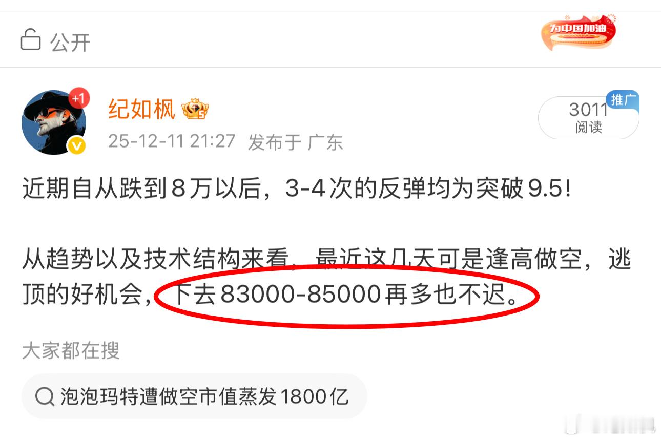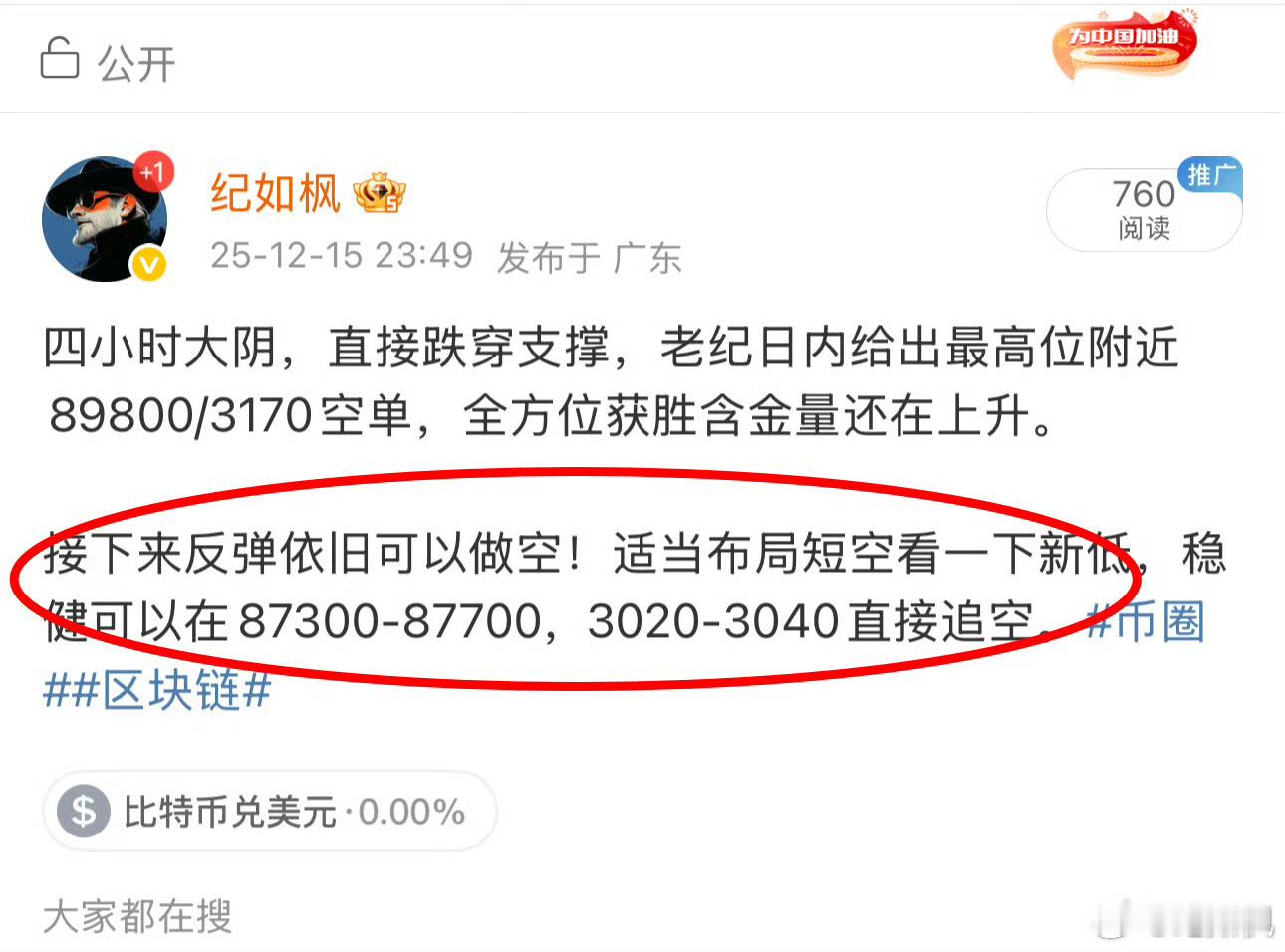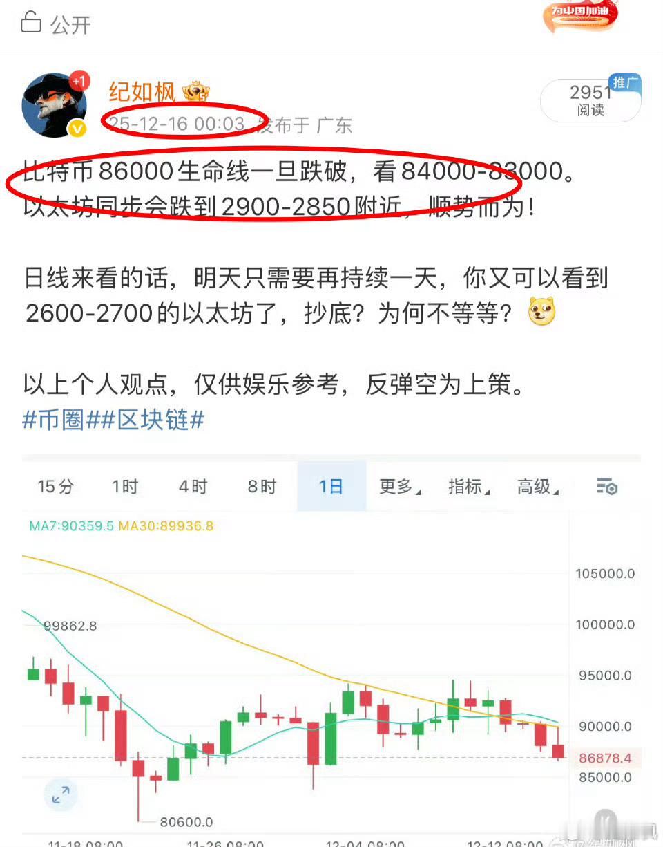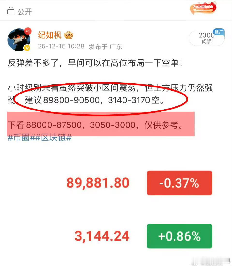 回顾一下近期的布局,美联储降息之前老纪是给出了多箪思路,先看94500和3430,最终都有给到。并在93600和3420反手给出顶级逃顶空箪,以及后续这两天90700-91300追空,周末提醒90500附近追空,还有昨天89800和87300两次再追空,整体思路都是做空为主,事实也验证了老纪的判断。换句话说,我老纪从93600/3420一路空下来,昨晚跌到85000/2890,大饼将近8000空间,以太坊随便也有500点了,也是提醒要抄底再等等,你等了吗?币圈区块链